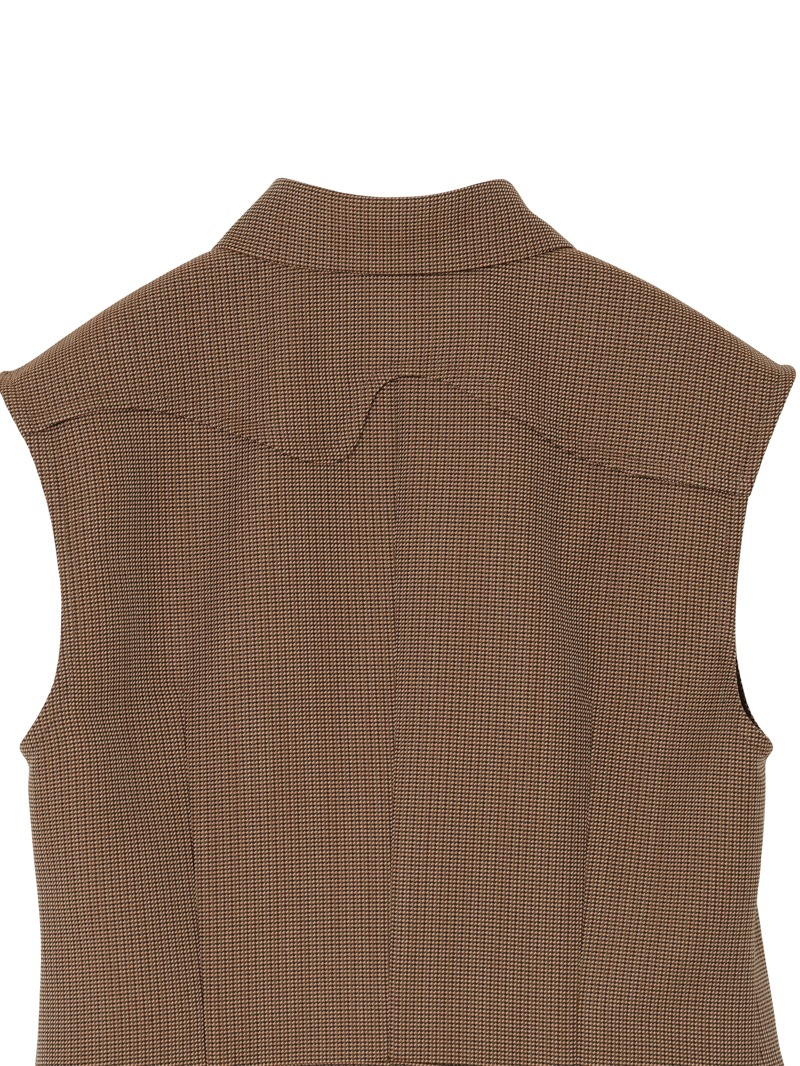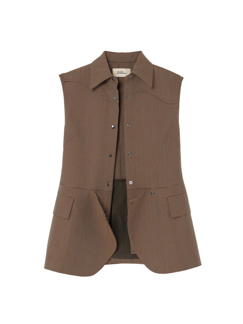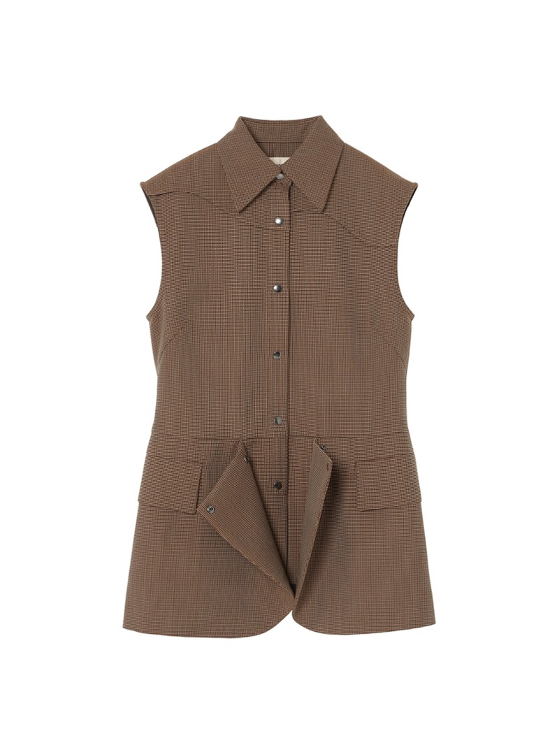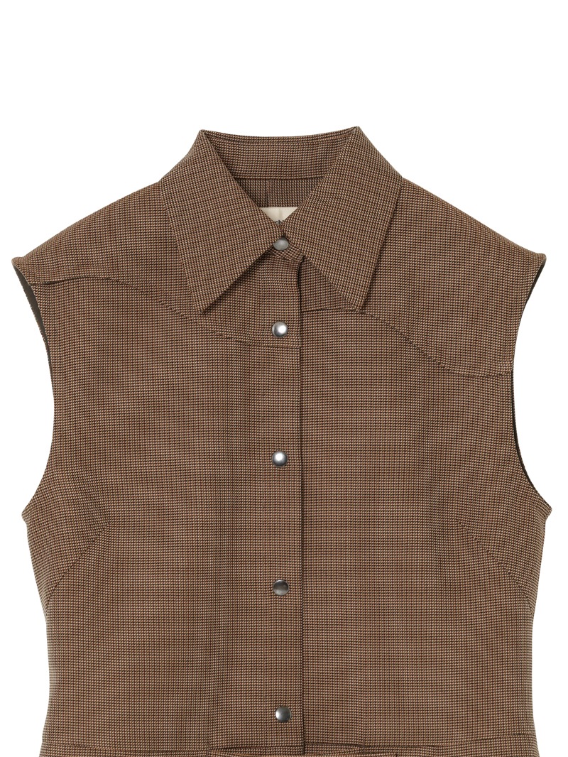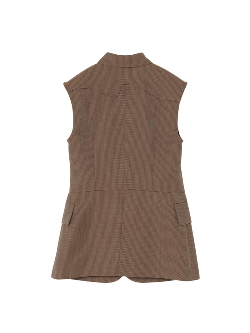 メンズライクなウール混素材を使用した細やかなチェックのノースリーブジャケット。70年代のアートやカルチャーをイメージさせる大きめの襟、美しい曲線の切り替えがポイント。レイヤードすることで長いシーズン着まわせる一着です。同素材のパンツと合わせてセットアップとして着用可能。