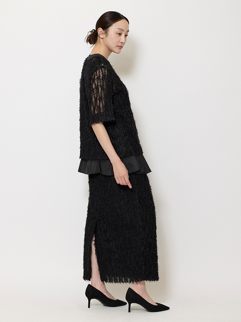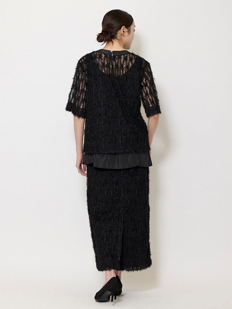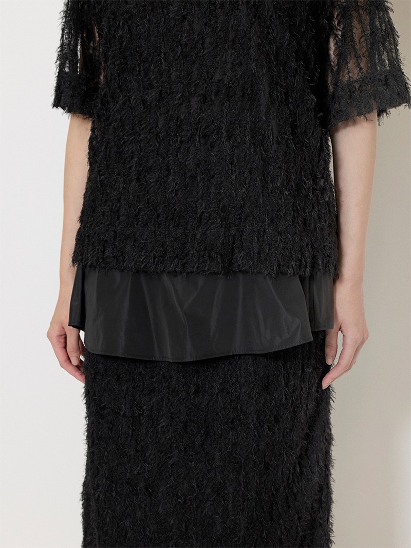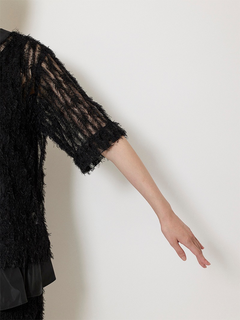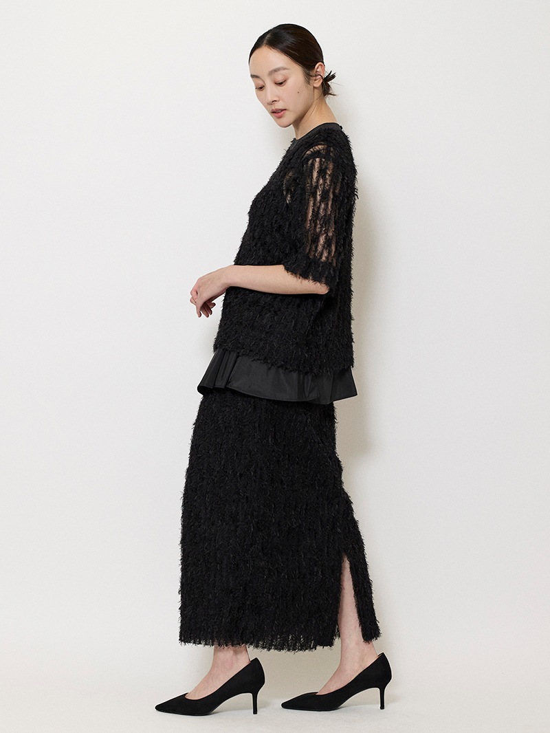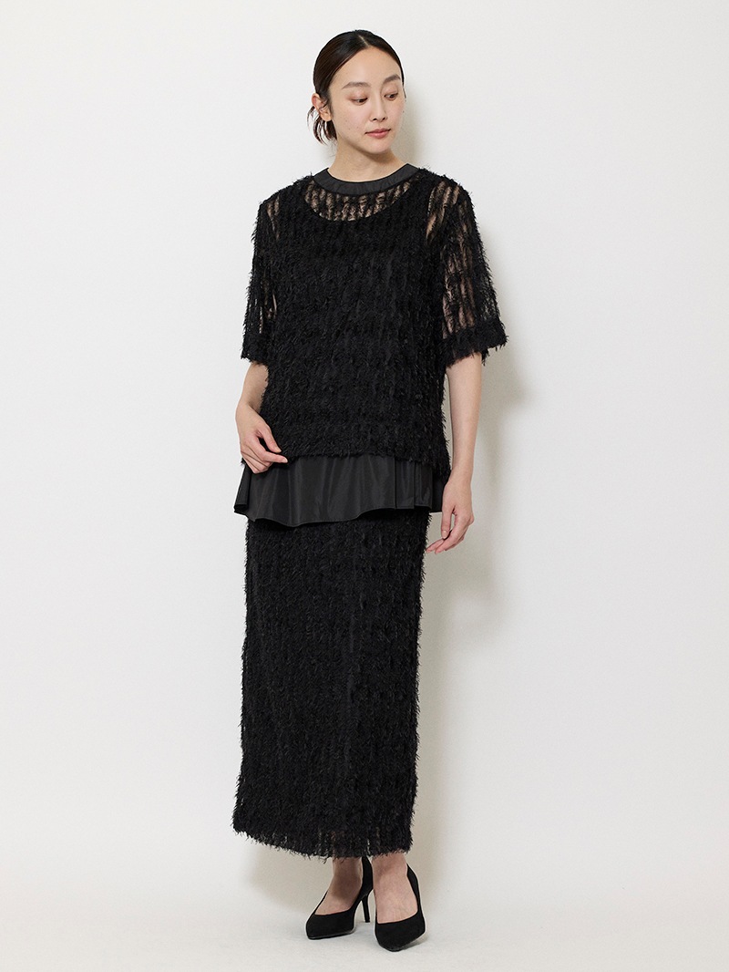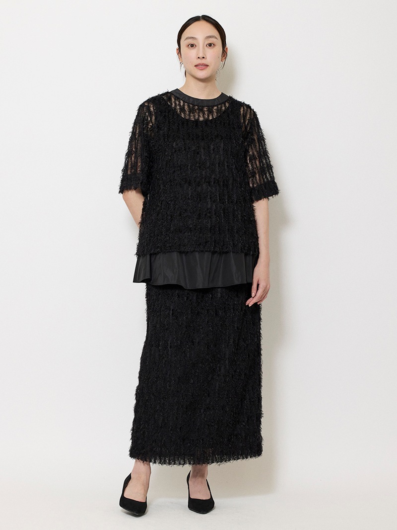 イタリア製のインテッサ素材を使用したレイヤードプルオーバー。フリンジのように見えるチュールのカットジャガードに、マットな光沢のあるタフタ素材のインナーは、レイヤードスタイルを楽しめるように少し丈を長めに設定。 同素材のスカートと合わせてセットアップとして着用可能。上品な華やかさがあるので、旅行先でのドレスアップにも最適なアイテム。