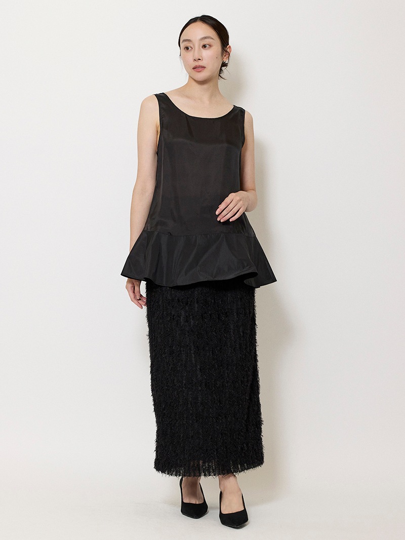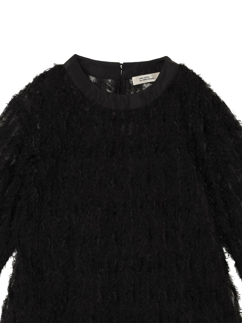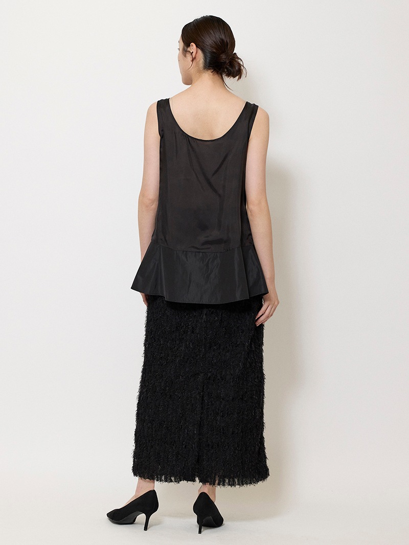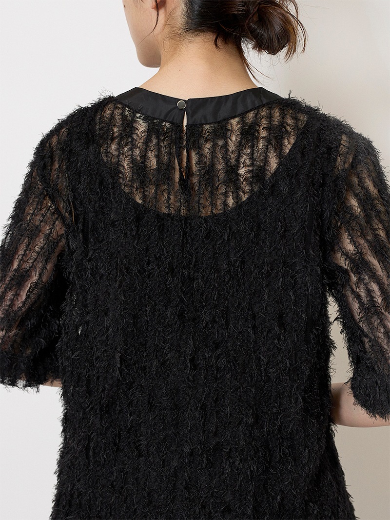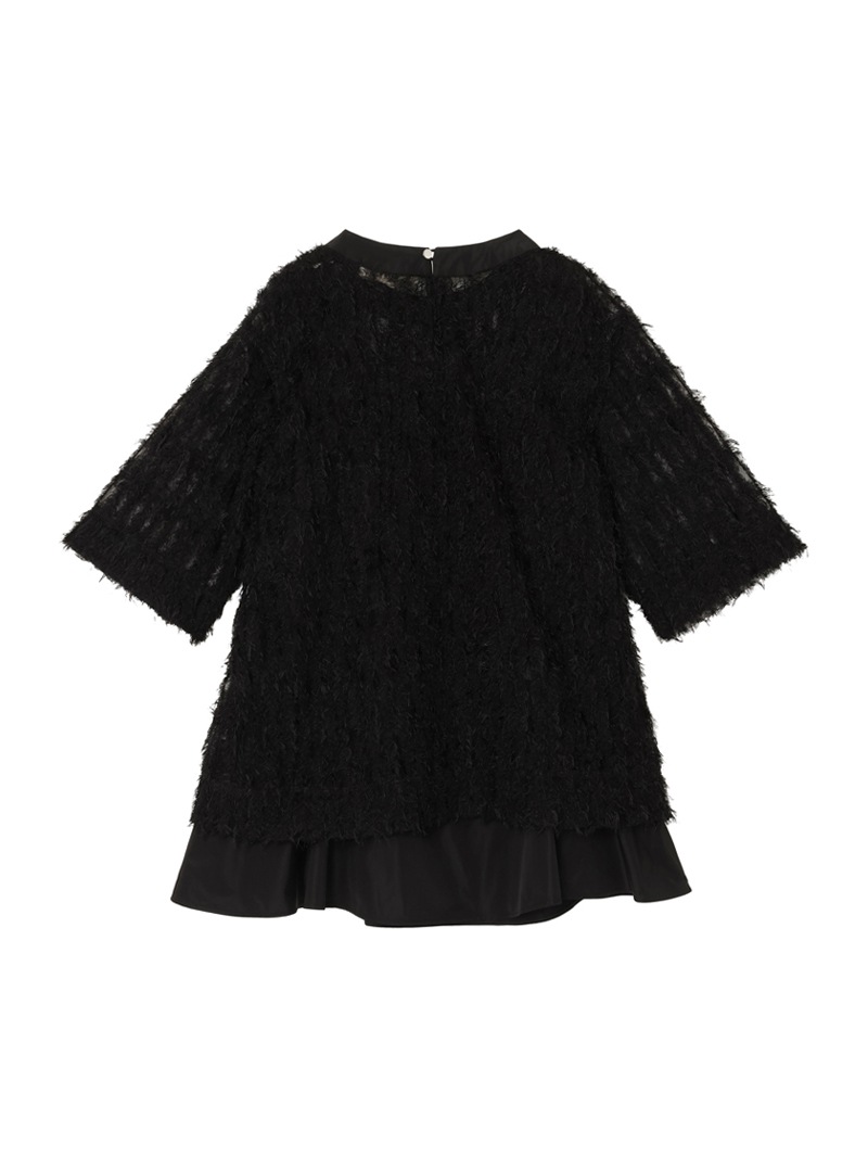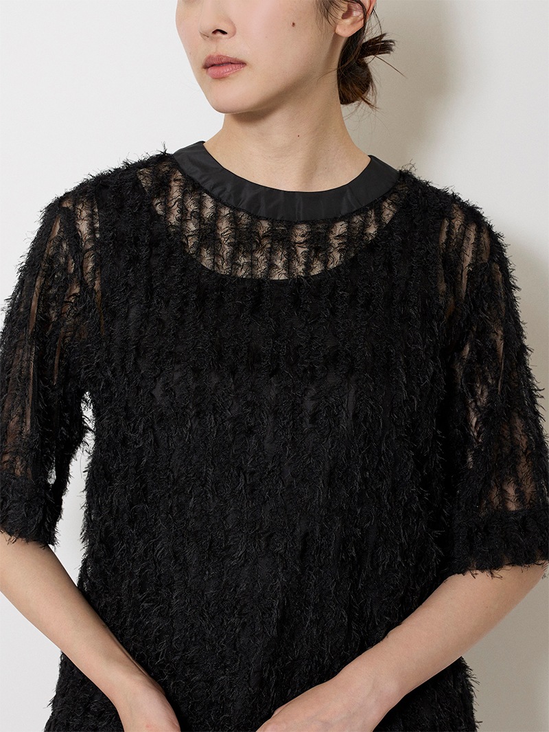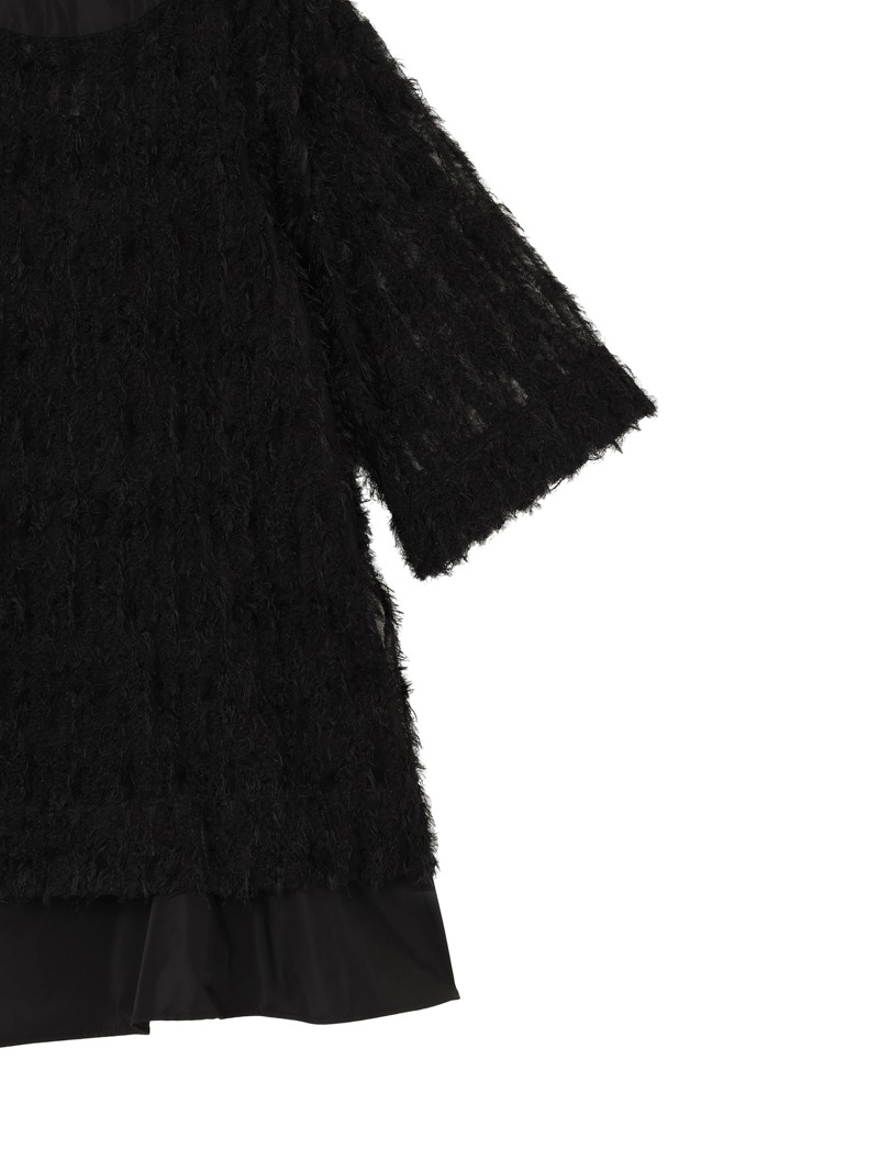 イタリア製のインテッサ素材を使用したレイヤードプルオーバー。フリンジのように見えるチュールのカットジャガードに、マットな光沢のあるタフタ素材のインナーは、レイヤードスタイルを楽しめるように少し丈を長めに設定。 同素材のスカートと合わせてセットアップとして着用可能。上品な華やかさがあるので、旅行先でのドレスアップにも最適なアイテム。