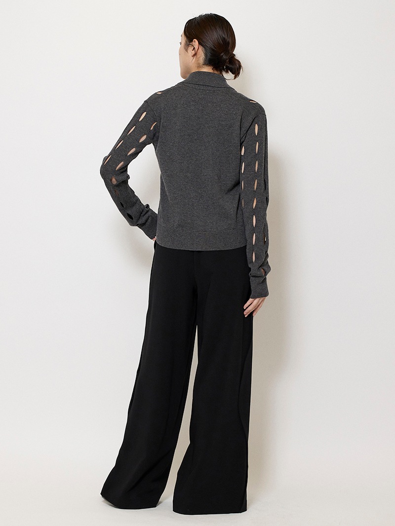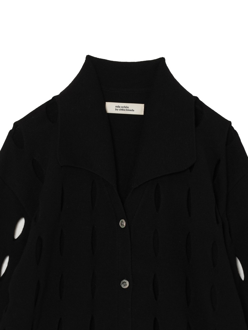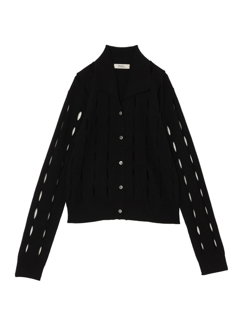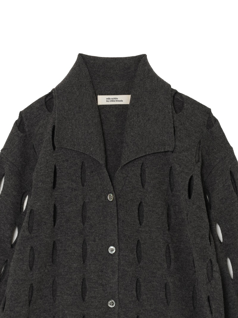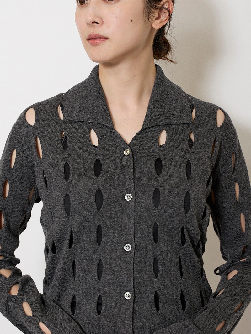 Vネックに大きめの襟が特徴的なカーディガン。フロントと袖のスリットホールから、インナーのカラーや柄を見せることで表情が変わる。レイヤードを楽しめるアイテム。