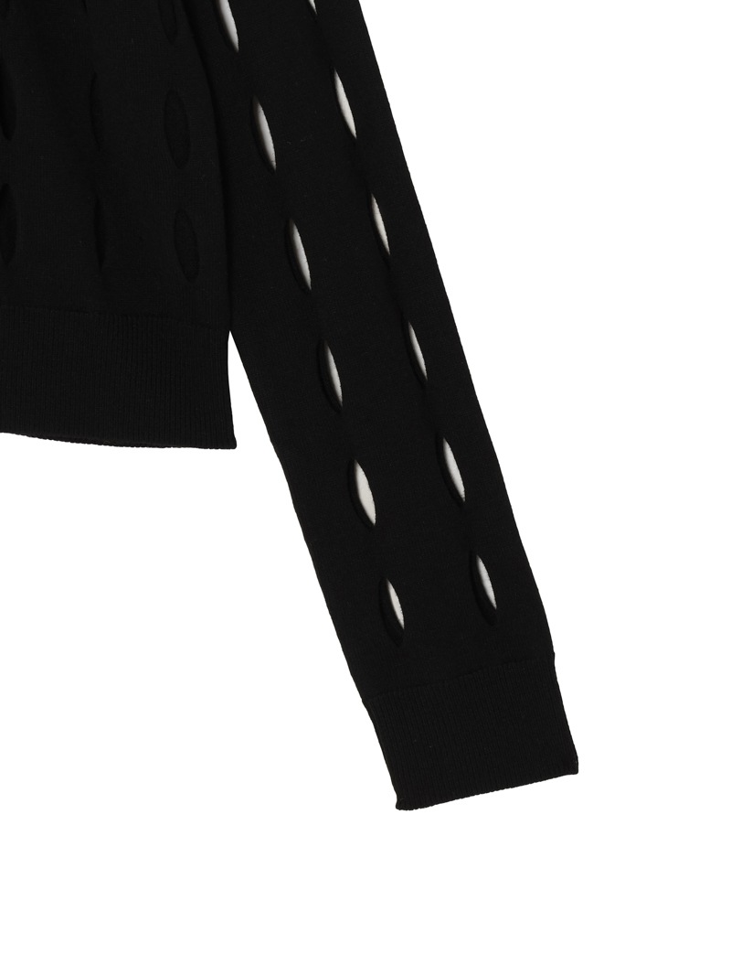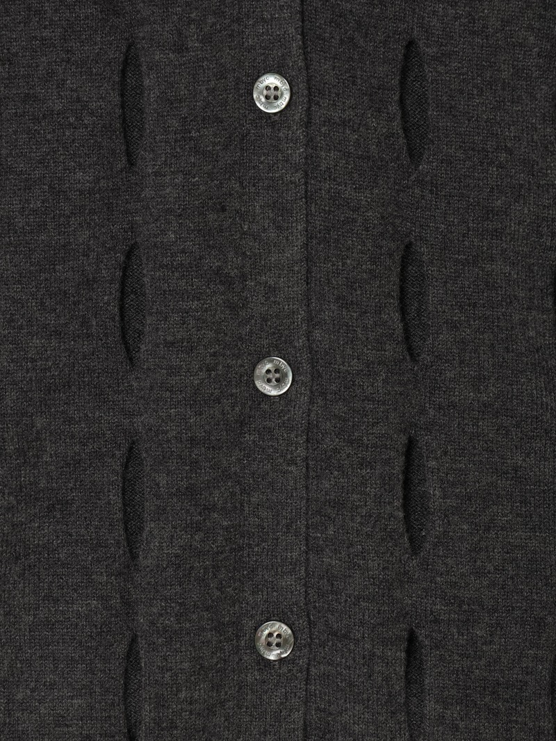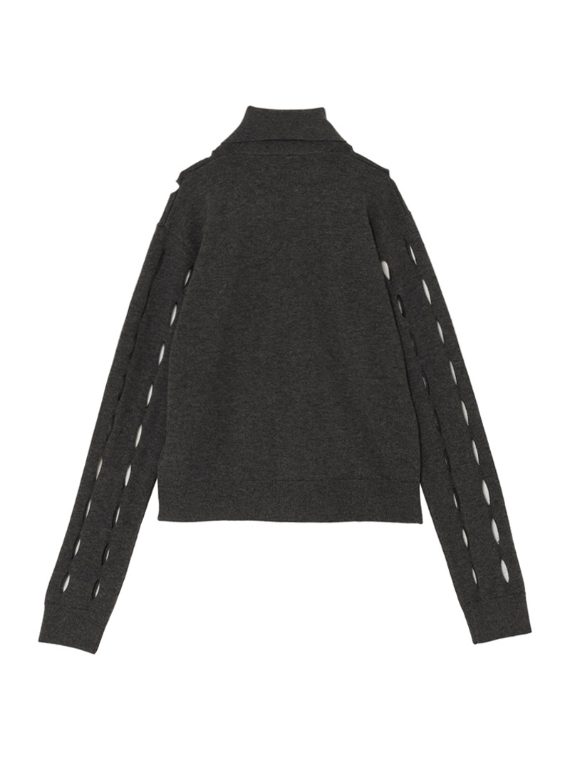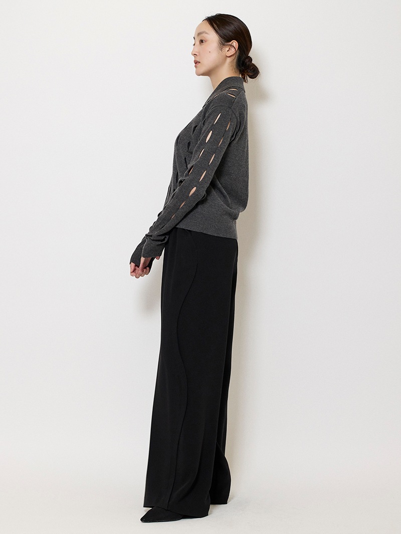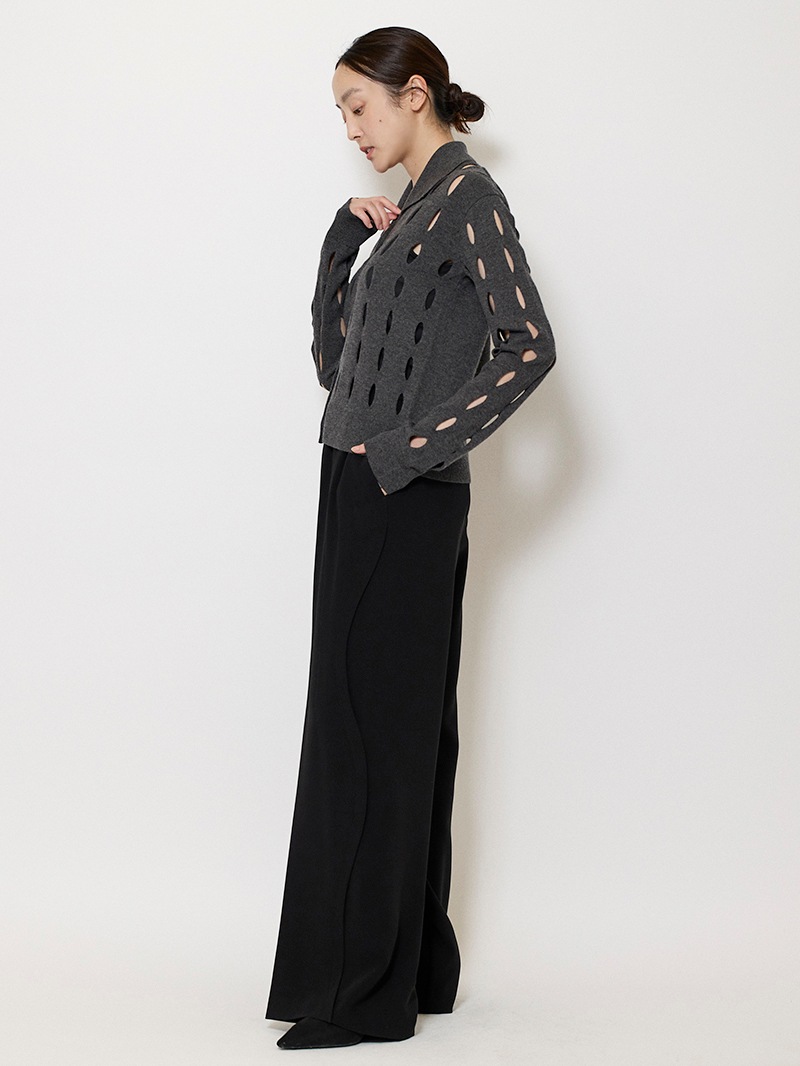 Vネックに大きめの襟が特徴的なカーディガン。フロントと袖のスリットホールから、インナーのカラーや柄を見せることで表情が変わる。レイヤードを楽しめるアイテム。