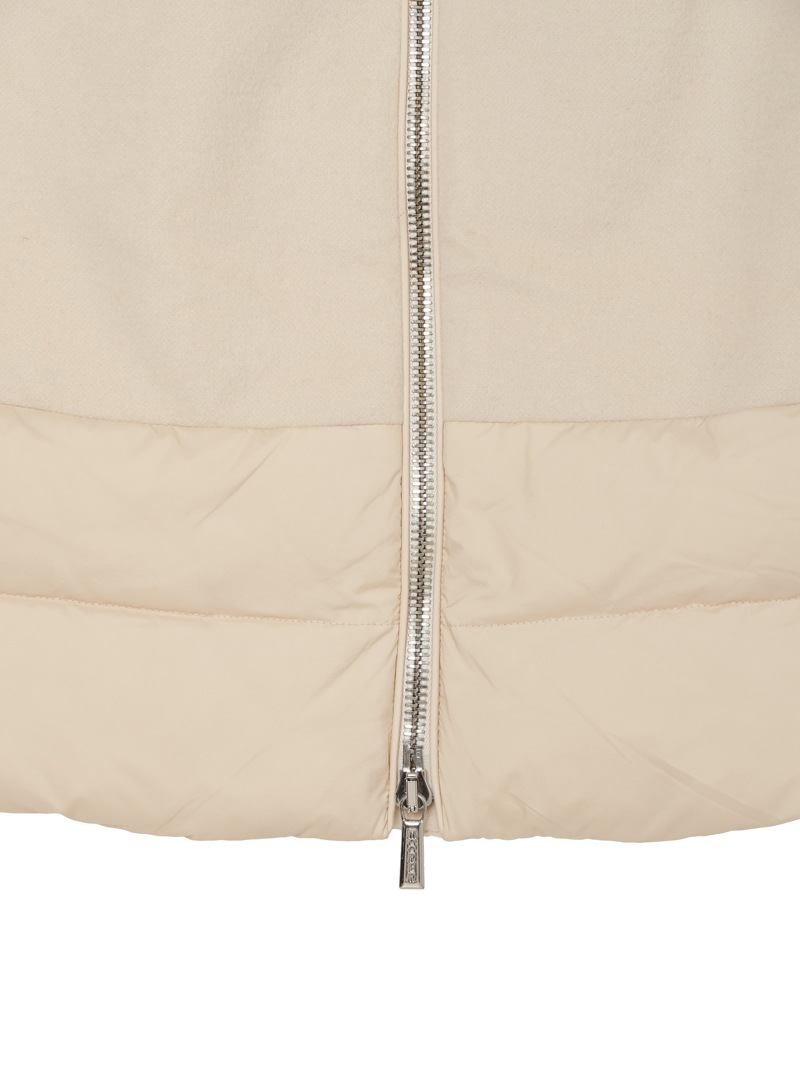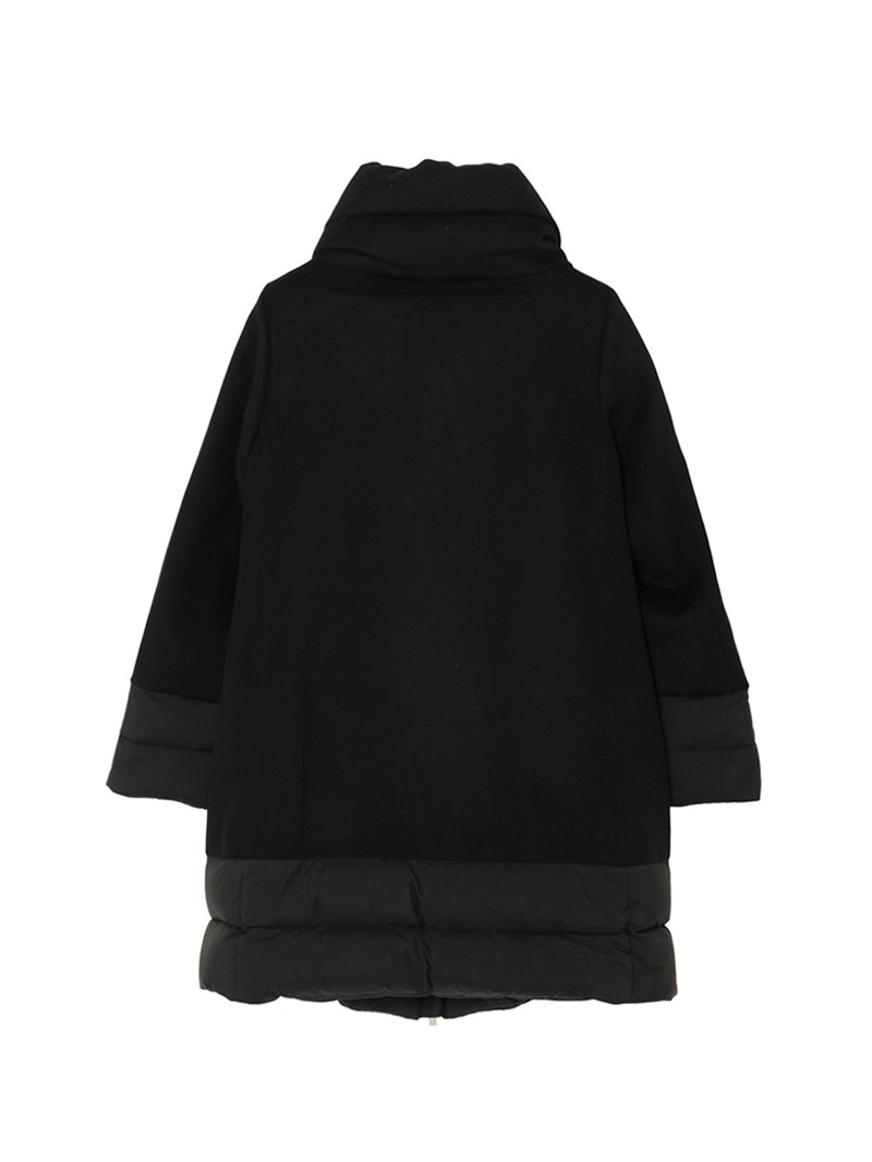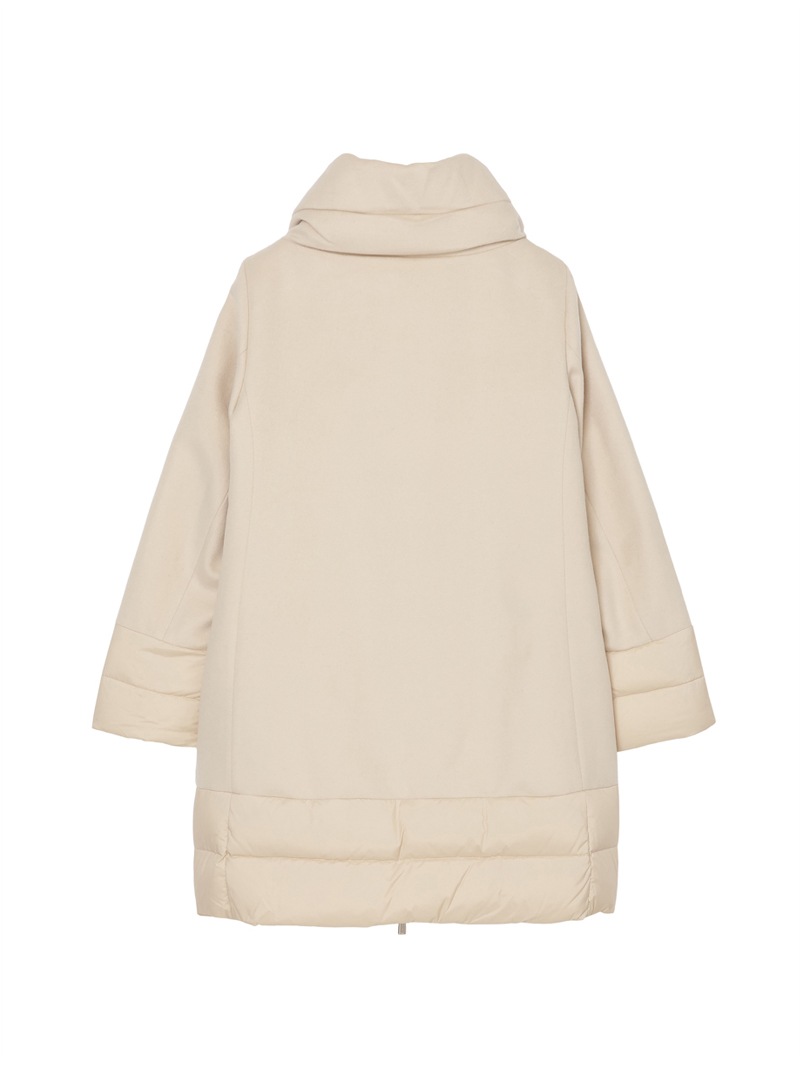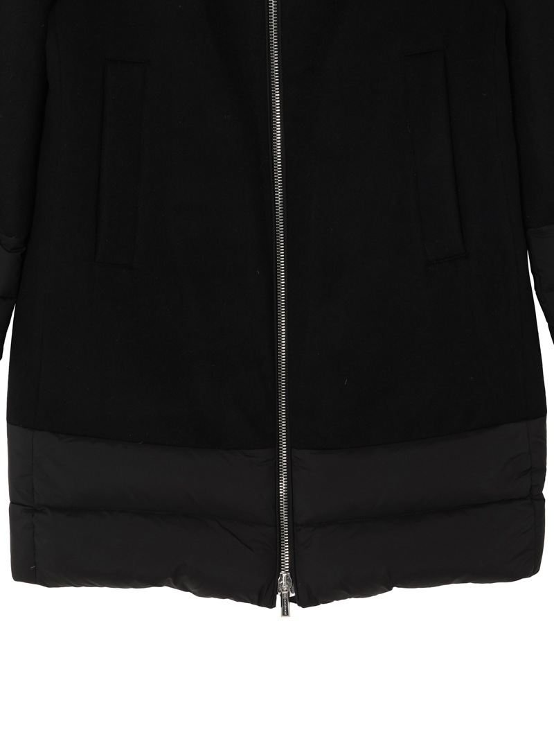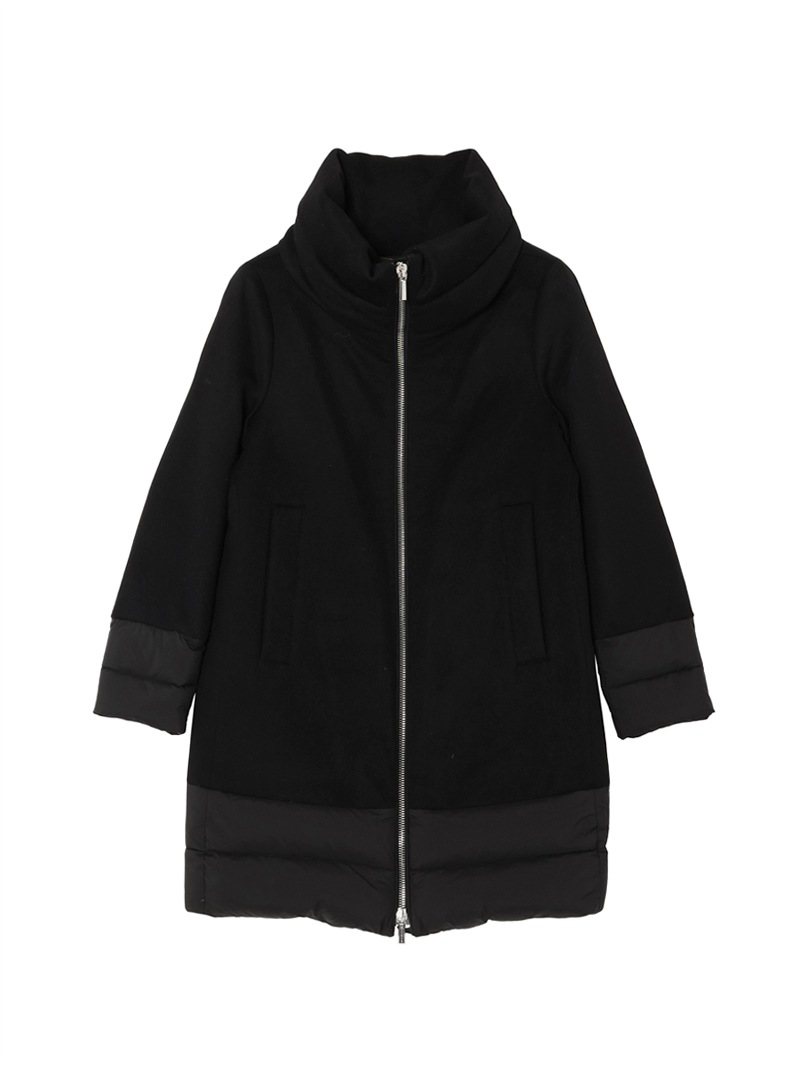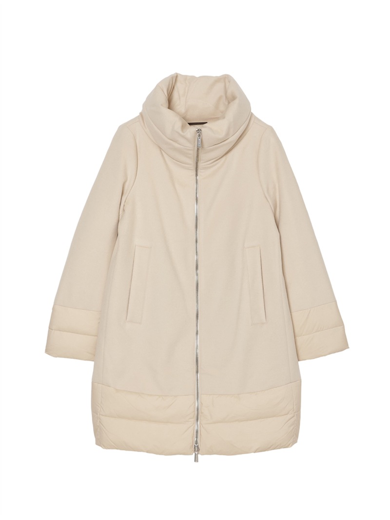 ウールカシミヤとダウンを組み合わせたロングダウンコート。カシミヤ混の上質なウールビーバー素材と、マットな質感で風を通しにくいテクニカルファブリックをドッキングした、快適さ、上品さ、機能性を兼ね備えたモデルです。大きくやわらかな襟が首元を優しく包み込みます。フロントはダブルファスナー開閉、サイドポケットを備えています。