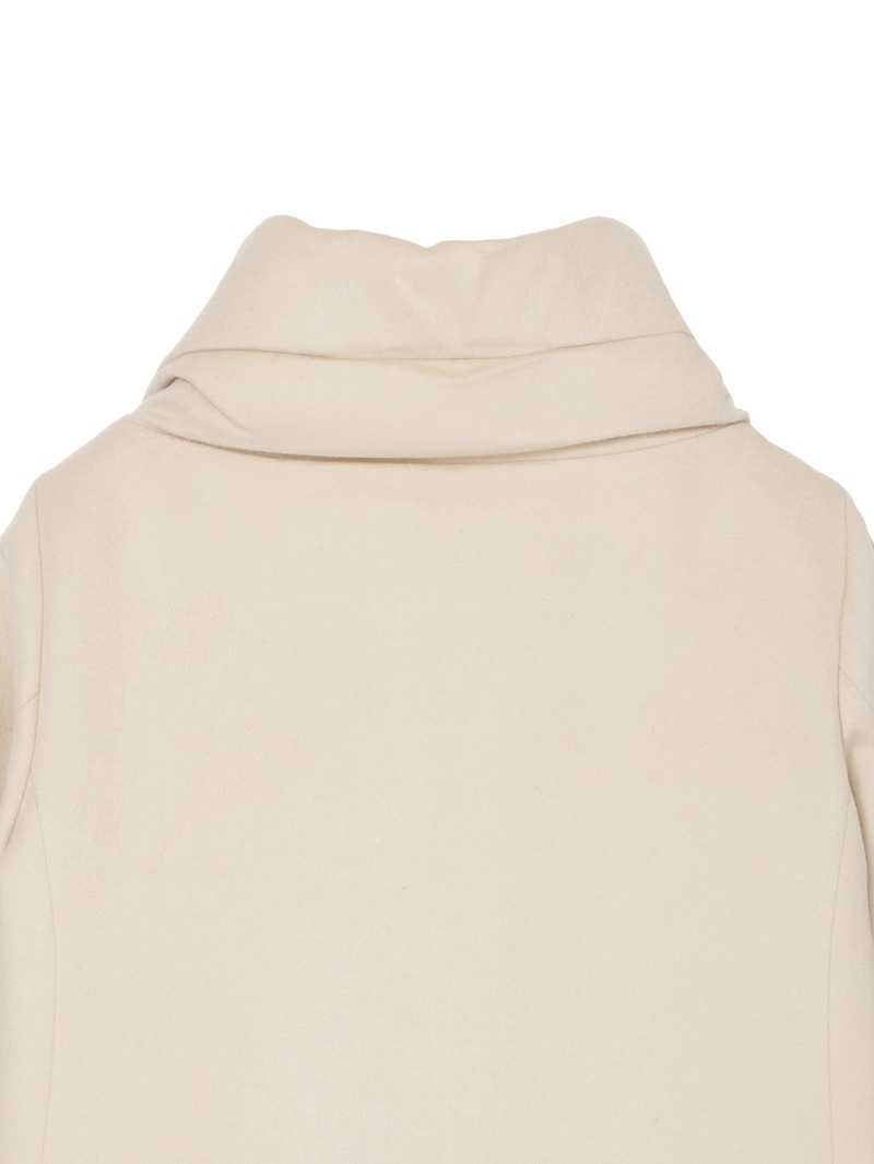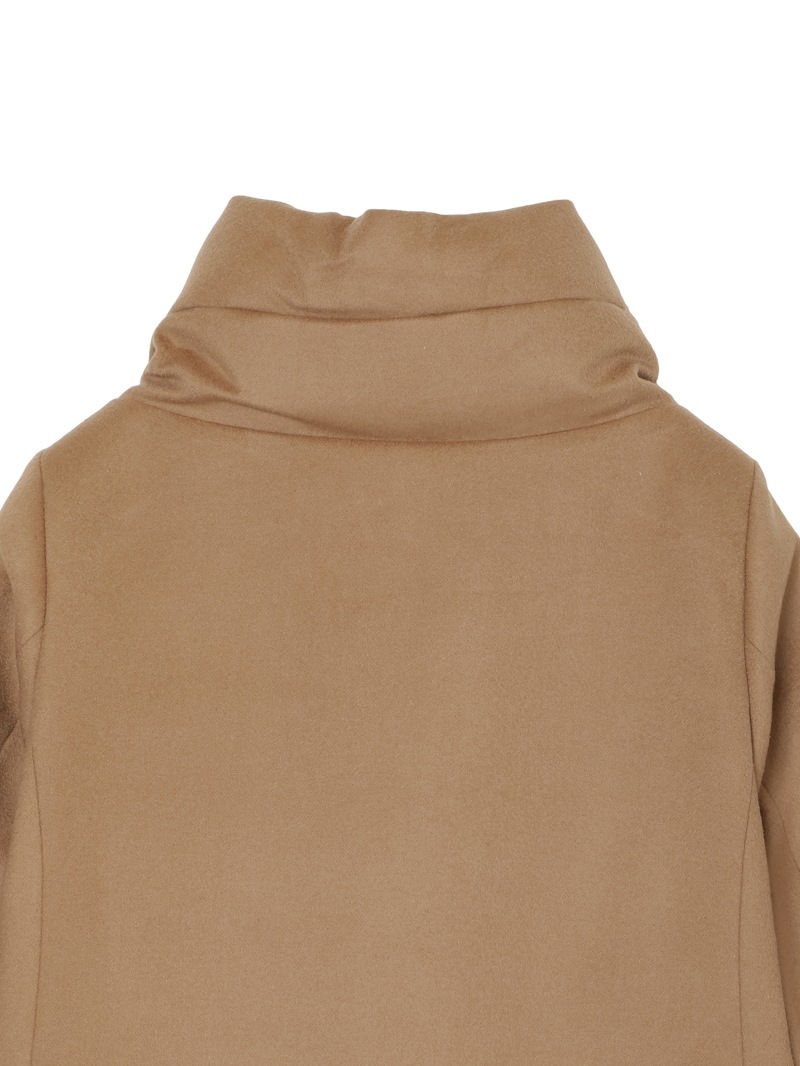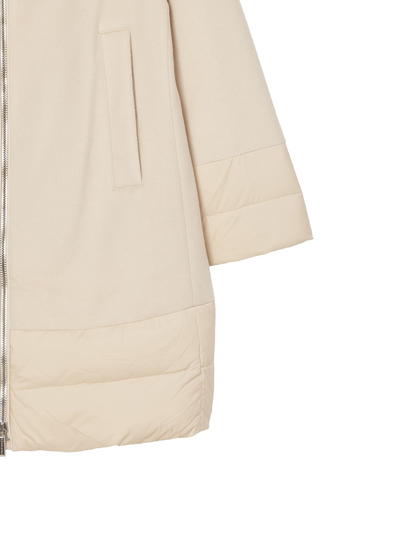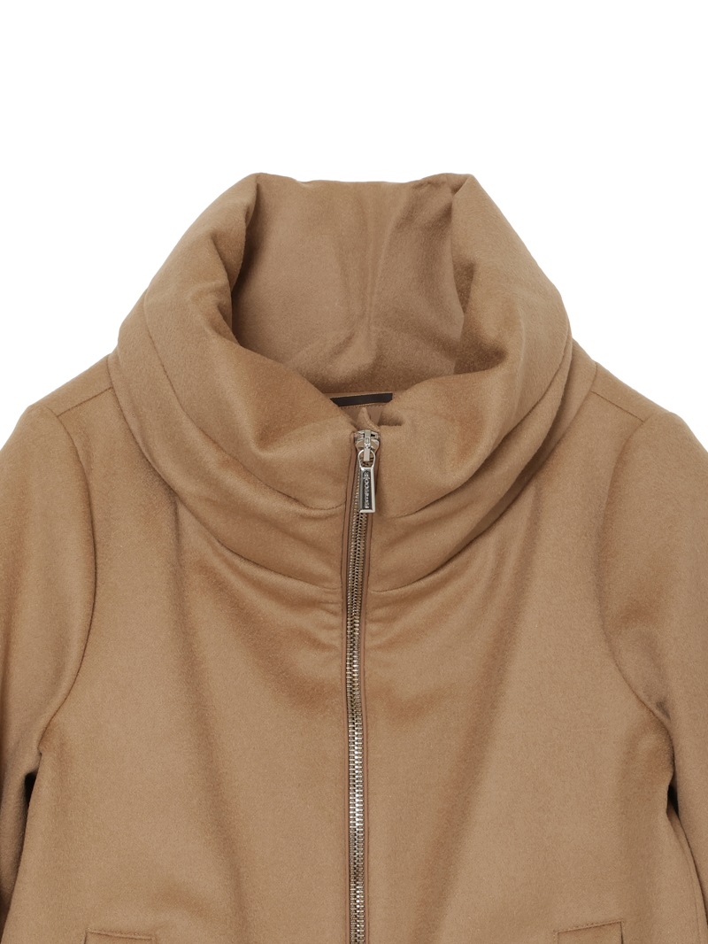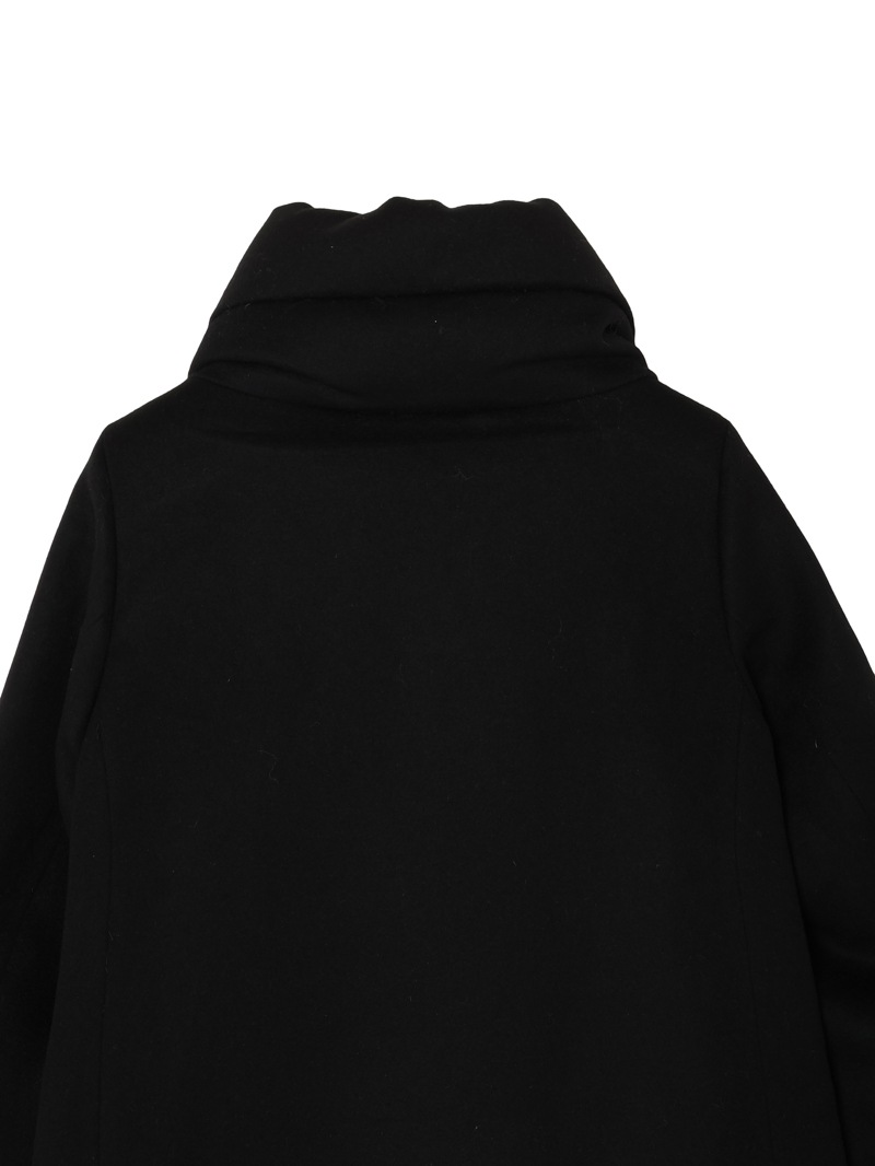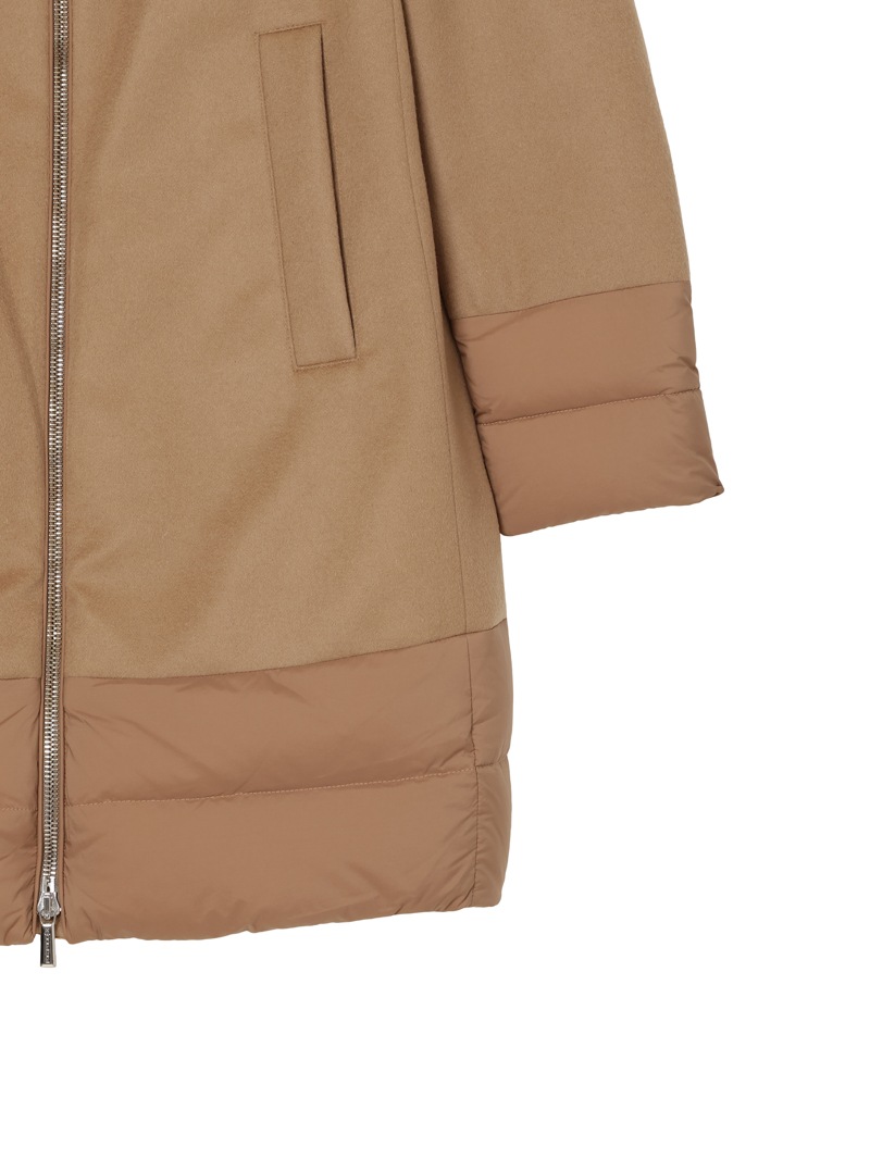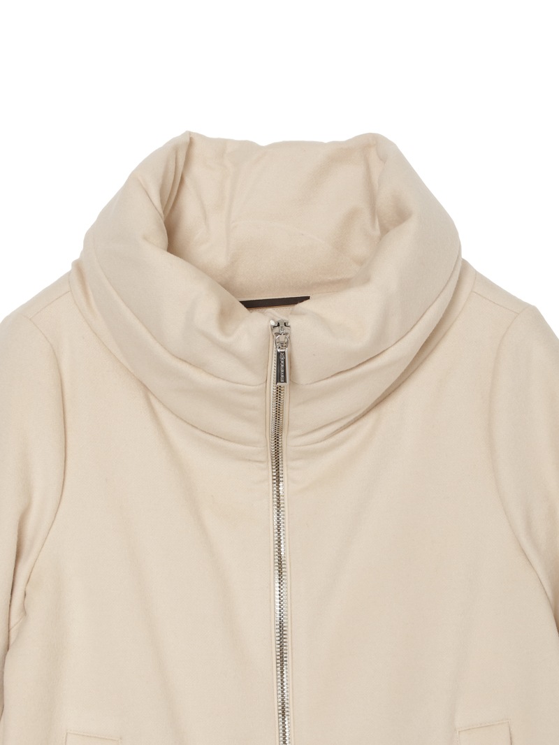 ウールカシミヤとダウンを組み合わせたロングダウンコート。カシミヤ混の上質なウールビーバー素材と、マットな質感で風を通しにくいテクニカルファブリックをドッキングした、快適さ、上品さ、機能性を兼ね備えたモデルです。大きくやわらかな襟が首元を優しく包み込みます。フロントはダブルファスナー開閉、サイドポケットを備えています。