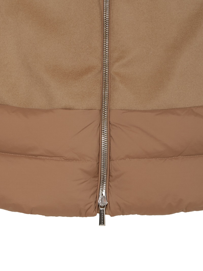 素材: 毛100% <部分>ナイロン95% ポリウレタン5% <中わた>ダウン95% フェザー5% <裏地>ナイロン100%
