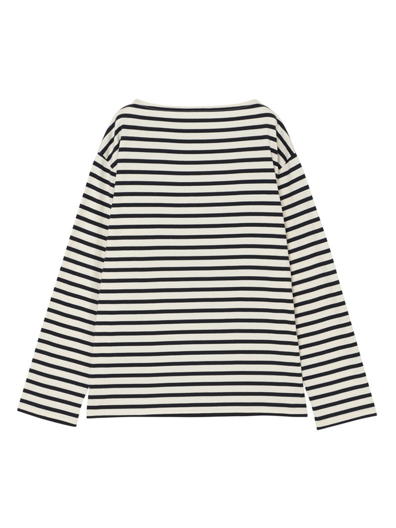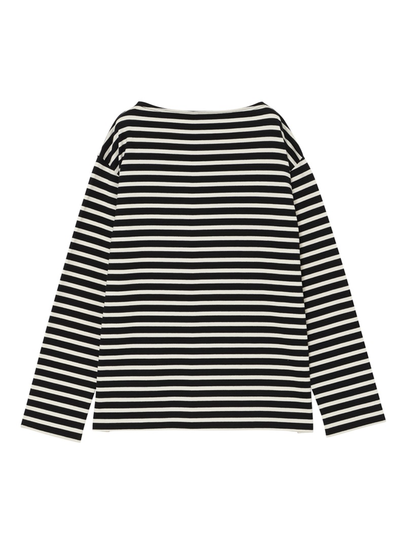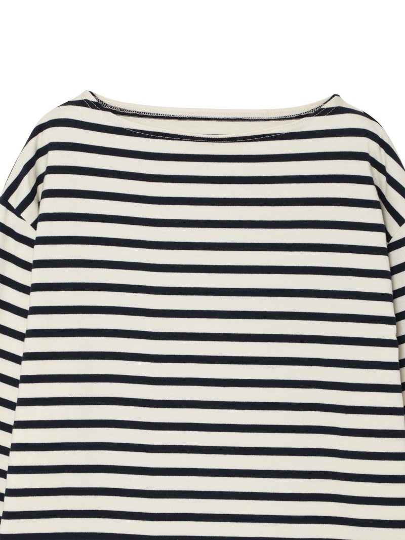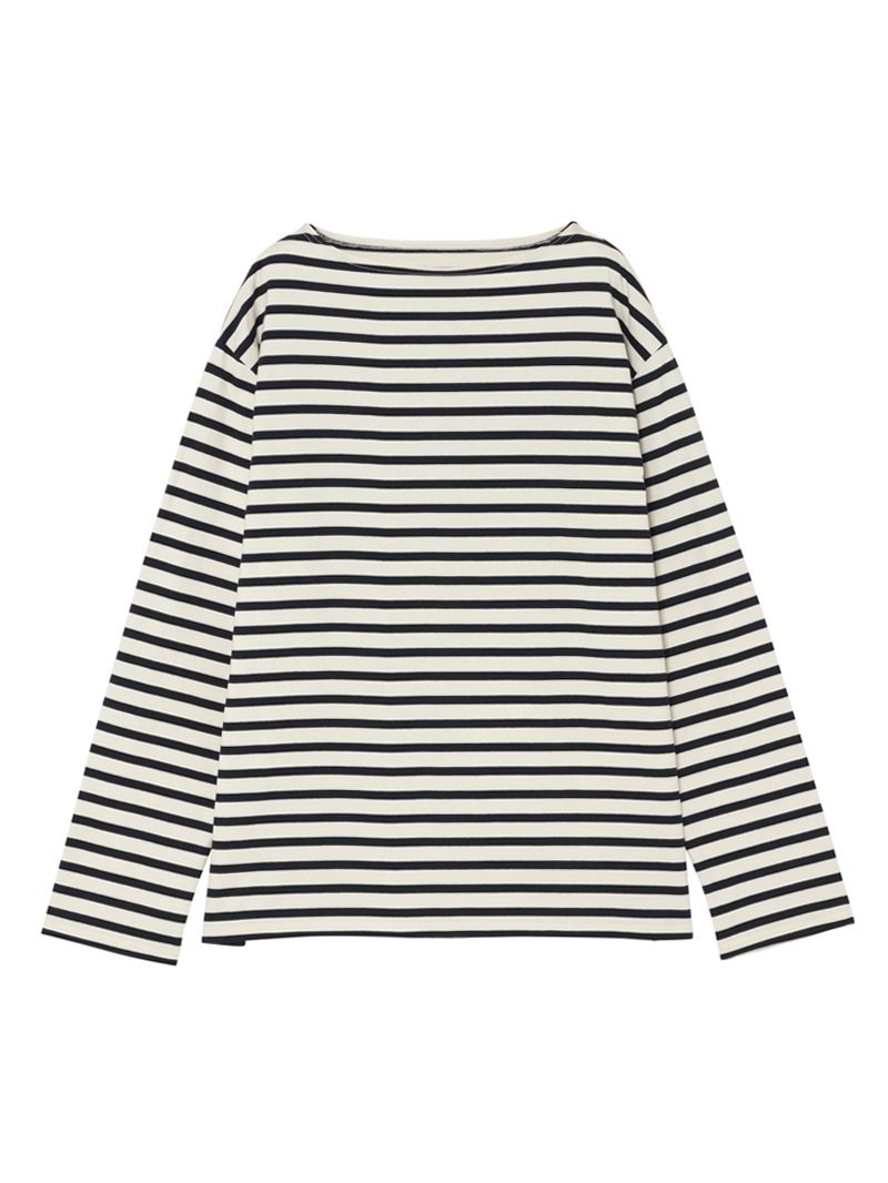 細目のストライプを採用したボートネックTシャツ。主張を抑えながらも洗練されたバランスで。少し肉感があり、しっかり目の素材が特徴的。ジャケットやレザーと合わせたコーディネイトにも。