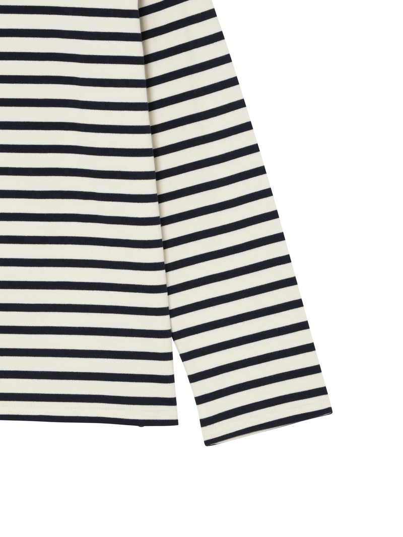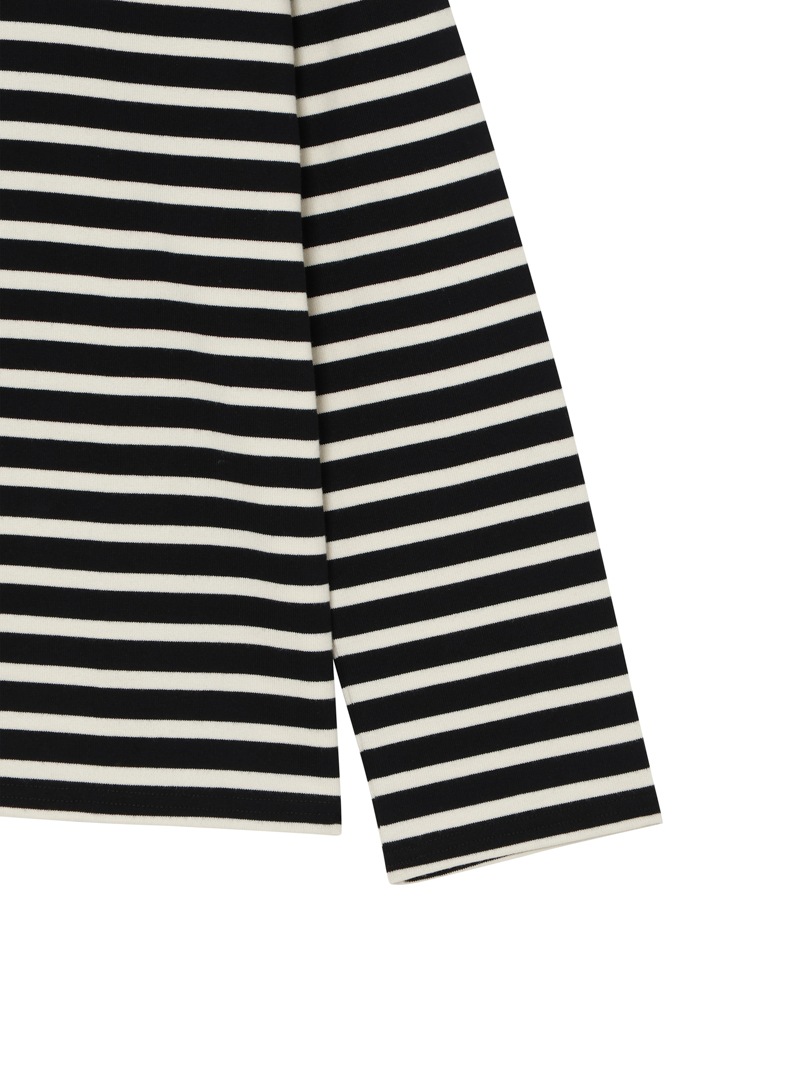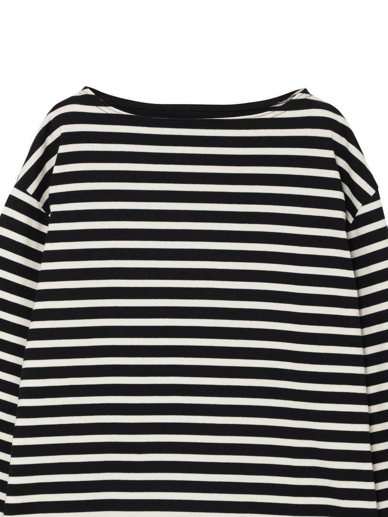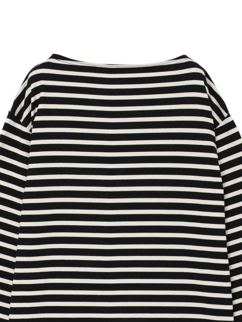 細目のストライプを採用したボートネックTシャツ。主張を抑えながらも洗練されたバランスで。少し肉感があり、しっかり目の素材が特徴的。ジャケットやレザーと合わせたコーディネイトにも。