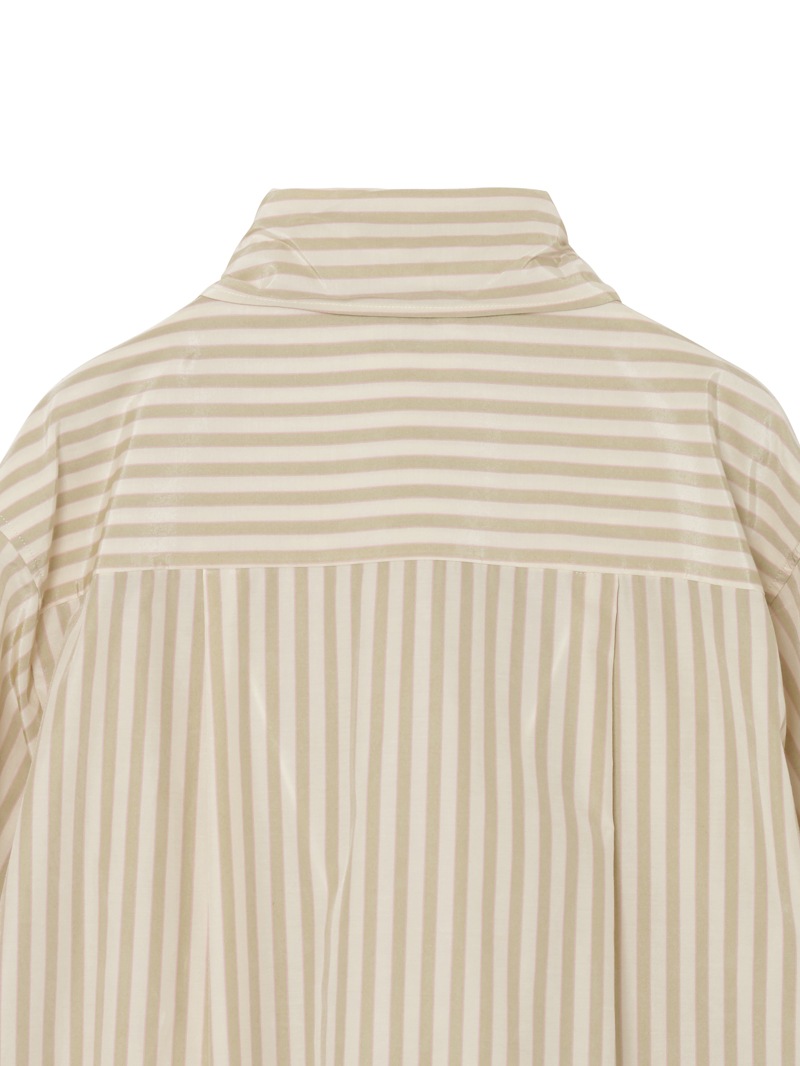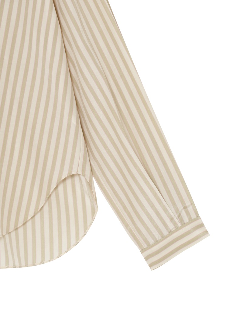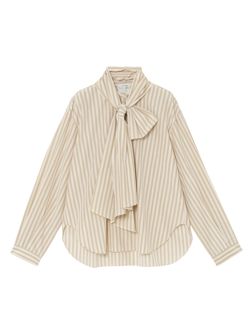 上質なタフタ素材にストライプをあしらったボウタイシャツ。落ち着いたカーキベージュのストライプ柄にピンクを差して、フレッシュなアクセントを加えています。ゆったりとしたオーバーサイズフィットで、ドロップショルダーのこなれた印象と、ハリとツヤのあるシックな素材感が絶妙にマッチしています。取り外し可能なボウタイリボンはたっぷりとボリュームがあり、首元で結ぶことでドレッシーな雰囲気に。シーンに合わせて結び方を変えれば様々な着こなしをお楽しみいただけます。