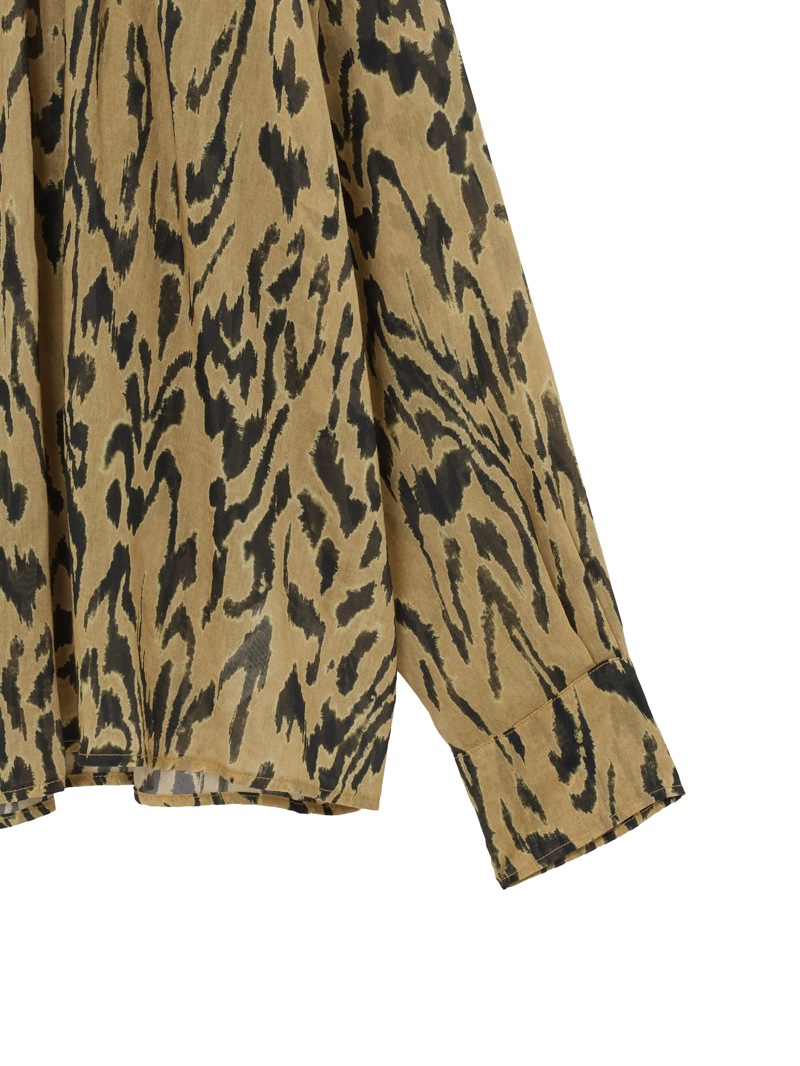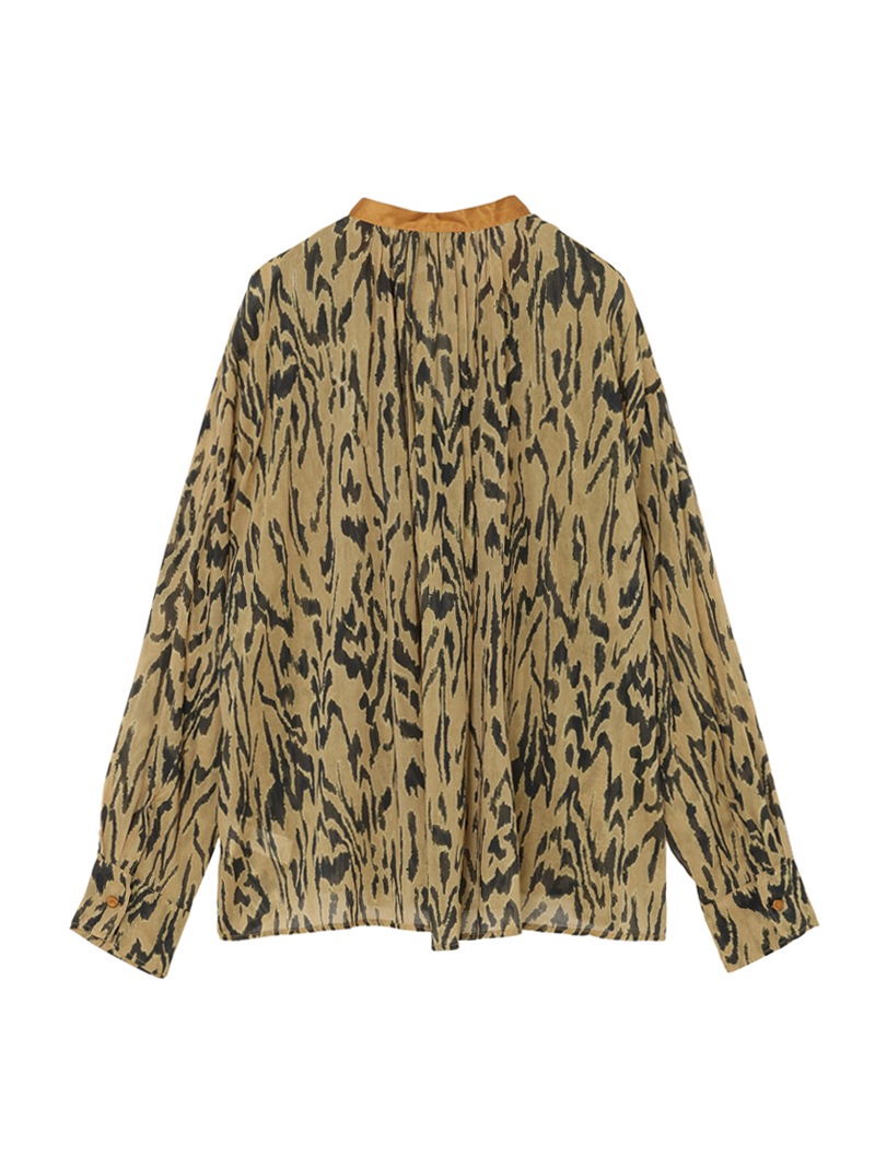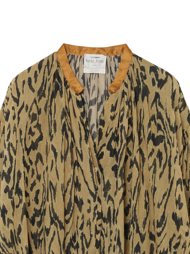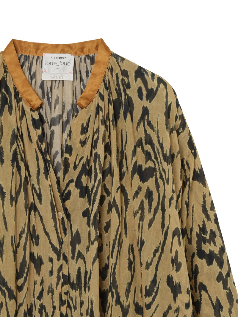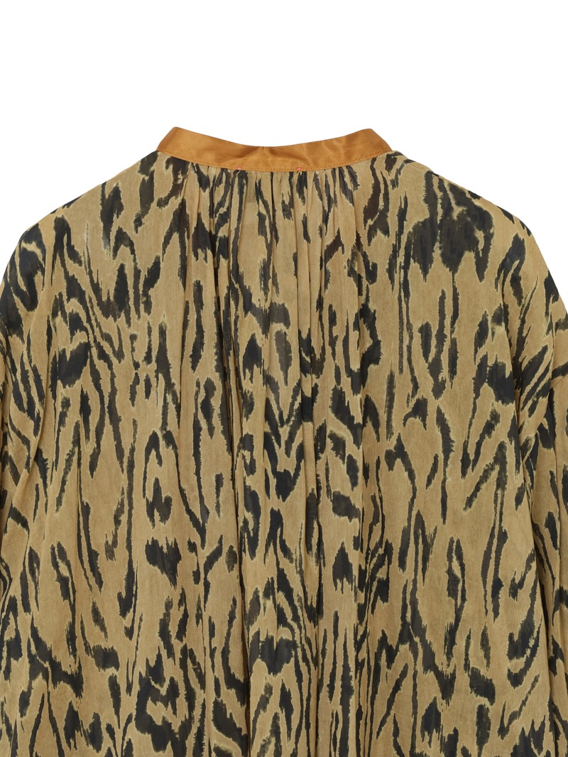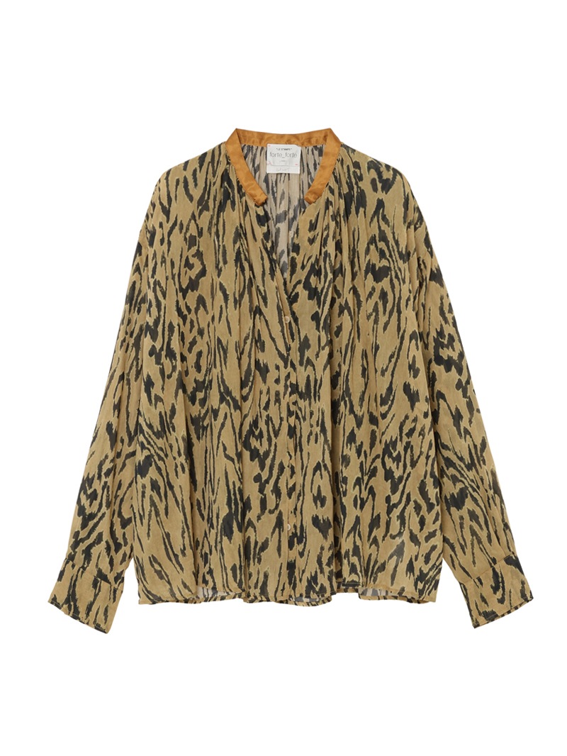 軽やかなアニマル柄が目を引くコットンシルクボイルのフレアブラウス。アニマル柄に新鮮なひねりを加えた“moire”プリントは、なめらかにも歪にも感じられる独創的なパターンが特徴。シアー感のあるエアリーなコットンシルクボイル素材にプリーツを施し、贅沢なフレアシルエットに仕上げています。深いVネックを縁取るサテンのバンドカラーが全体を引き締めます。