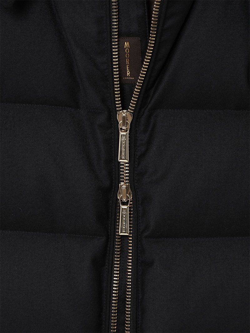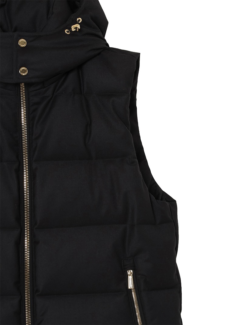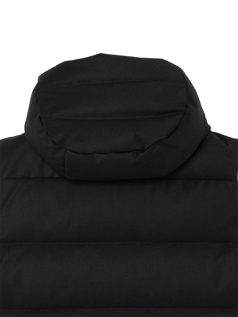 防水効果を備えたAcquaライン(耐水レベル2)のグースダウンベスト。バージンウールとカシミヤのミックスフランネルに、通気性の高い防水メンブレンを組み合わせた軽量で快適な一枚。ストレートなシルエットで、フロントのダブルスライダージップは特別なゴールドカラーで仕上げています。