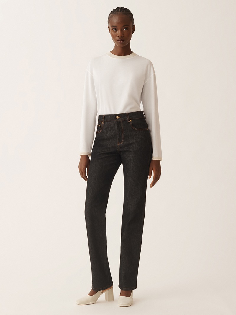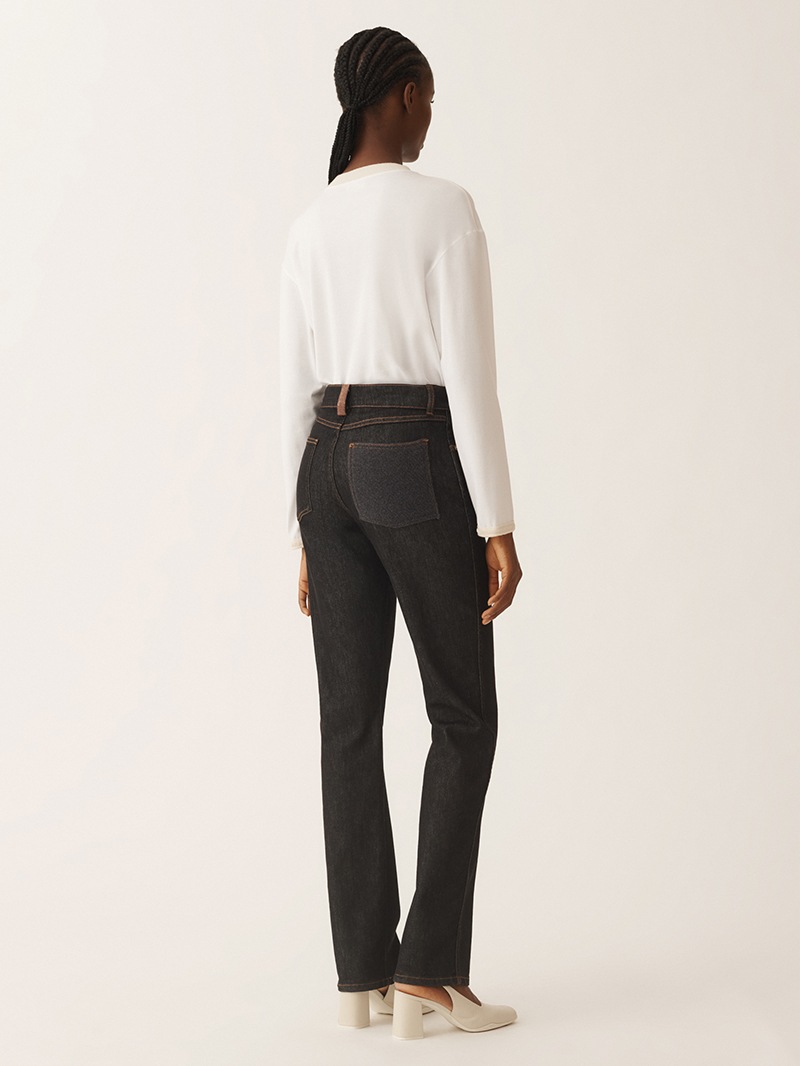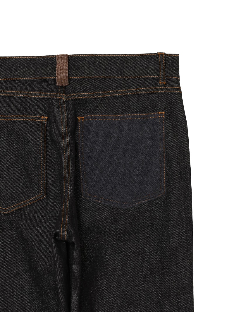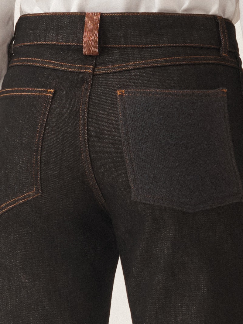 FABIANA FILIPPIの定番トラウザーズとデニムの汎用性が融合した、レギュラーフィットの5ポケットパンツ。ウール・シルク・カシミヤを贅沢にブレンドした独自の混合糸“プラチナ”のニットポケットがアクセントになっています。ベルトループに散りばめられたビーズの輝きとあわせて、バックスタイルのワンポイントに。上品なスリムストレートのシルエットで、洗練された大人のカジュアルスタイルを演出します。