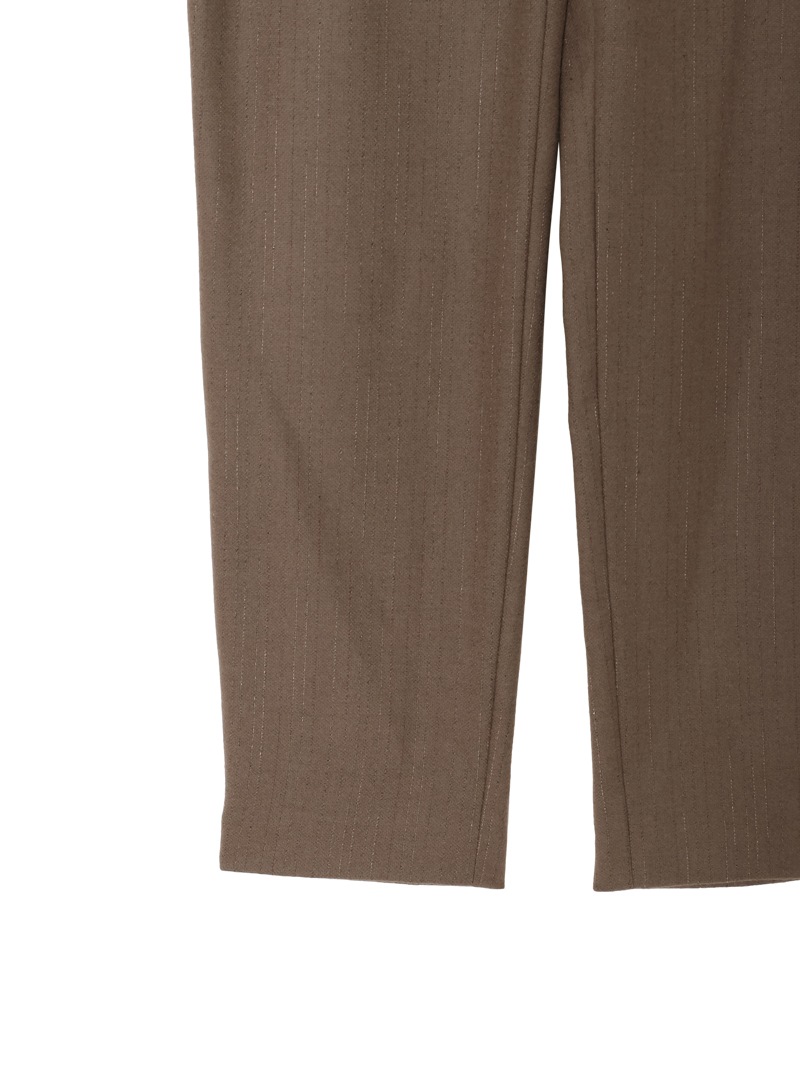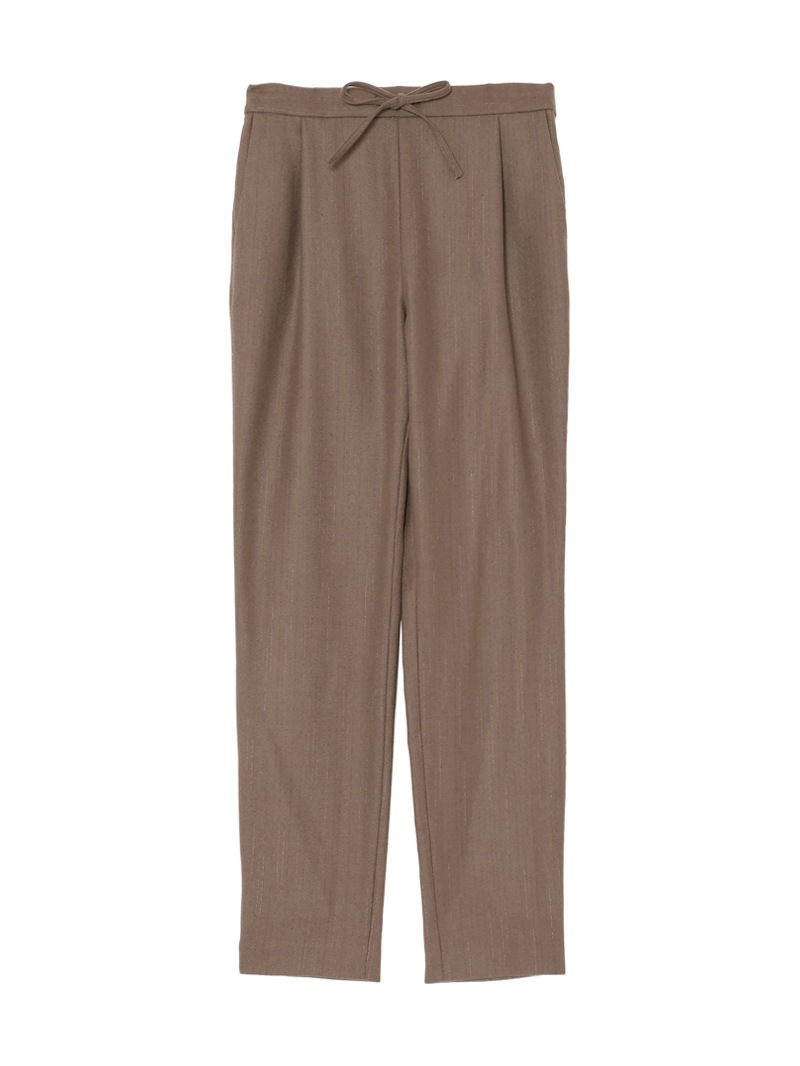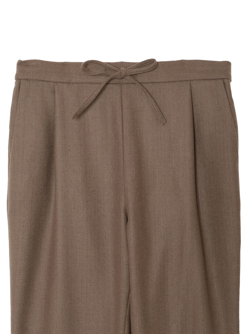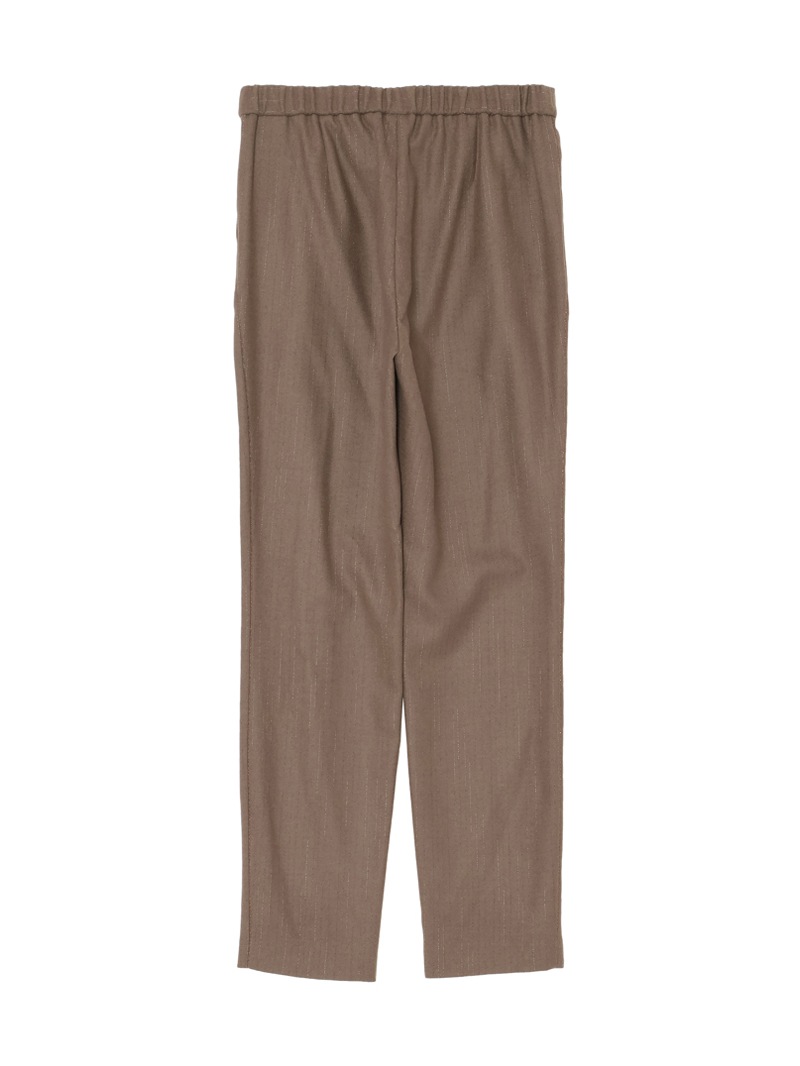 トラッドな印象のピンストライプに、スポーティなフォルムのジョギングパンツ。ツヤのあるストライプがフェミニンなエッセンスを追加しています。バックウエストは快適なゴム仕様で、デイリーにもリラックスシーンにもフィット。Tシャツからニットまで幅広いトップスと相性が良く、スタイリングにモードなエッセンスを添えてくれます。