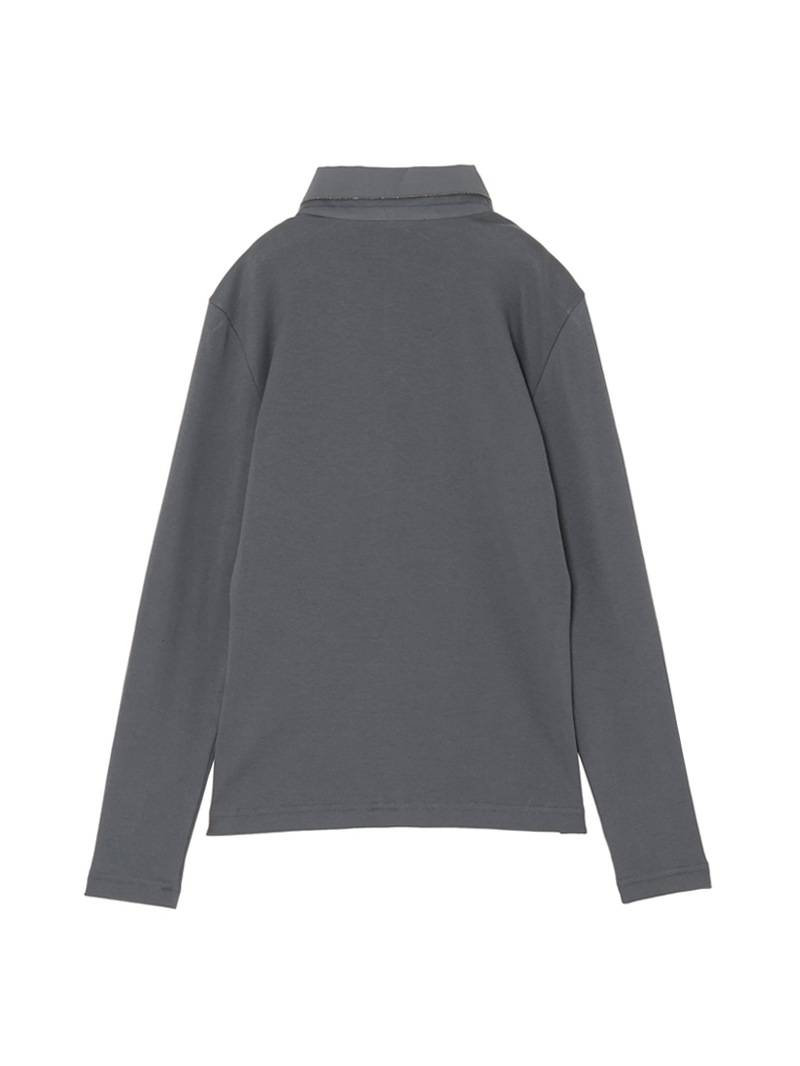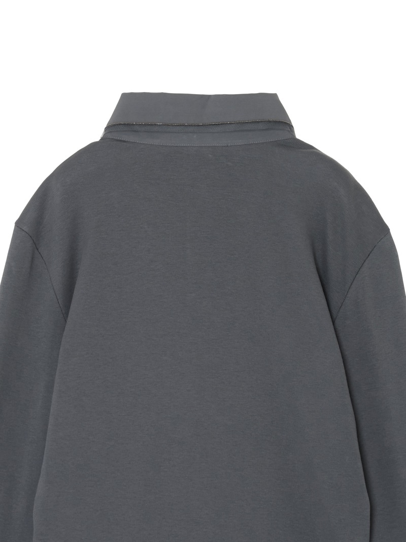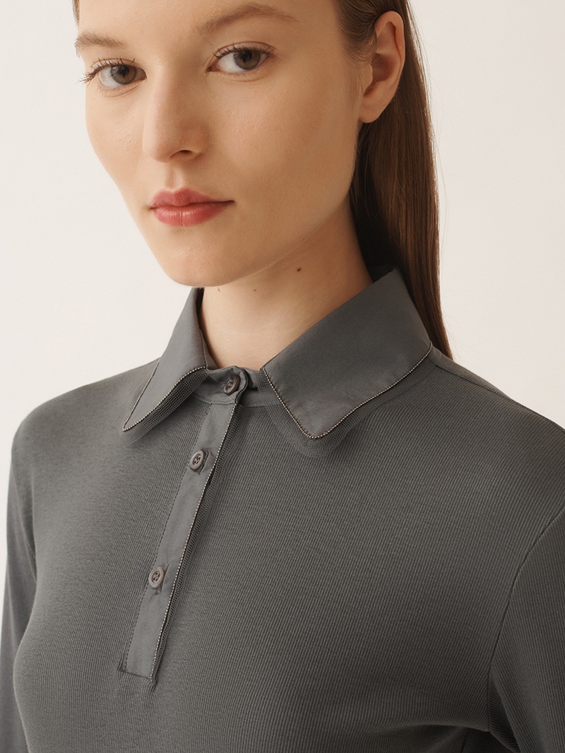 柔らかなコットンジャージー素材を使用した、ベーシックなリブTシャツ。エラスタンをブレンドすることで、ほどよいストレッチ性とフィット感を実現しました。ハリのあるポプリンを使用したポロカラーは、光沢のあるダイヤモンドチェーンと透け感のあるチュールで縁取られています。シンプルで着回しやすく、レイヤードスタイルにも最適。快適な着心地と洗練されたシルエットを兼ね備えた、ワードローブの定番アイテムです。