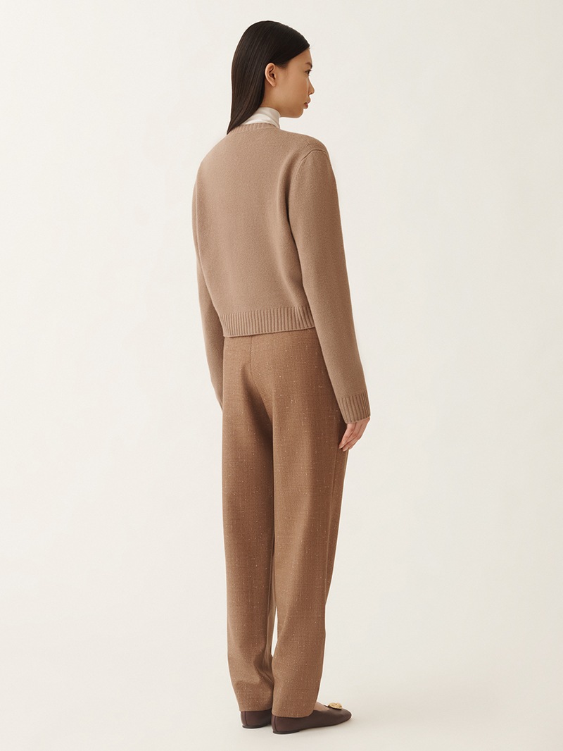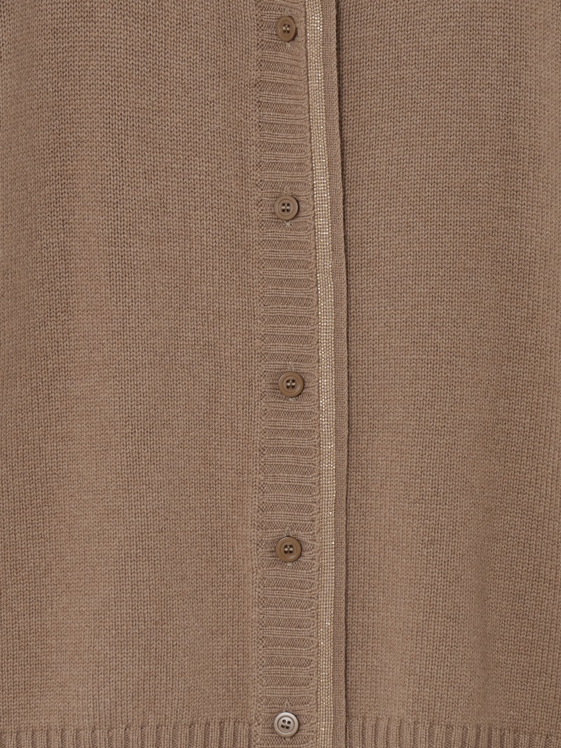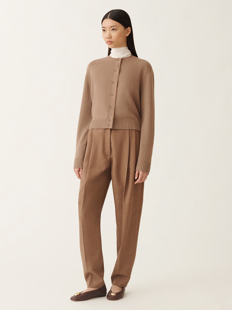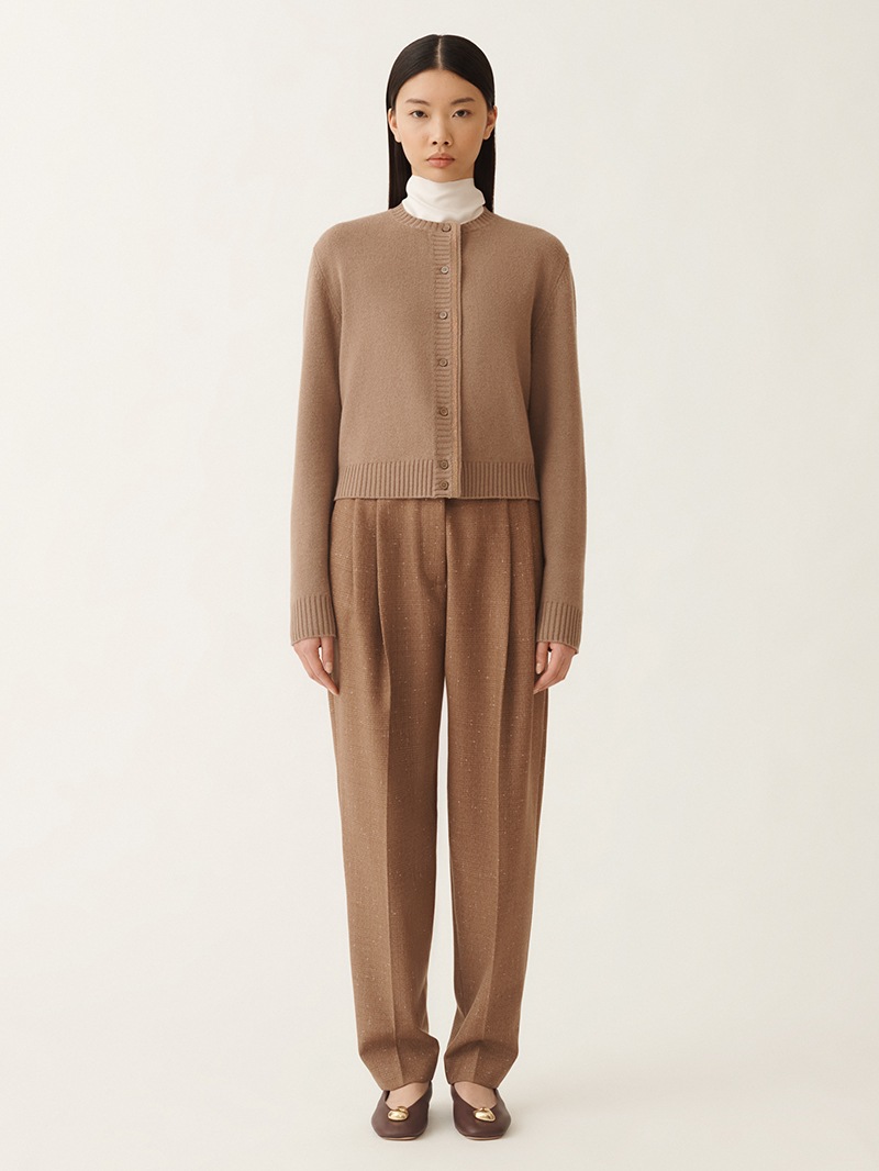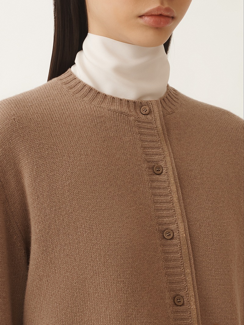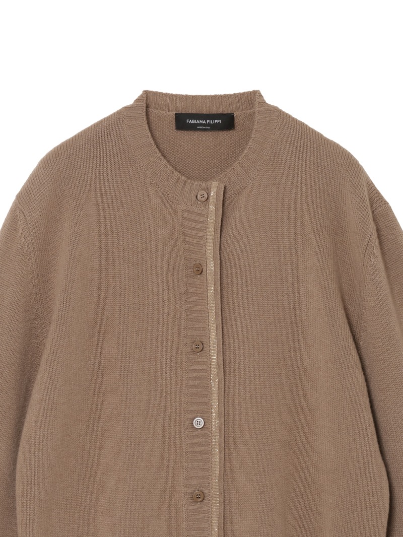 ウール、シルク、カシミヤを贅沢にブレンドした独自の混合糸“プラチナ”を使用した、ニットカーディガン。しなやかな肌触りと繊細なツヤが特徴で、特別な輝きを放つフィロ・ディアマンテ(ダイヤ糸)を前立てにあしらい華やかさと高級感をプラスしています。洗練されたデザインで、オンオフ問わず様々なシーンに映える一着です。