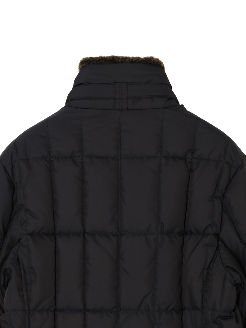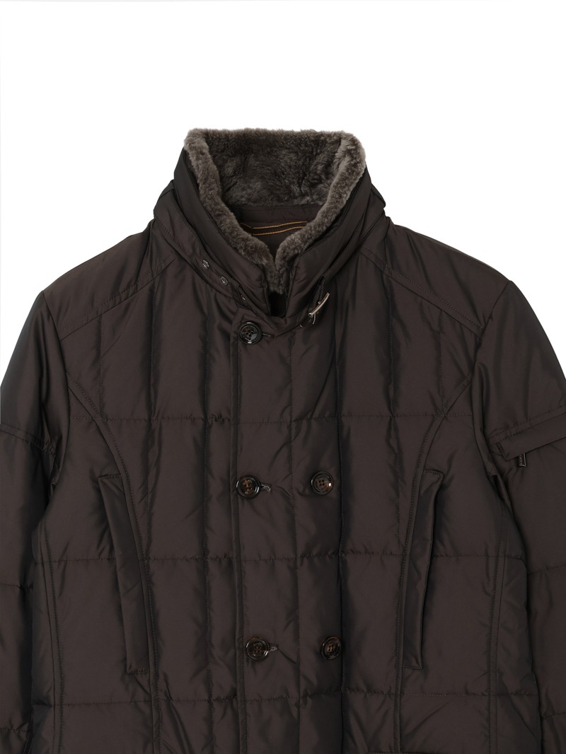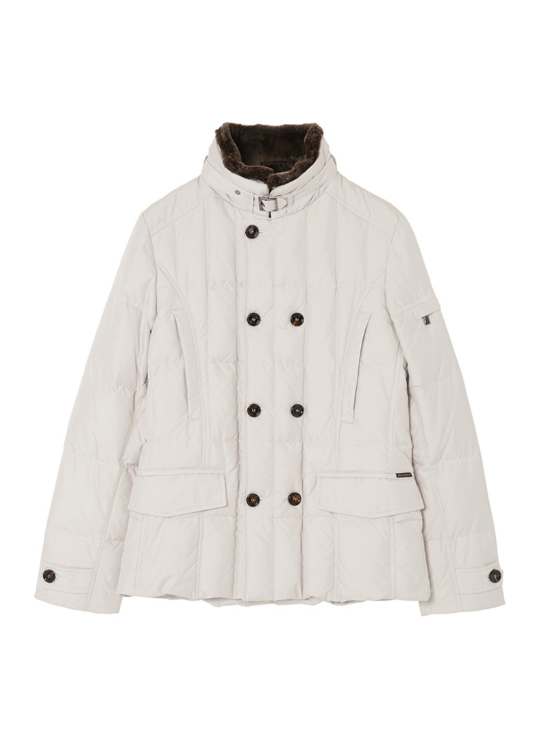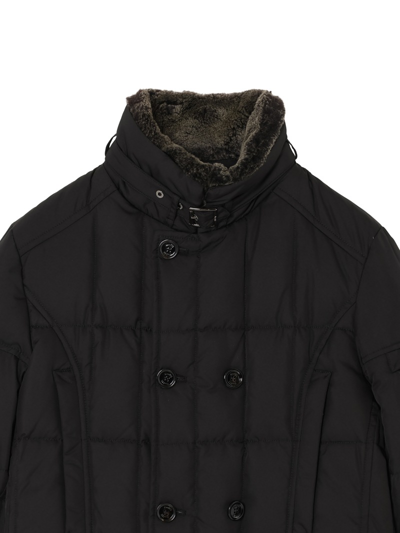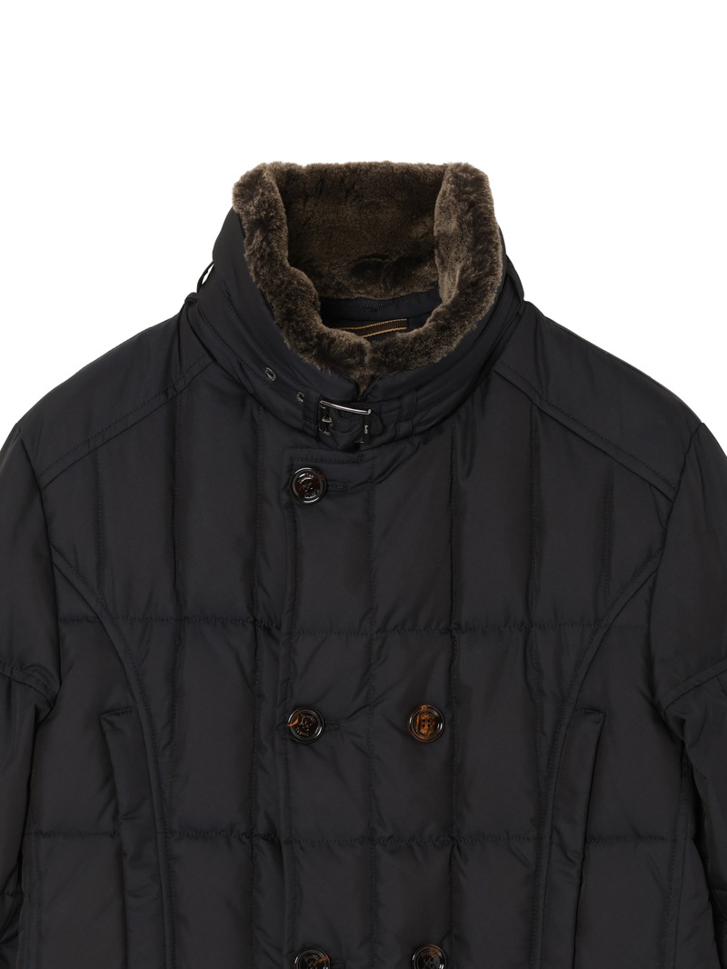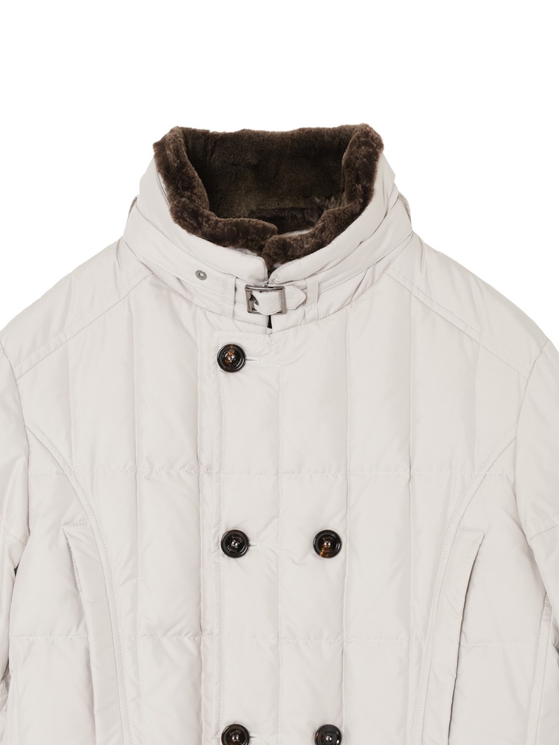 スクエア型のキルティングを施した、ダブルブレストのグースダウンジャケット。光の加減でニュアンス豊かに変化する光沢を持つタフタ織りのギャバジン生地は、形状記憶性と撥水性を備えています。ストラップ留めの襟には取り外し可能なシープスキン付き。シャープでスタイリッシュなシルエットで、カジュアルからドレススタイルまで幅広く対応可できるアイコニックモデルです。