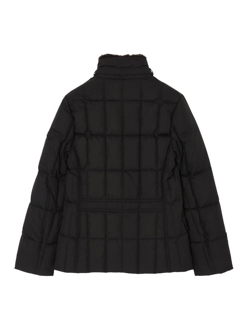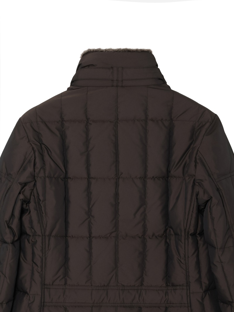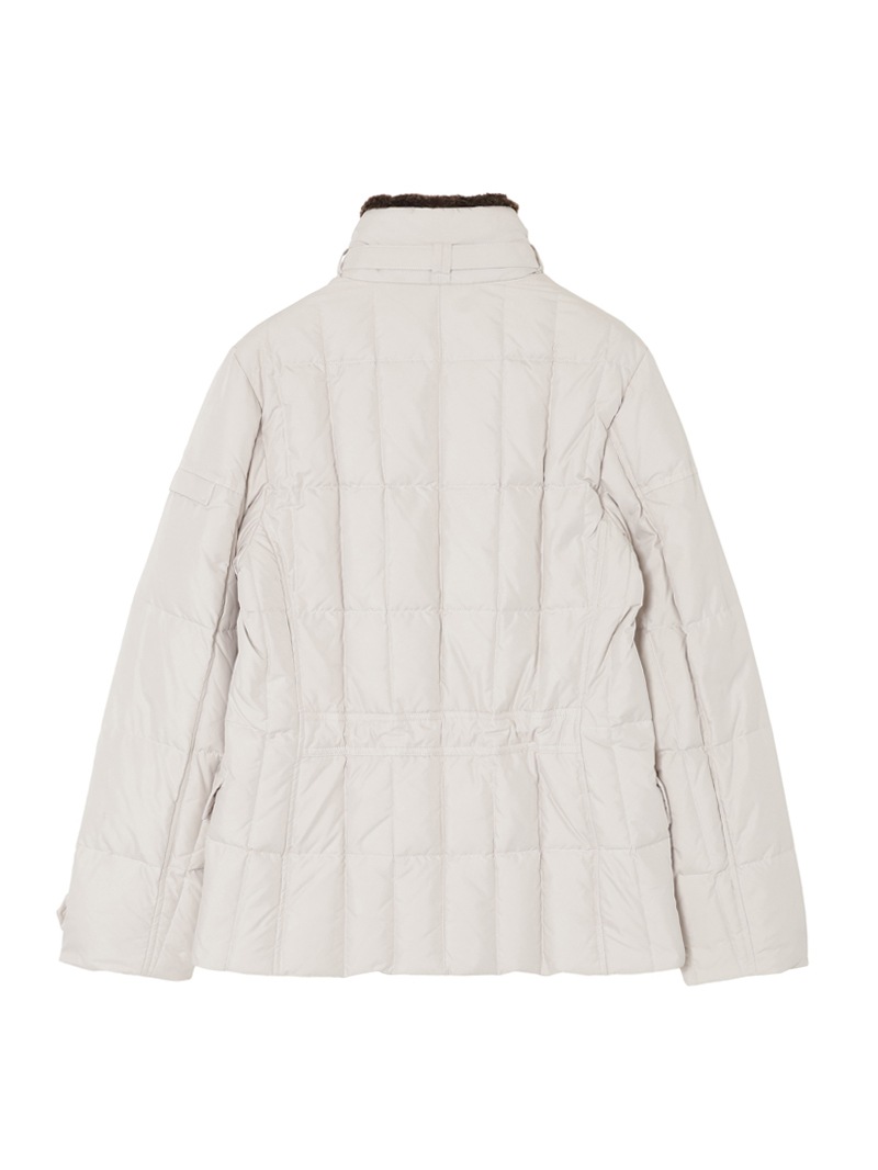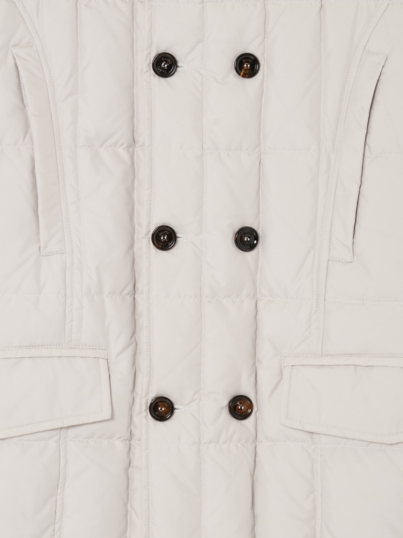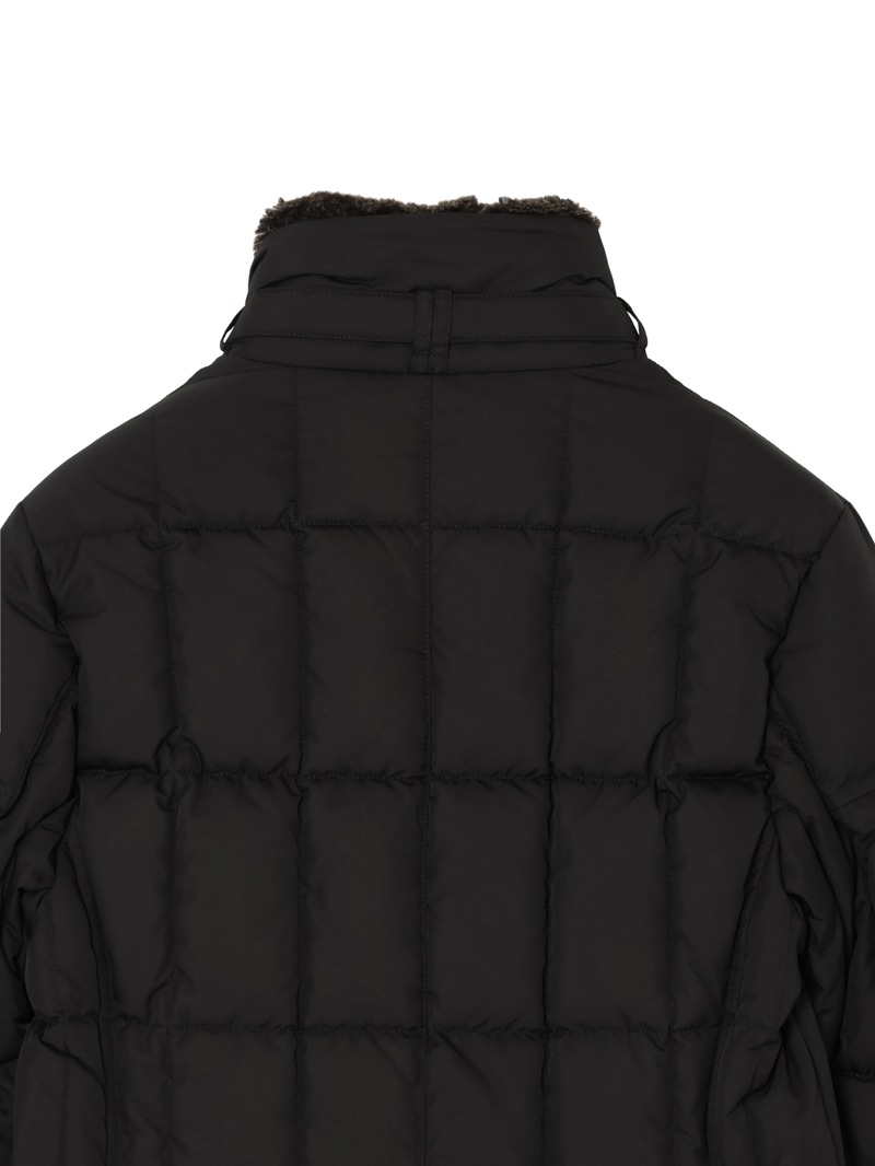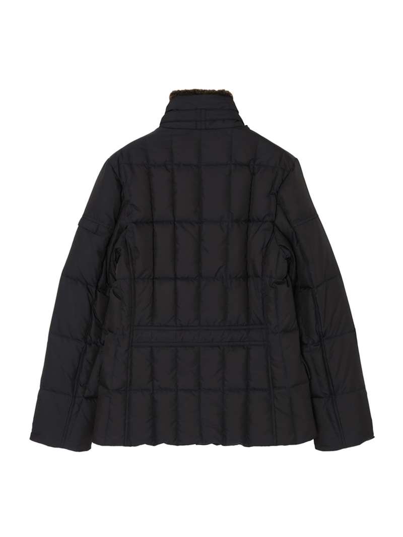 スクエア型のキルティングを施した、ダブルブレストのグースダウンジャケット。光の加減でニュアンス豊かに変化する光沢を持つタフタ織りのギャバジン生地は、形状記憶性と撥水性を備えています。ストラップ留めの襟には取り外し可能なシープスキン付き。シャープでスタイリッシュなシルエットで、カジュアルからドレススタイルまで幅広く対応可できるアイコニックモデルです。