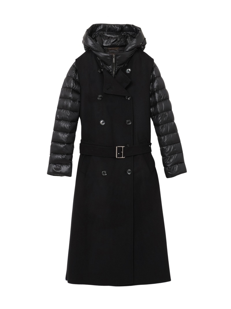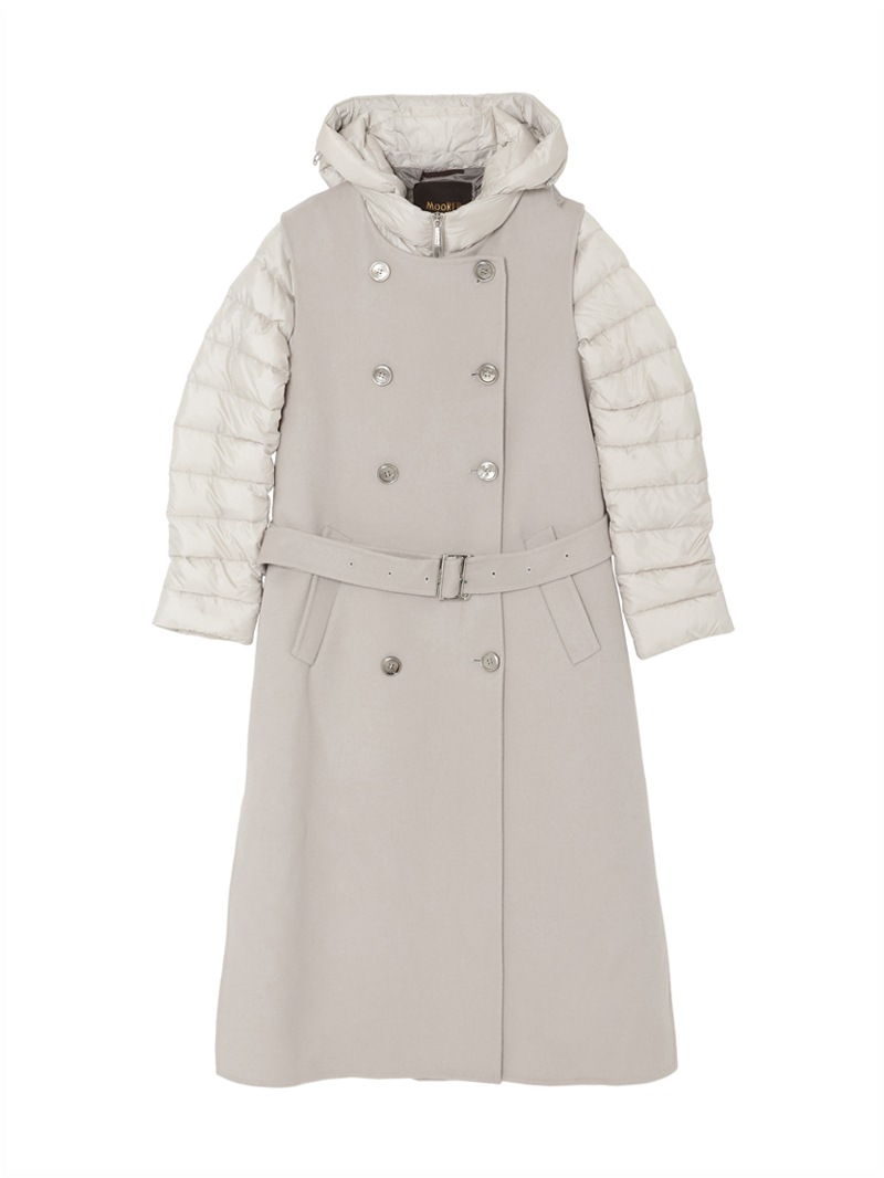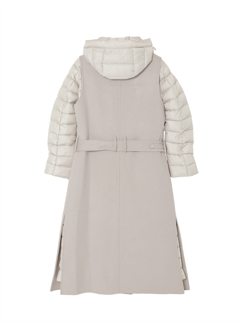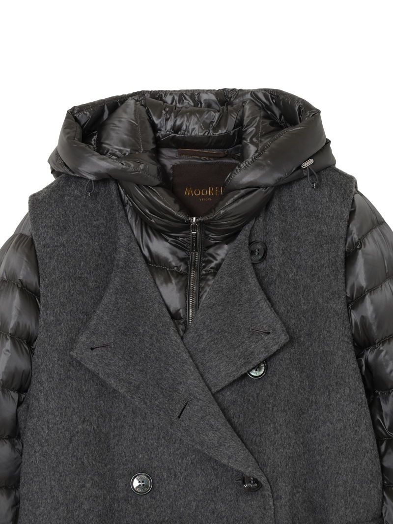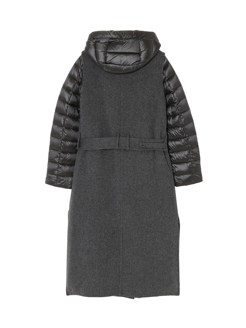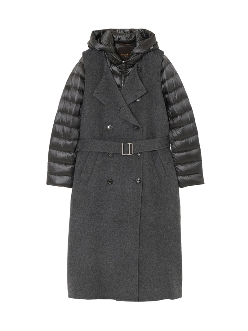 ウールカシミア製のジレと、グースダウンのジャケットを組み合わせたロングコート。それぞれ単体でも、レイヤードしても着用できる3wayアイテムです。