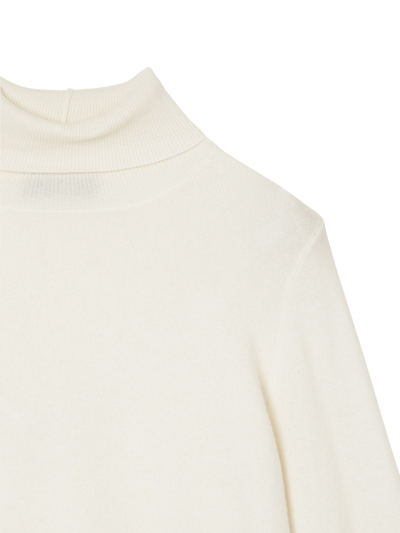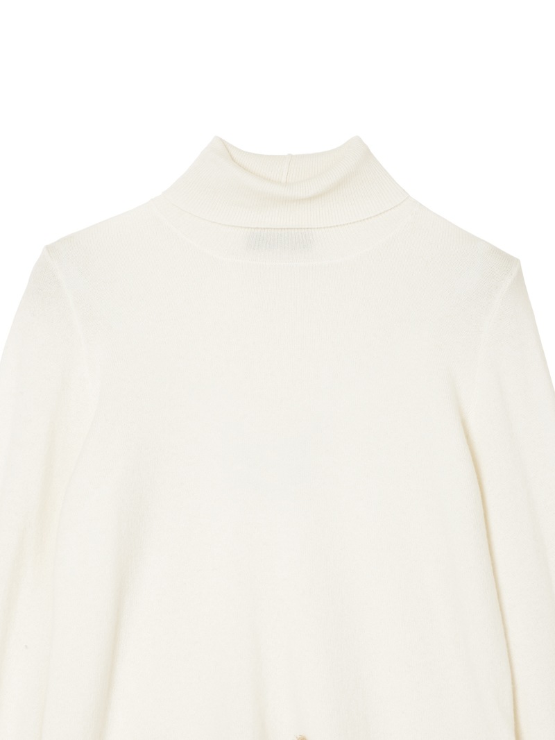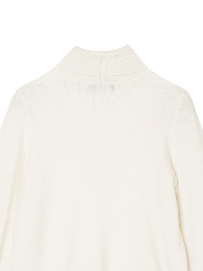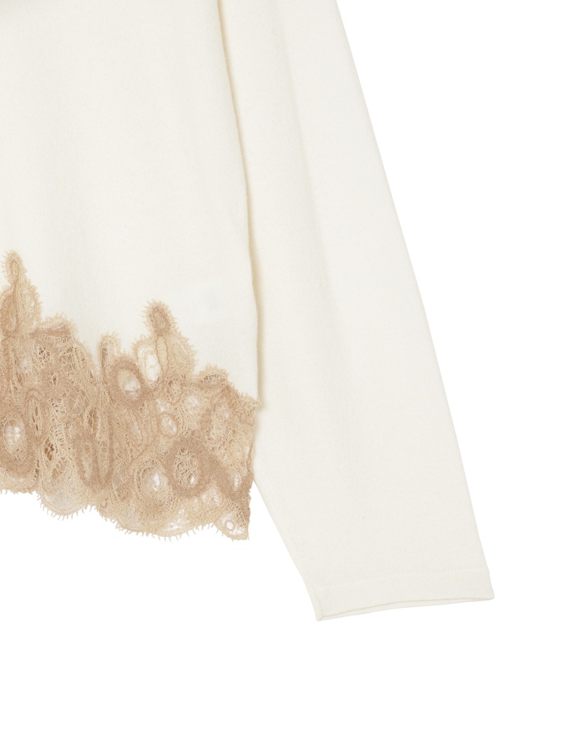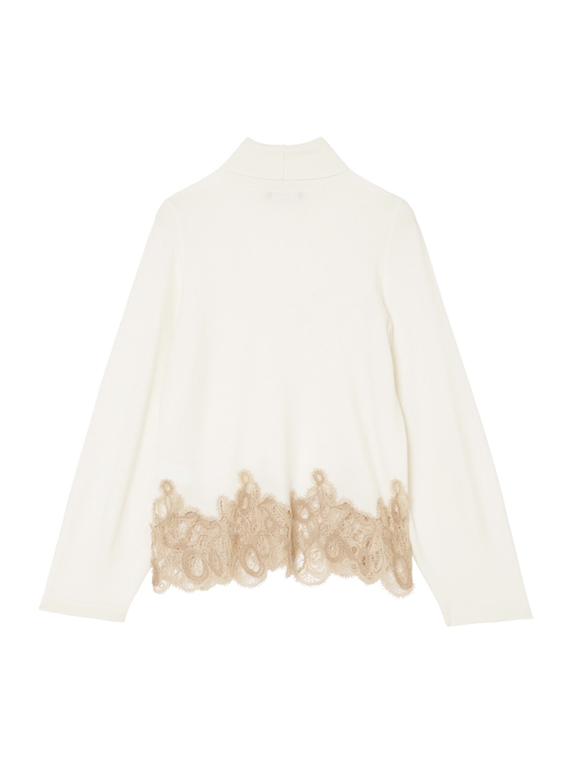 ウール、シルク、カシミヤを贅沢にブレンドした独自の混合糸“プラチナ”を使用し、裾にはさり気ないレースを施したハイネックニット。繊細な光沢としなやかな肌触りが特徴で、エレガントかつ上品な印象を与えます。フィット感のあるシルエットと暖かさを兼ね備え、秋冬のスタイリングに洗練されたアクセントを加える一着です。デイリーからフォーマルシーンまで幅広く活躍します。