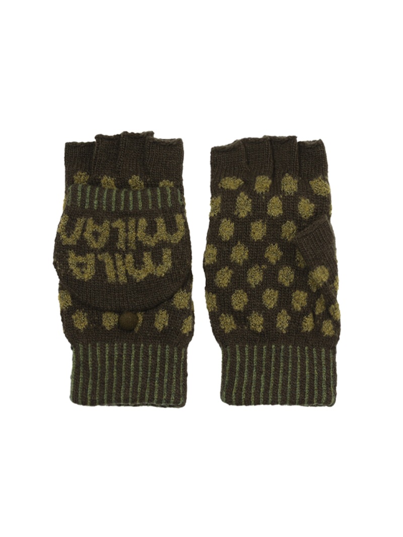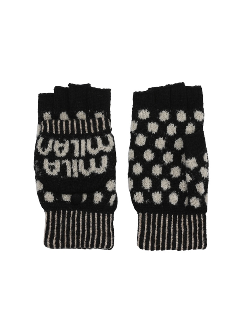 ポップなドット柄とロゴのジャガードが特徴的な、遊び心あふれるデザインの手袋。ミトンとしても、フードを手の甲のボタンで留めてフィンガーレスとしても着用できる2WAY仕様です。