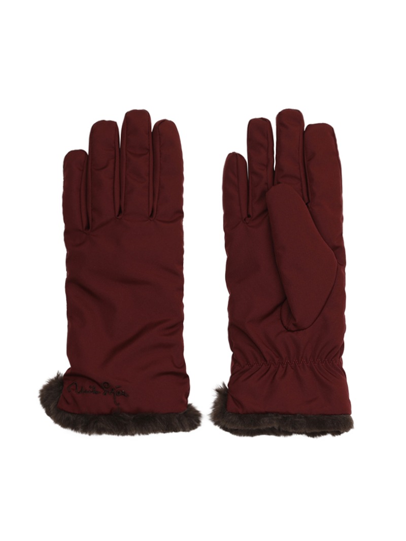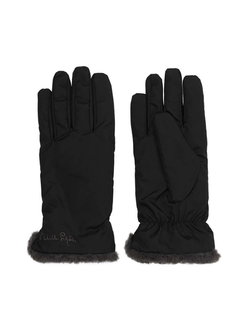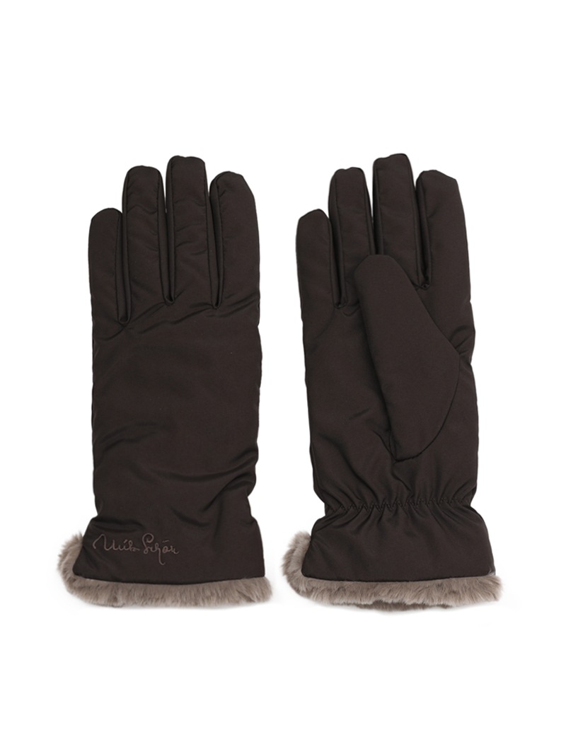 マットなタフタ素材に撥水加工が施された手袋。カフス裏のエコファーが暖かさを保ち、天候を気にせずお使いいただけます。ミラ・ショーンのロゴ刺繍がアクセント。