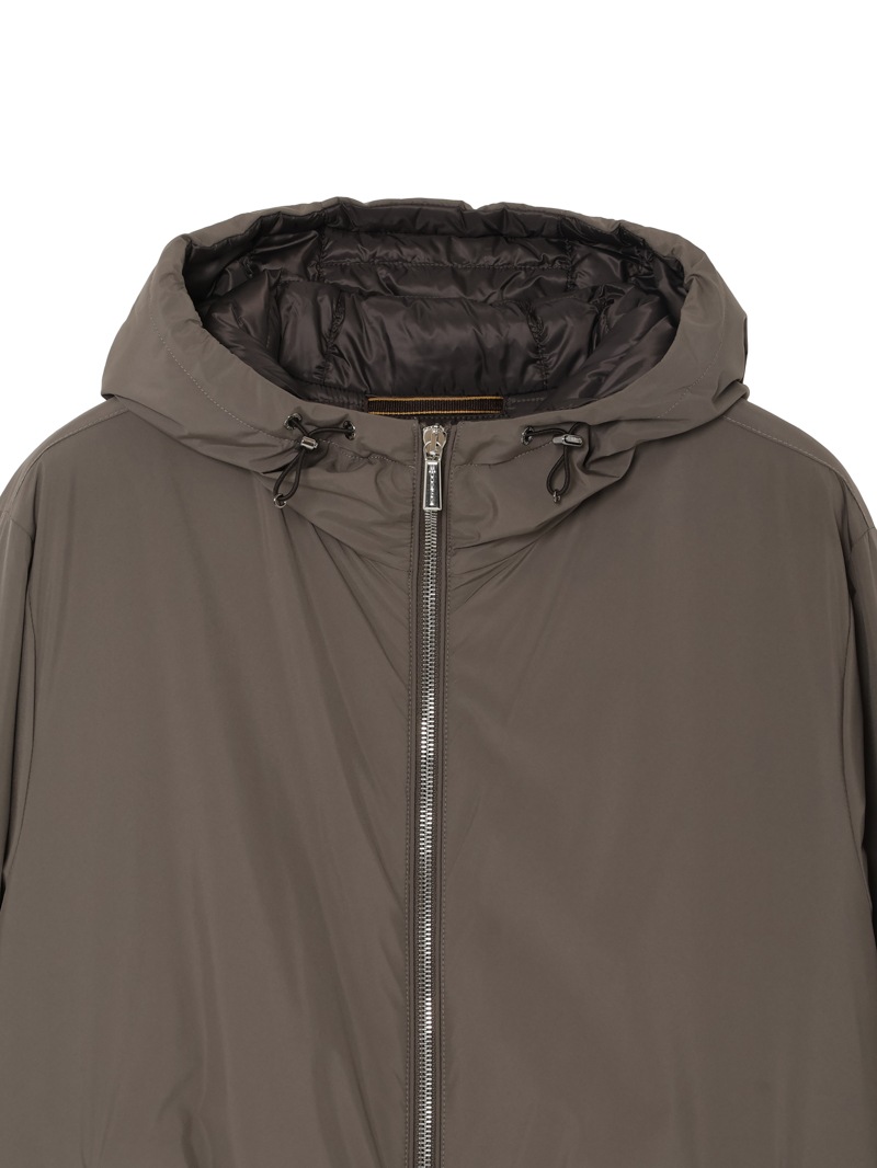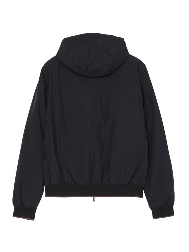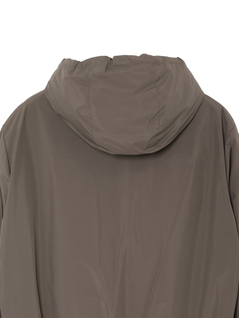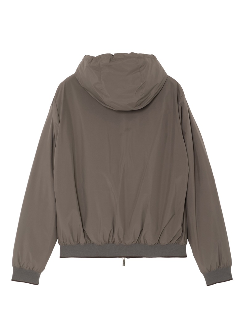 フロントはダブルファスナー開閉で、フードはドローストリングで調節可能。裾と袖口はリブニット仕様。ファスナー付きのサイドポケットと内ポケットを備えています。