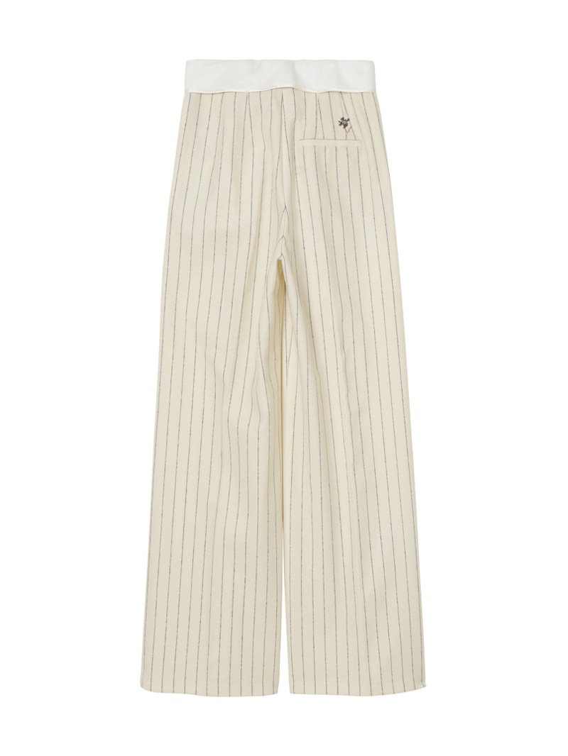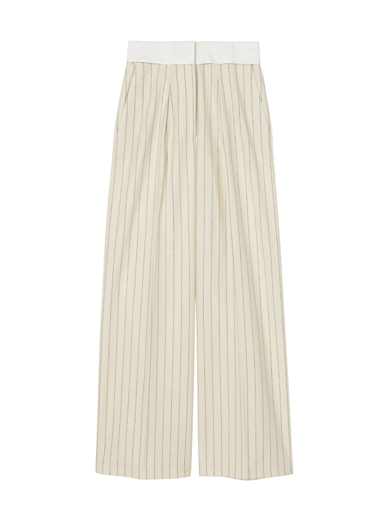 ピンストライプのレトロな魅力が、ロマンチックな装いを演出するテーラードパンツ。折り返されたウエストベルトと、バックポケット上に咲く一輪の“en fleur”刺繍が特徴。ウール混素材がやわらかさと温かみを添えます。ややワイドなストレートフィットで、ハイウエストにタックを入れ端正なシルエットに仕上げています。