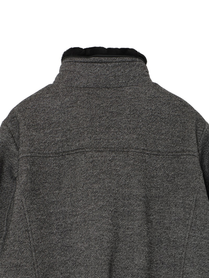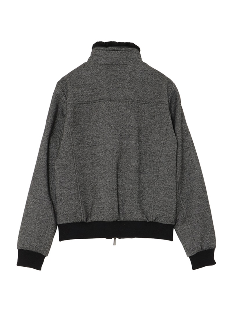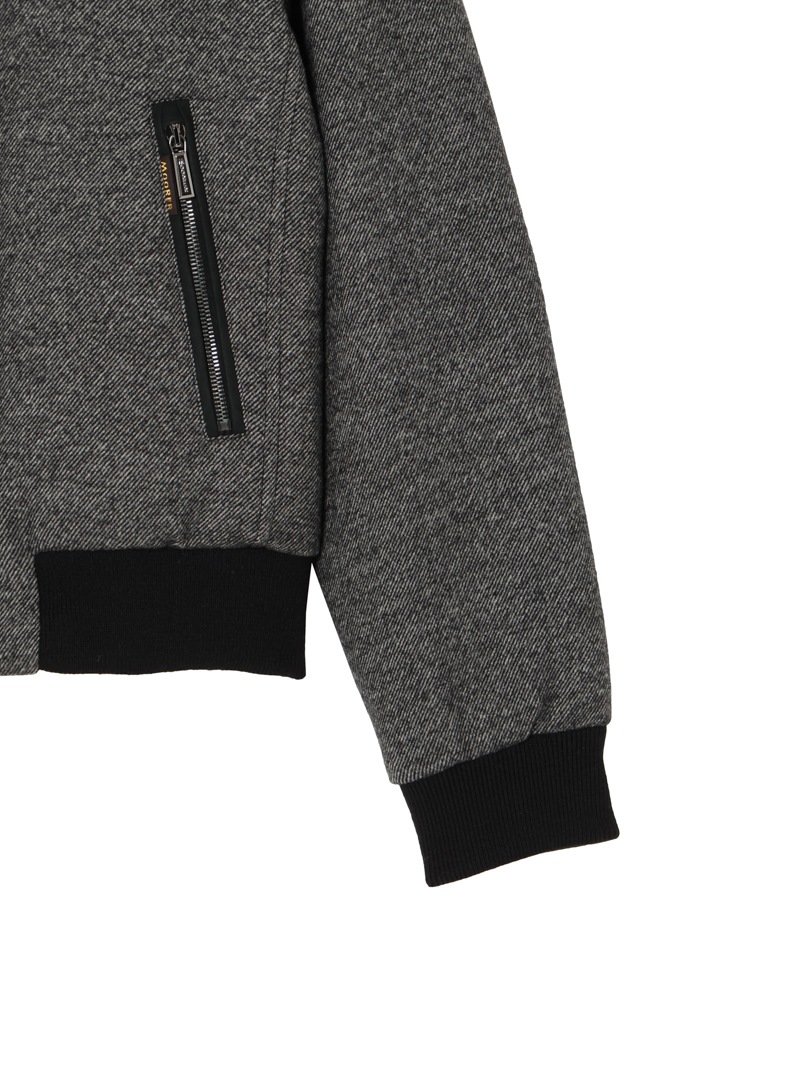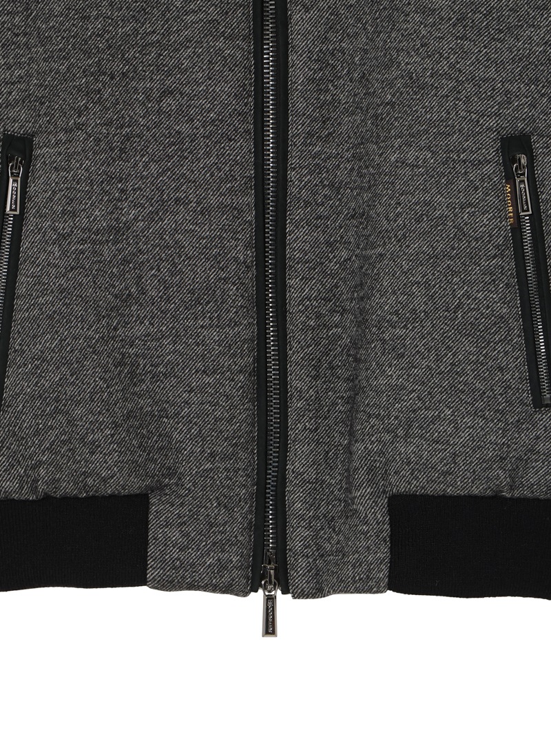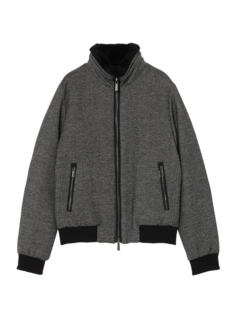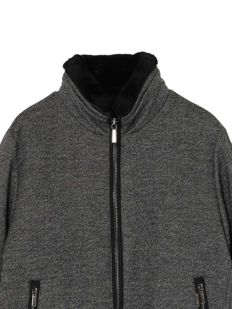 グースダウンの入ったボンバージャケット。斜線状の綾目が美しいバージンウール100%のメランジ生地を使用した、柔らかく暖かな風合い。襟に配したオーストラリア産ムートンファーは取り外し可能。ポケットやフロントファスナーの縁は、シープスキンスウェードでトリミングしています。