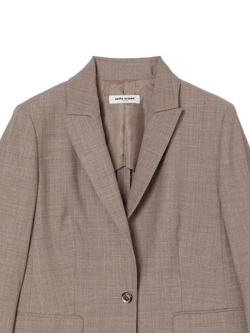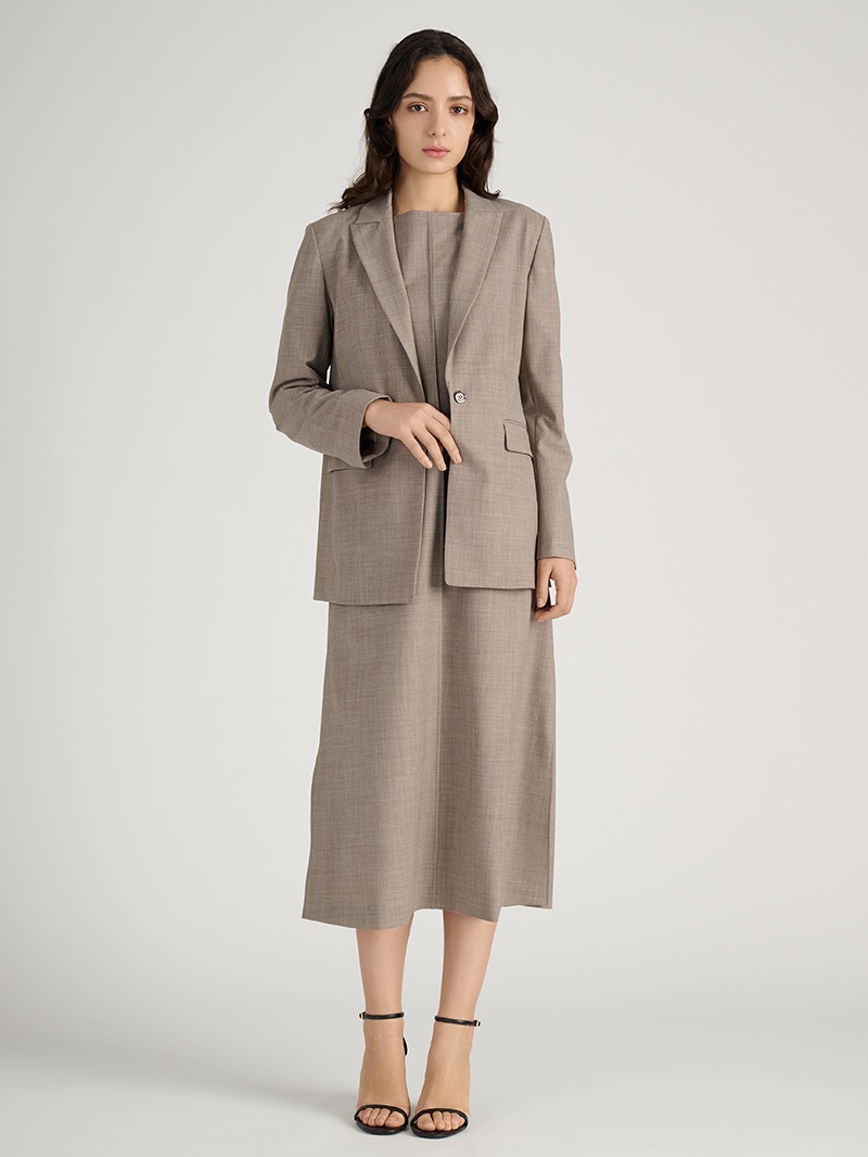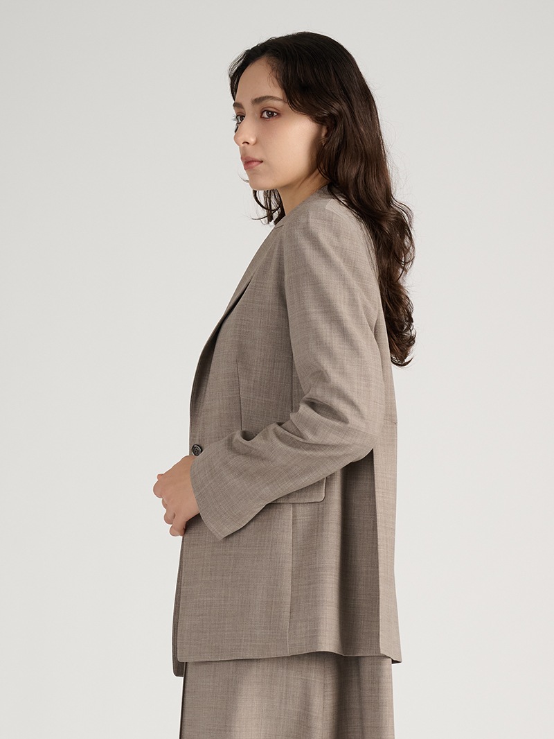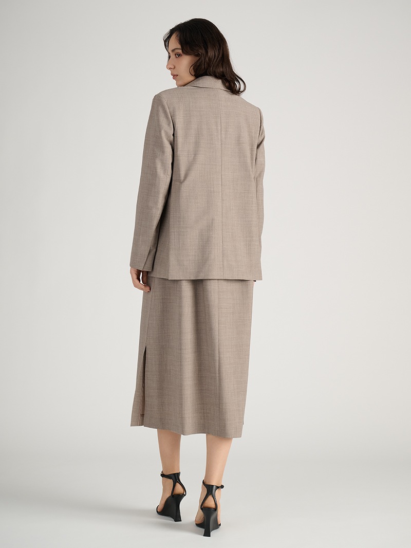 オーストラリアのファインメリノウールとリサイクルポリエステルをブレンドしたジャケット。しなやかでふくらみのある風合いに加え、接触冷感、消臭、2WAYストレッチ、防シワ性も兼ね備えた多機能素材を使用しています。同素材のワンピースとのセットアップスタイルもおすすめです。
