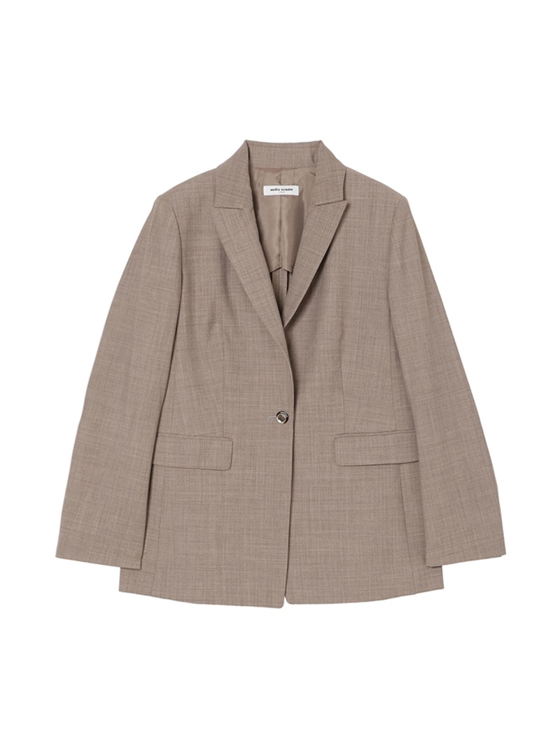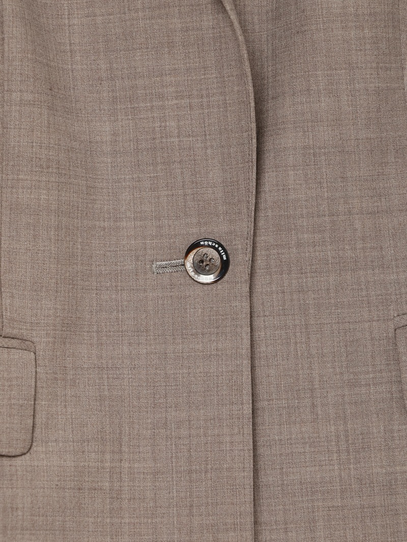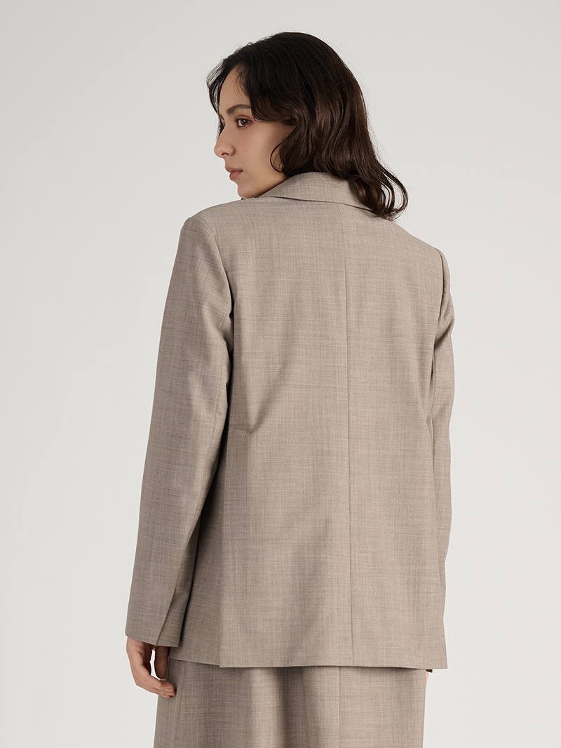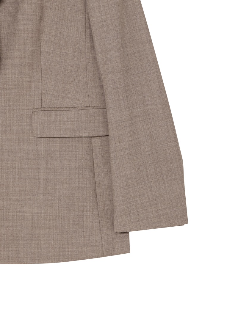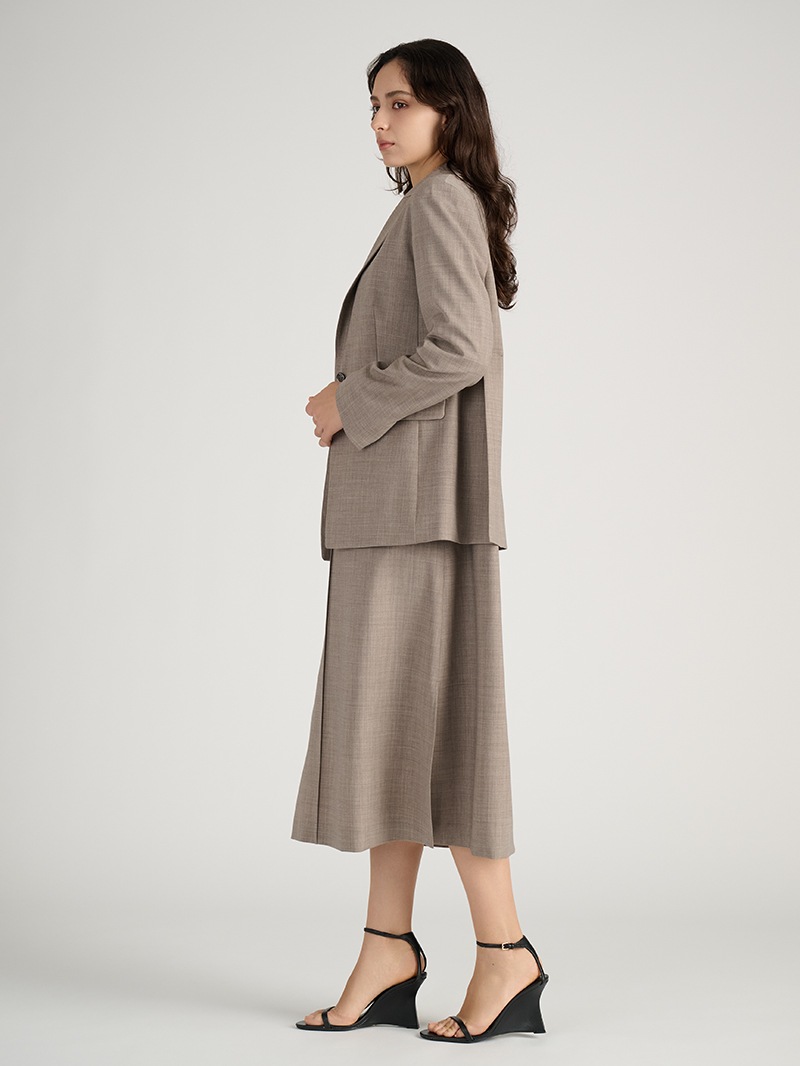 オーストラリアのファインメリノウールとリサイクルポリエステルをブレンドしたジャケット。しなやかでふくらみのある風合いに加え、接触冷感、消臭、2WAYストレッチ、防シワ性も兼ね備えた多機能素材を使用しています。同素材のワンピースとのセットアップスタイルもおすすめです。