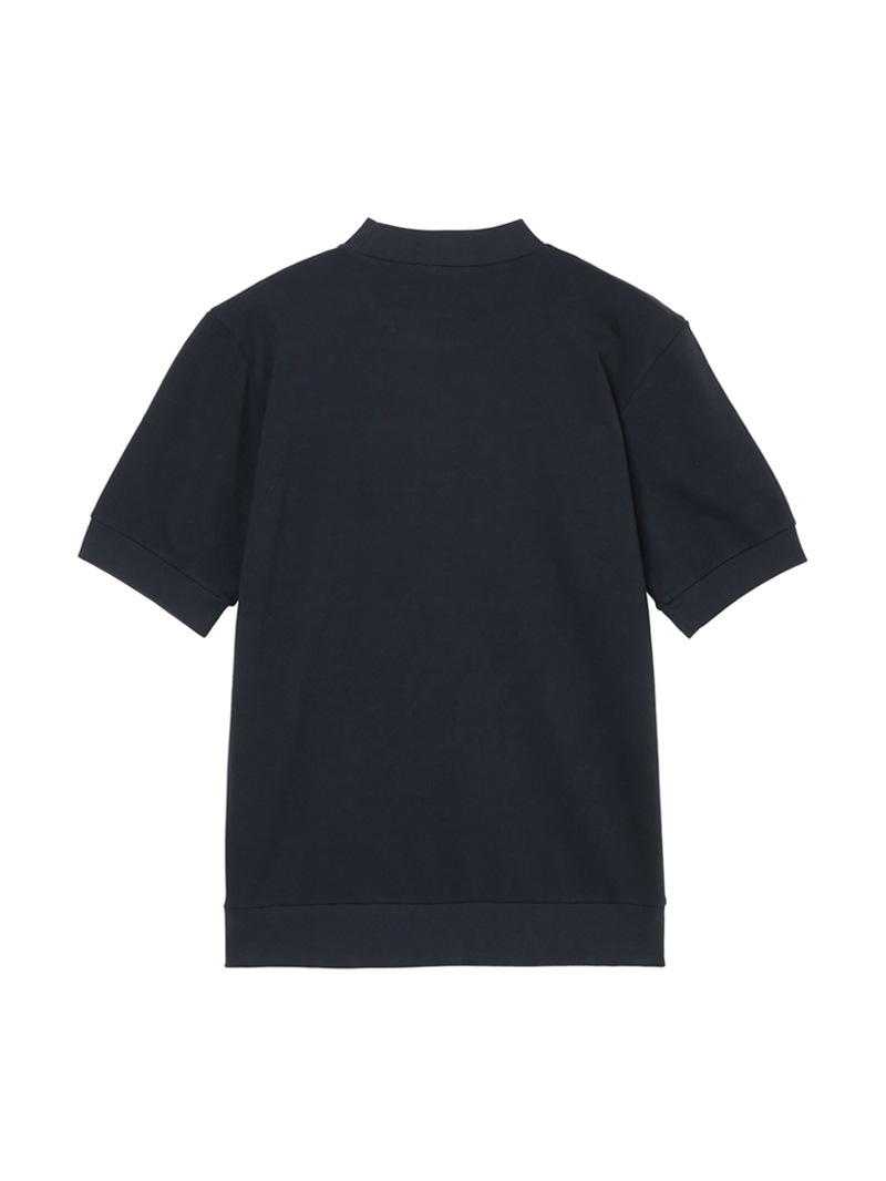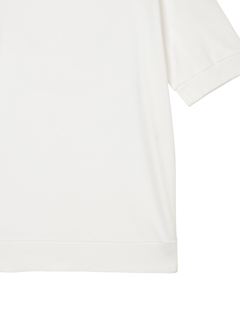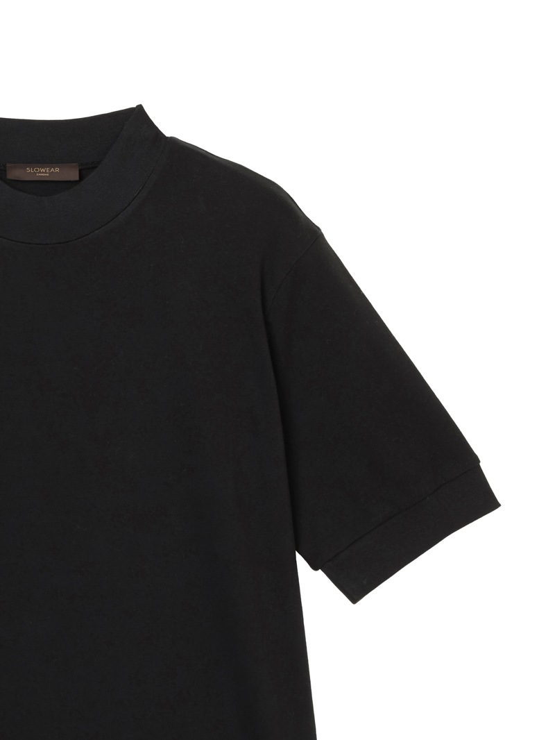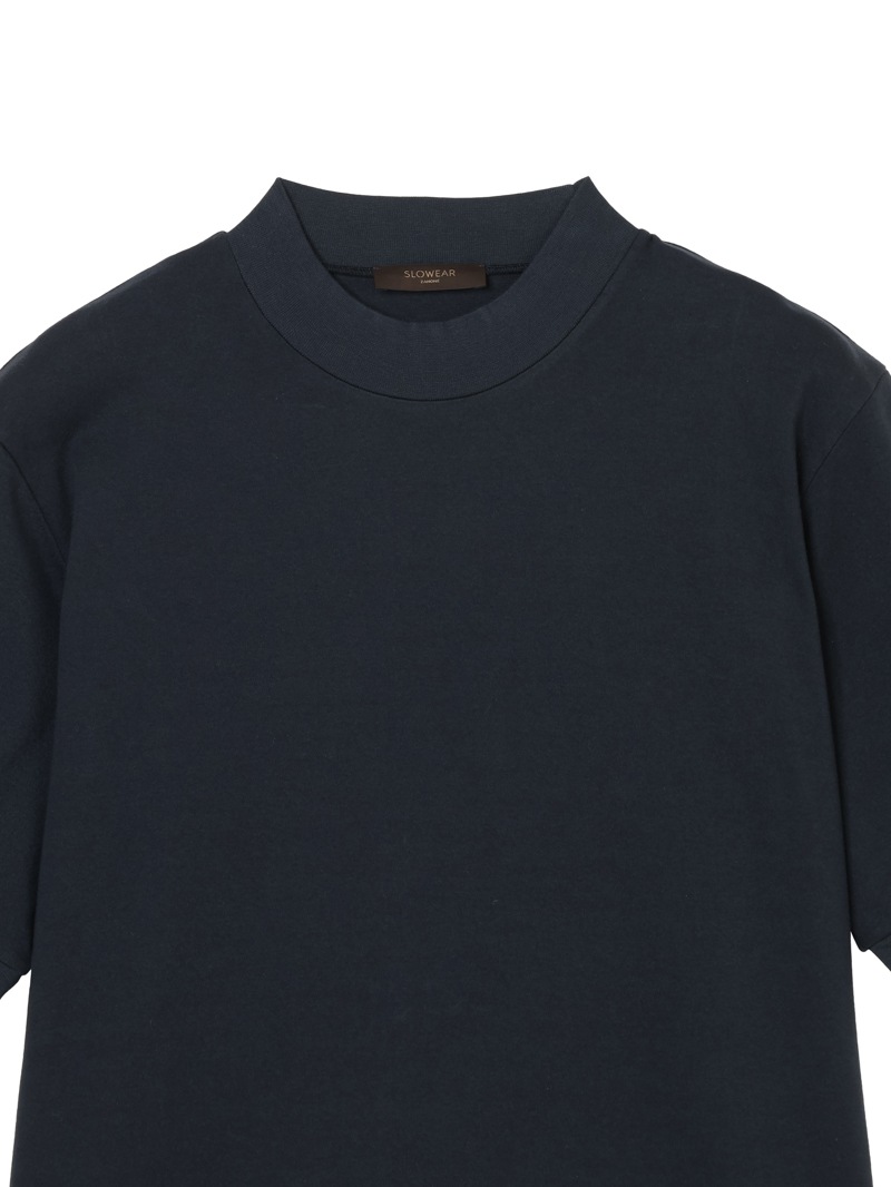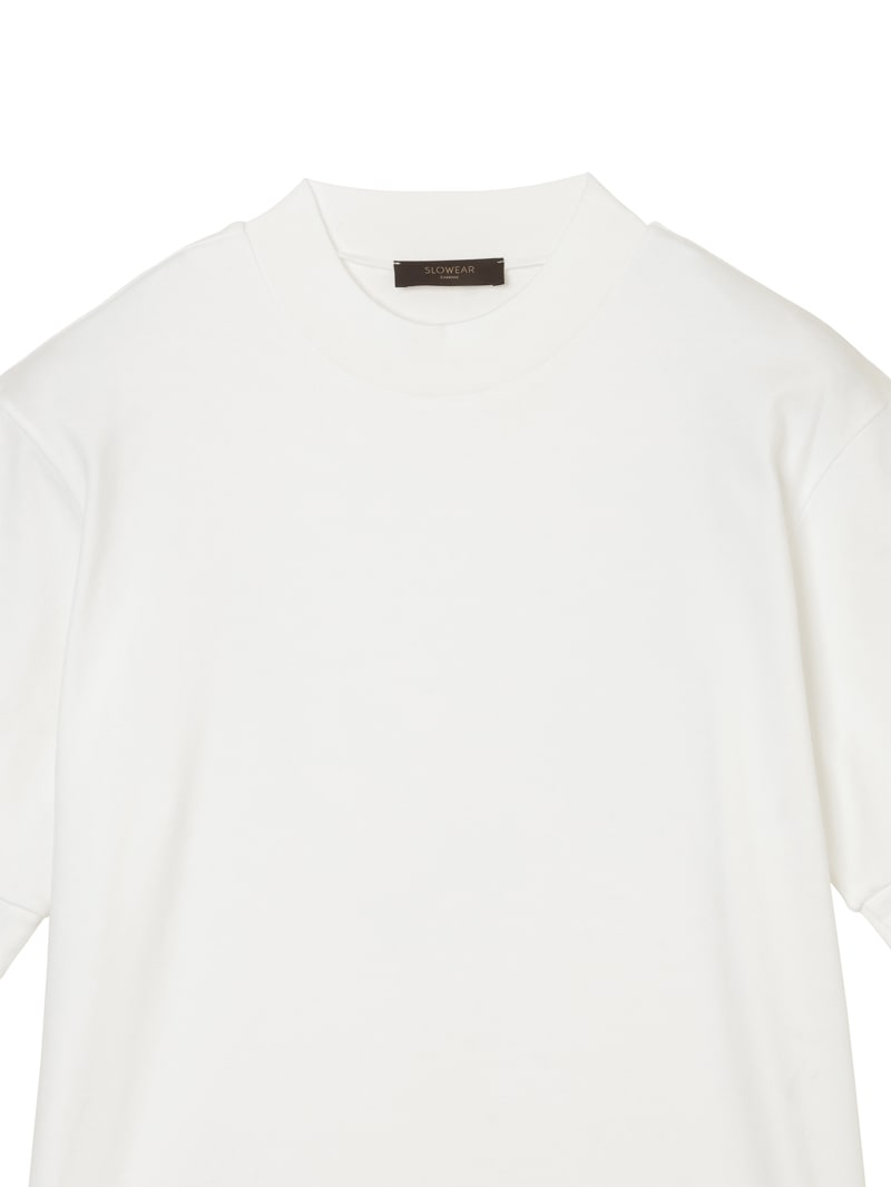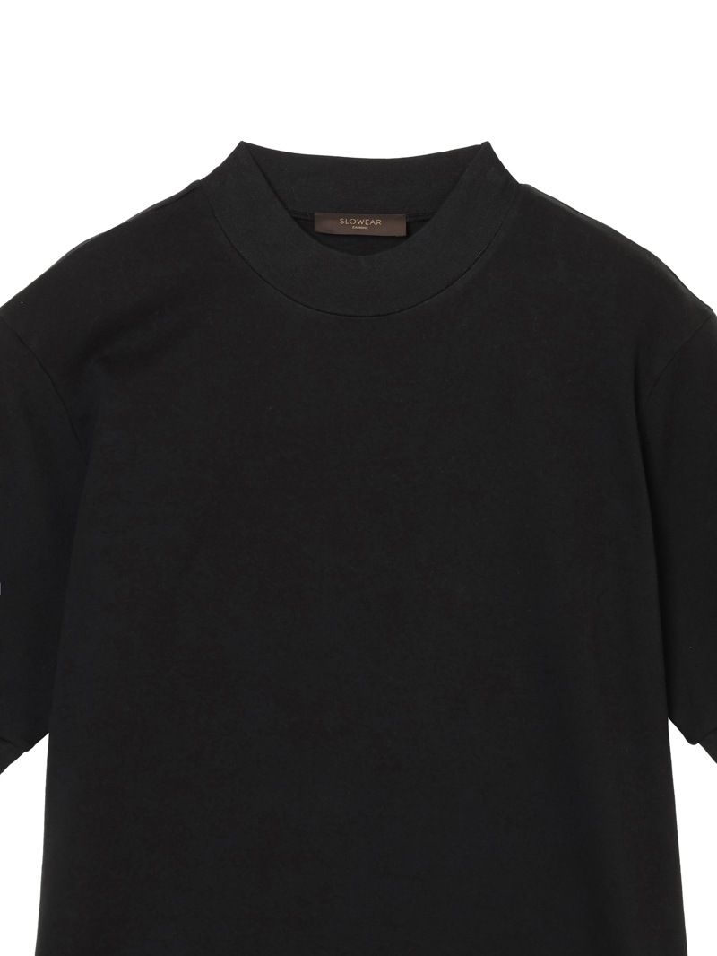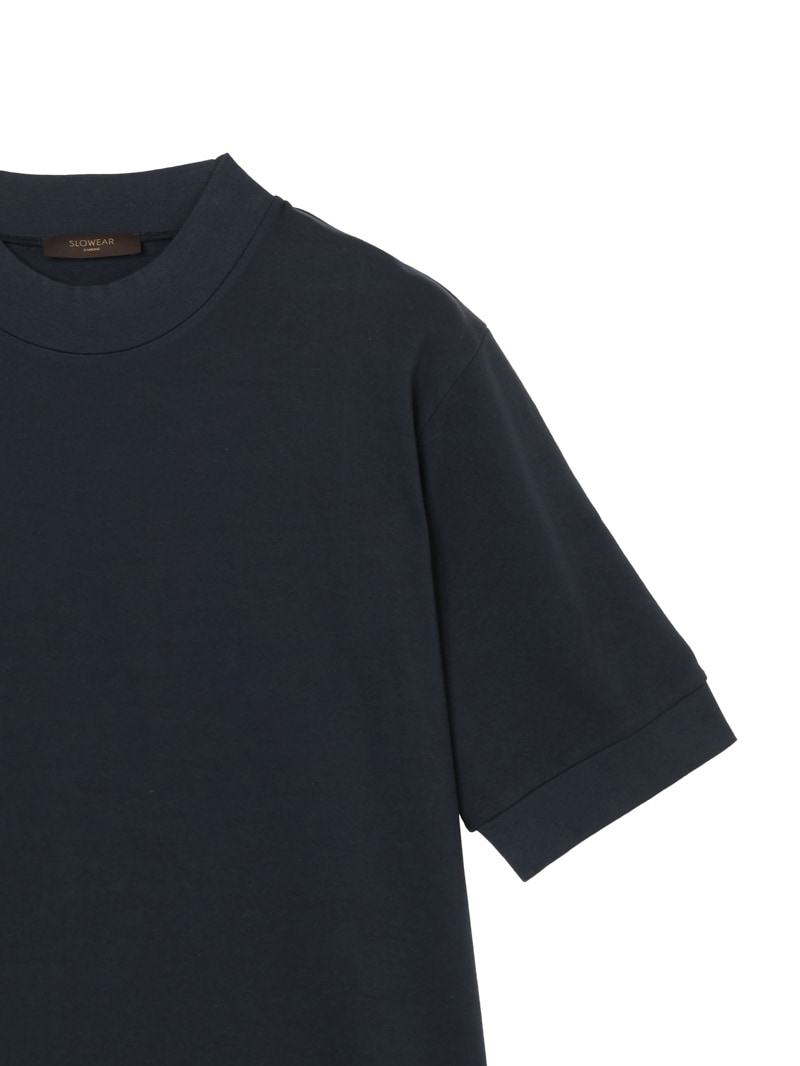 日本国内のみで展開するモックネックTシャツ。なめらかなピュアコットンジャージーを使用し、襟ぐり・袖口・裾をリブ編みで仕上げたミニマルな一着。