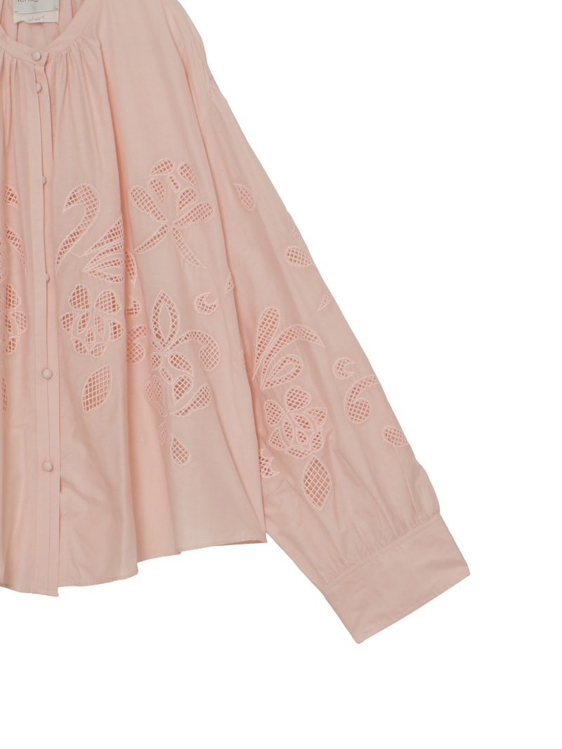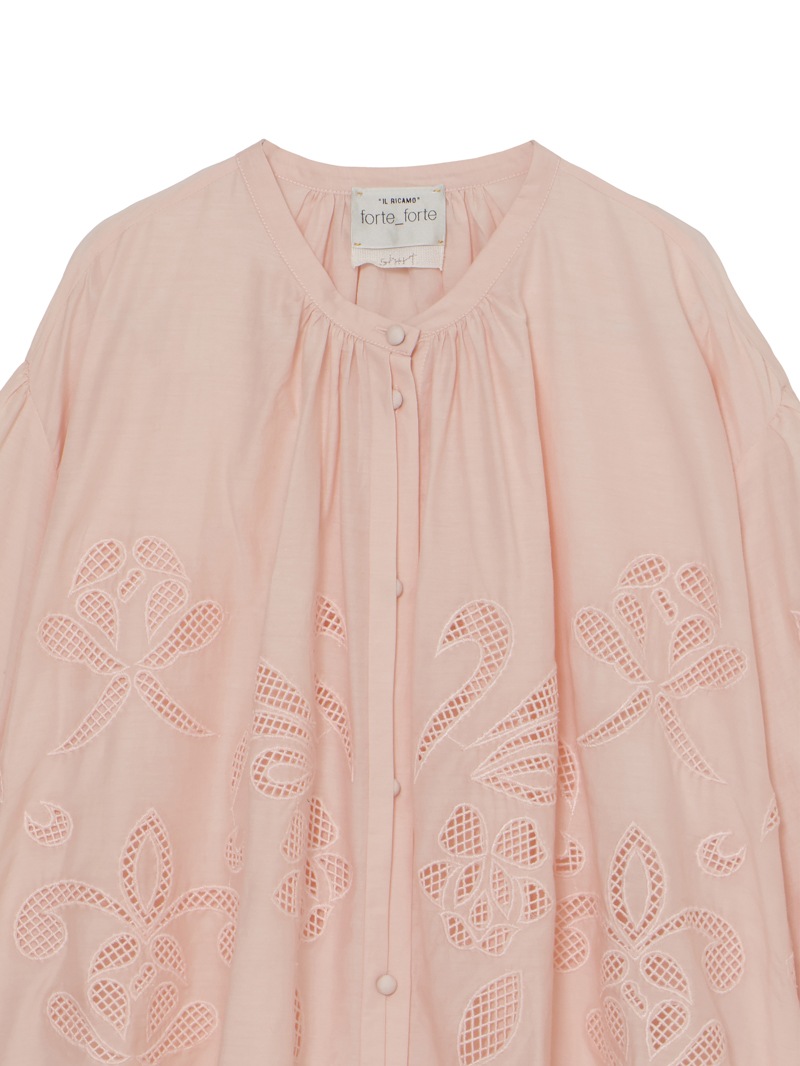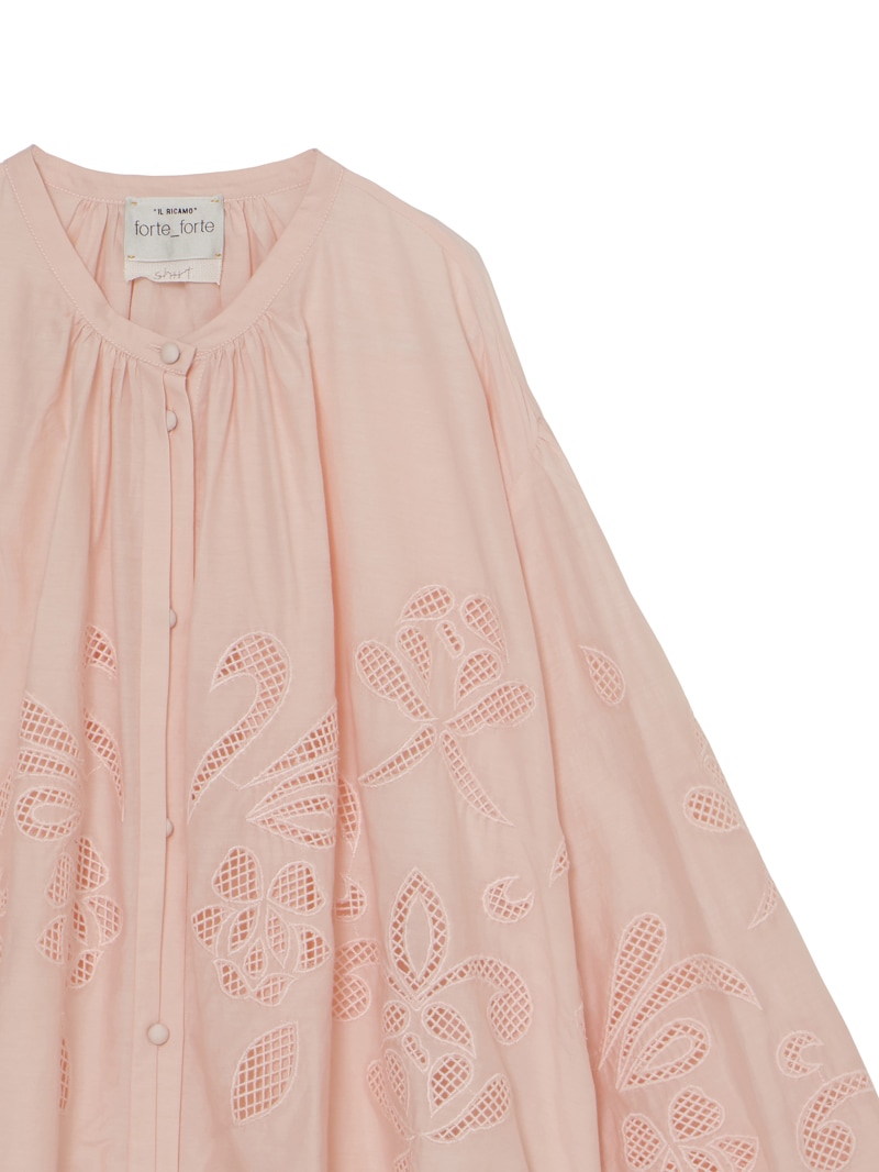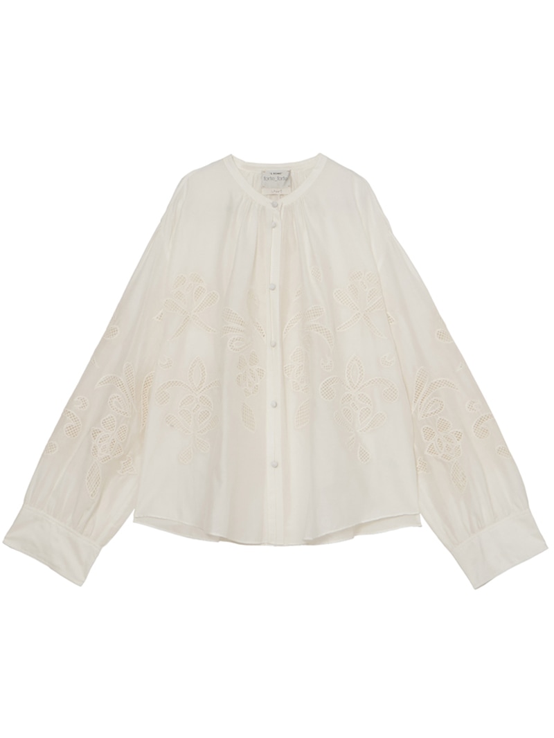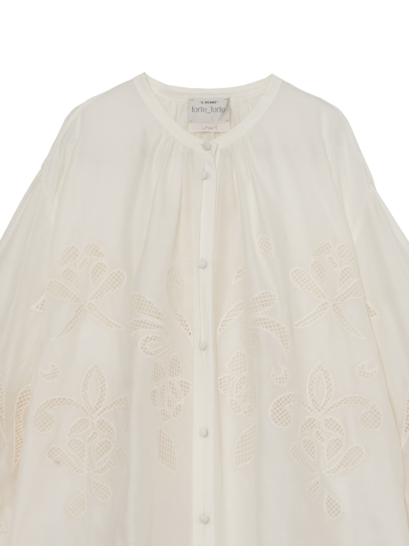 繊細な“lunamaris”刺繍を施した、軽やかなコットンシルクボイル素材のボヘミアンシャツ。貝殻、アイリス、ピオニーのモチーフを、インドの伝統的な白糸刺繍で表現。潮の満ち引きによってそっと姿を現す海の秘密のように、職人によってひと針ずつ紡ぎ出されたオープンワーク刺繍が、ほのかなセンシュアリティを添えます。forte_forteを象徴するルーズシルエット・ギャザーネックのボヘミアンシャツに、詩的なストーリーを秘めたアイテムです。