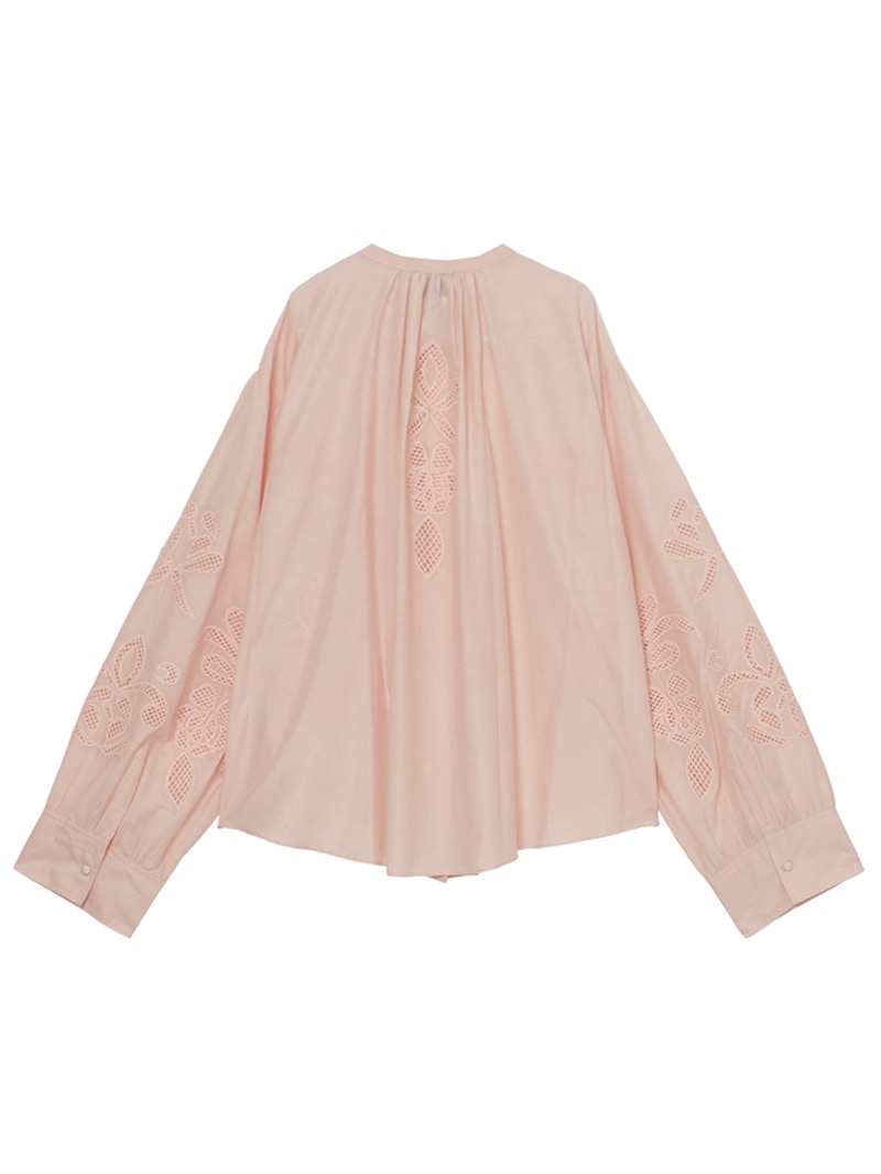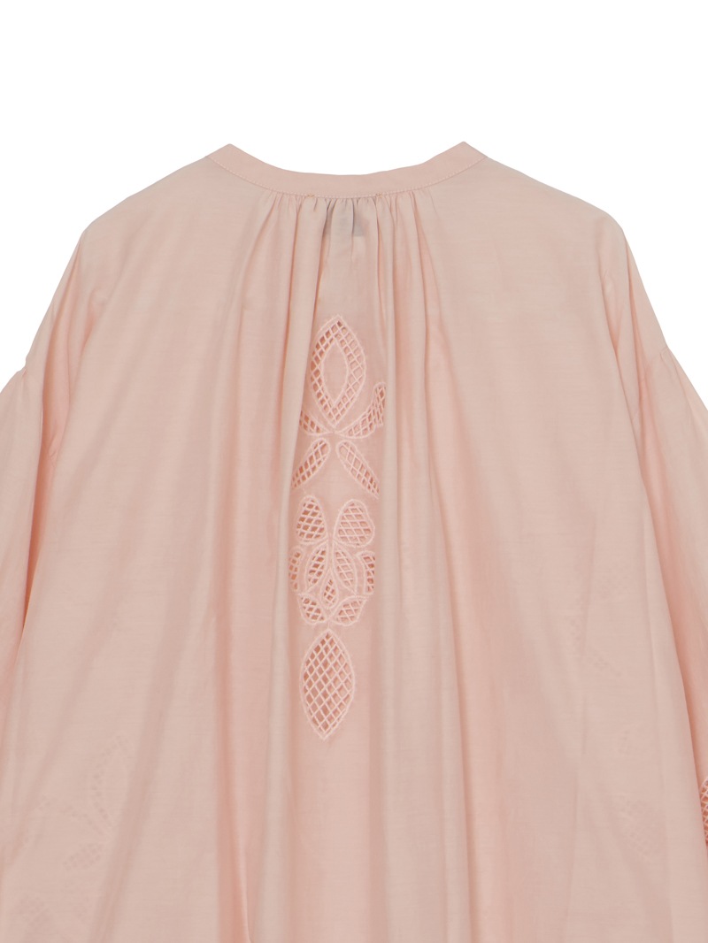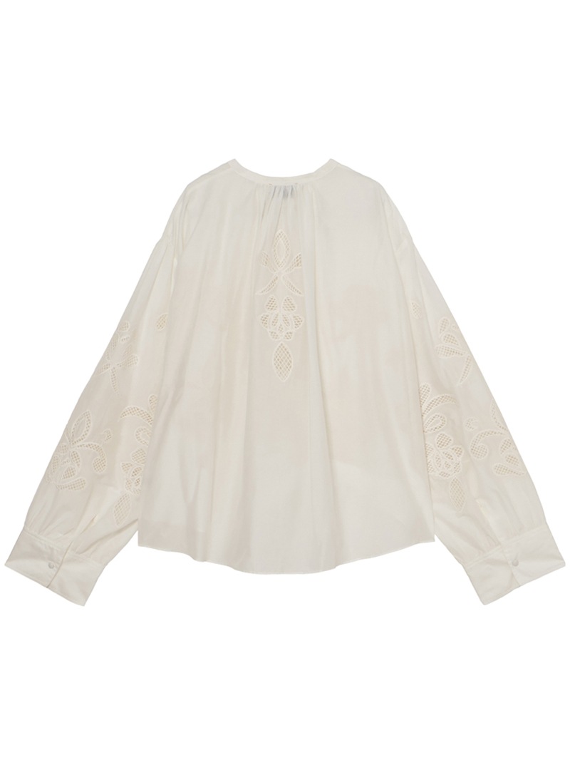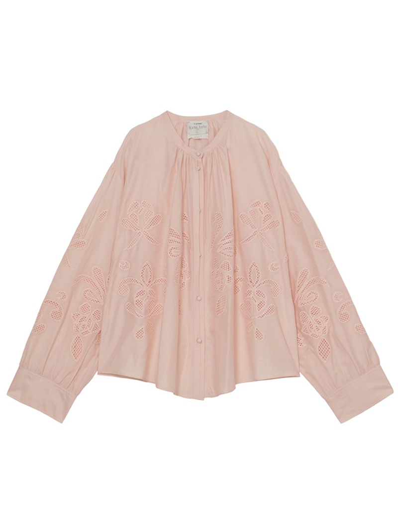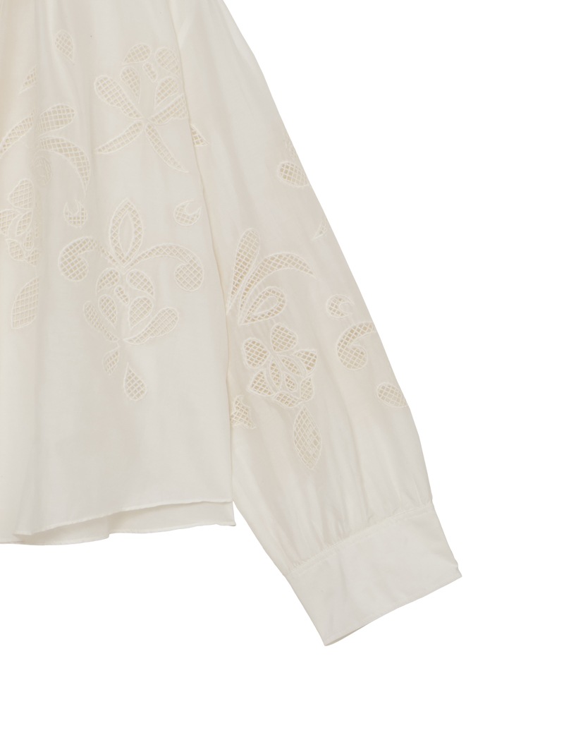 繊細な“lunamaris”刺繍を施した、軽やかなコットンシルクボイル素材のボヘミアンシャツ。貝殻、アイリス、ピオニーのモチーフを、インドの伝統的な白糸刺繍で表現。潮の満ち引きによってそっと姿を現す海の秘密のように、職人によってひと針ずつ紡ぎ出されたオープンワーク刺繍が、ほのかなセンシュアリティを添えます。forte_forteを象徴するルーズシルエット・ギャザーネックのボヘミアンシャツに、詩的なストーリーを秘めたアイテムです。