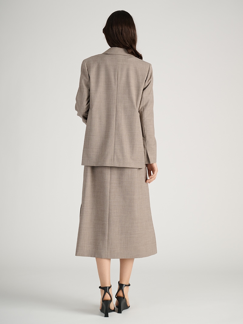 オーストラリア産ファインメリノウールとリサイクルポリエステルをブレンドした、機能性と上質感を兼ね備えた素材を採用。 しなやかで膨らみのある風合いと、表情豊かなディテールが際立つ美しいセットアップです。着心地の良さと、洗練された佇まいを両立した、大人のスタイルに仕上げました。