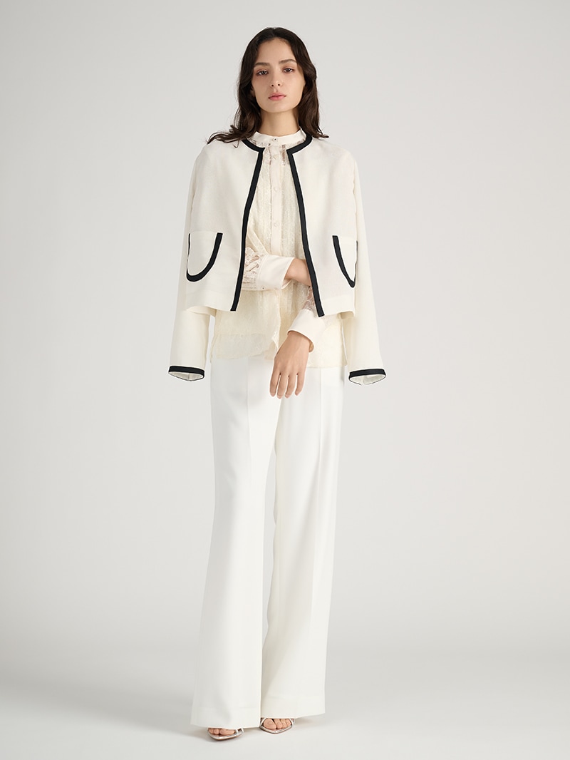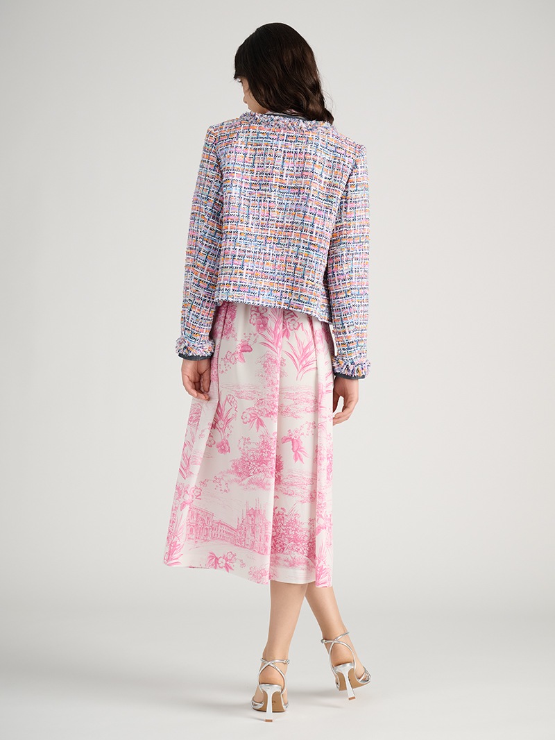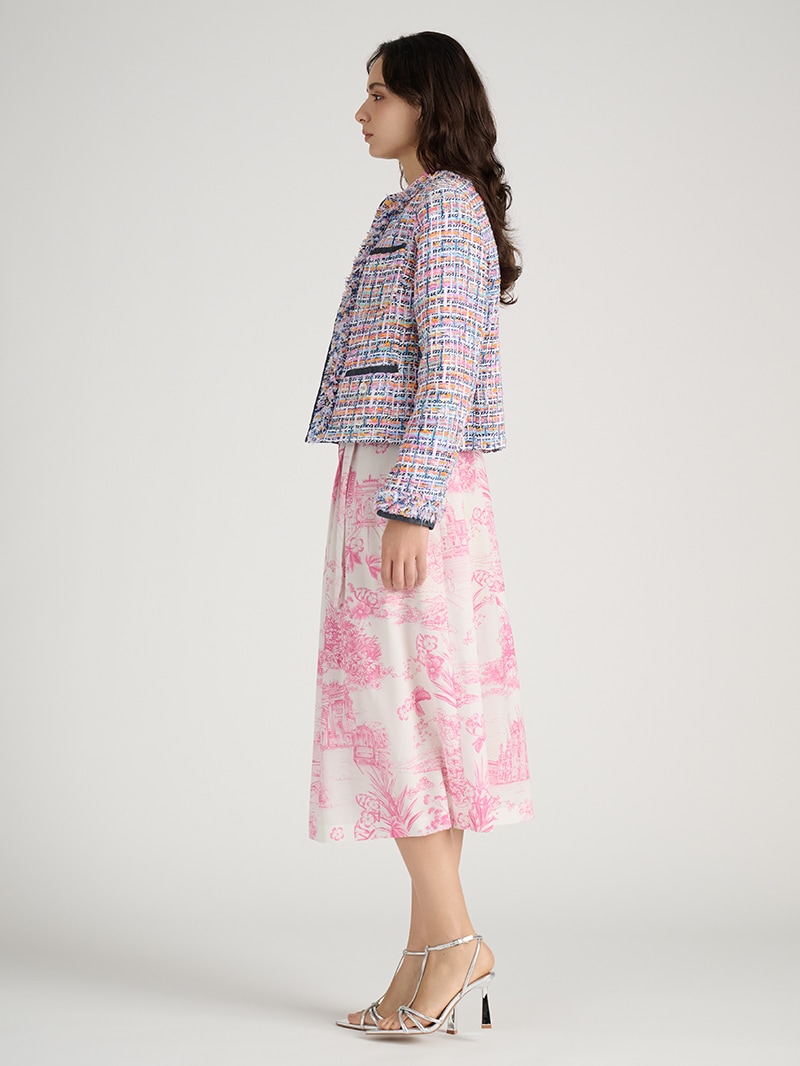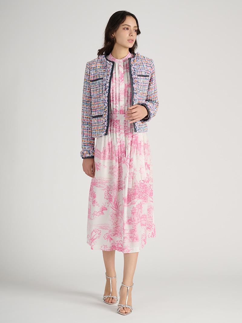 フランス「MALHIA KENT(マリア・ケント)」社製のツイード素材を贅沢に使用したジャケット。グラデーションカラーやゼブラ調の意匠糸が織り込まれ、特別感のある生地が上質な印象を与えます。イタリアの街並みを繊細に描いたプリントワンピースと組み合わせて、異素材ミックスならではの洗練と華やかさが際立つスタイルに仕上げました。