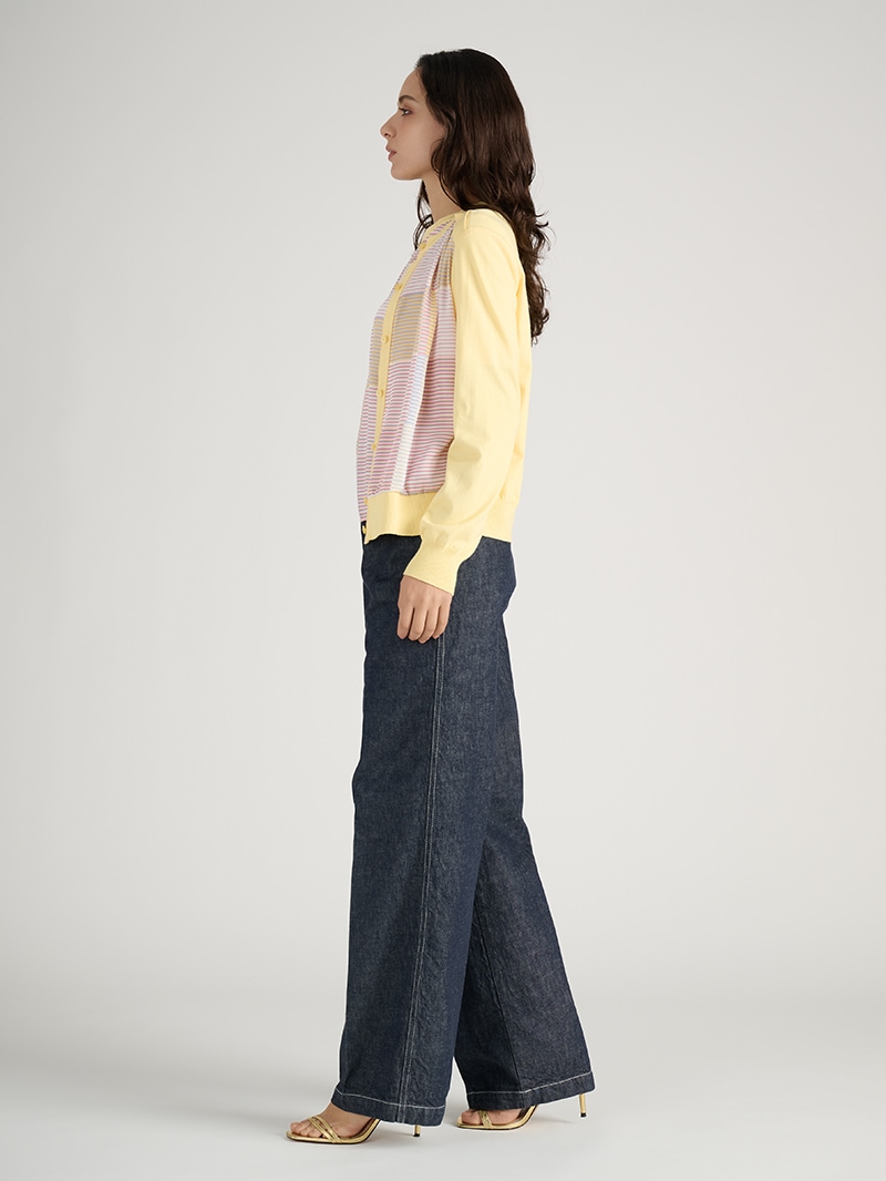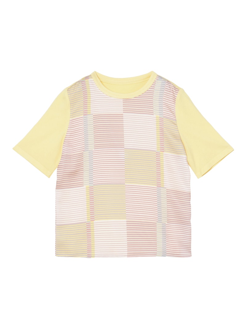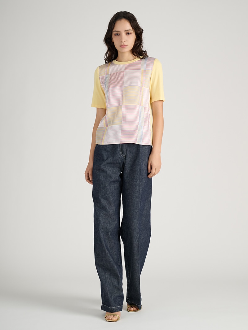 上品な光沢感のあるツイル素材「イタリア(エリカ)社製」のプリントを使用。伝統的な市松模様をグラフィカルに表現し、ボーダー柄でモダンな印象にアップデート。流行のイエローを差し色に、デニムパンツを合わせることで、春らしい爽やかさと洗練された雰囲気が際立つコーディネートです。
