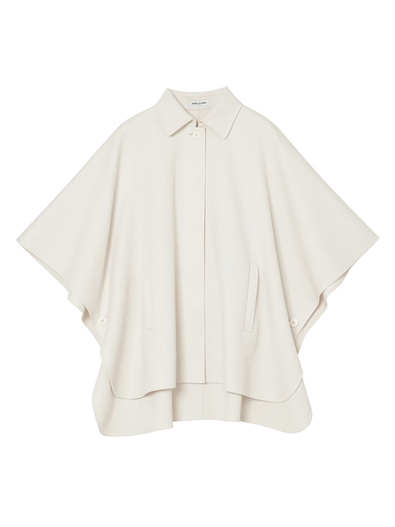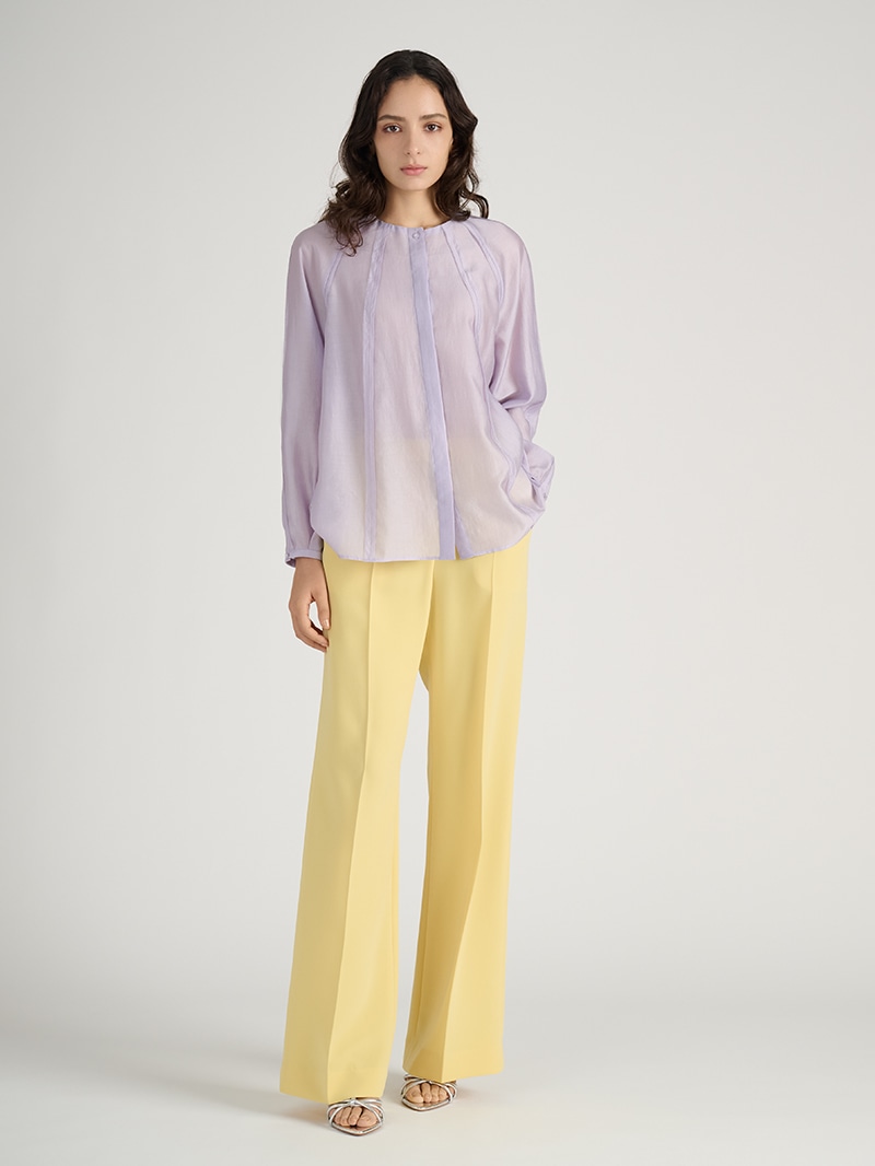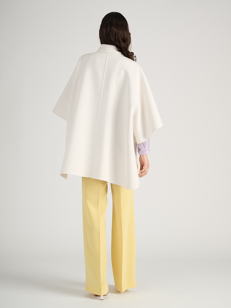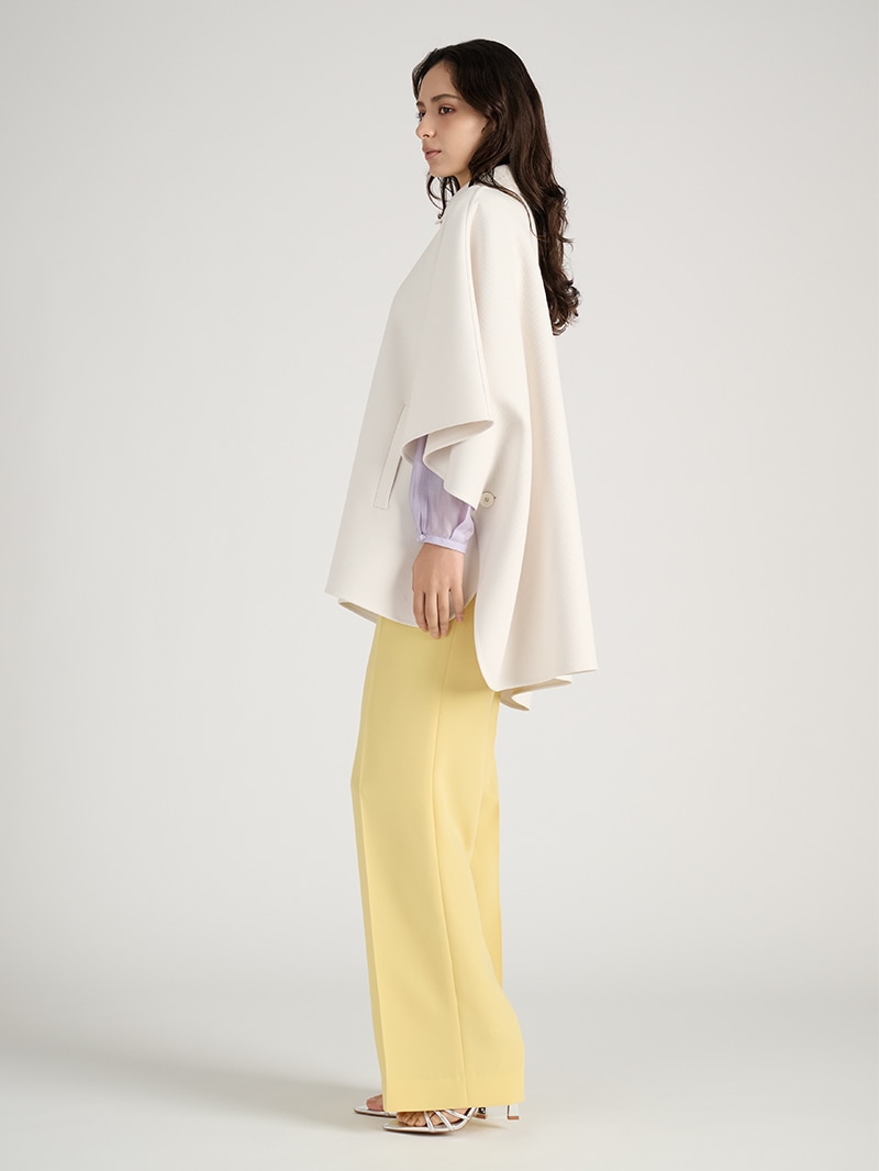 膨らみ・ストレッチ性・軽さを兼ね備えたカルゼ素材のポンチョ風コート。エアリーなパープルのブラウスとイエローのパンツが、春らしいカラーミックスをさりげなく演出します。素材感と色使いのコントラストが洗練された華やかさを添える、上品なコーディネートです。