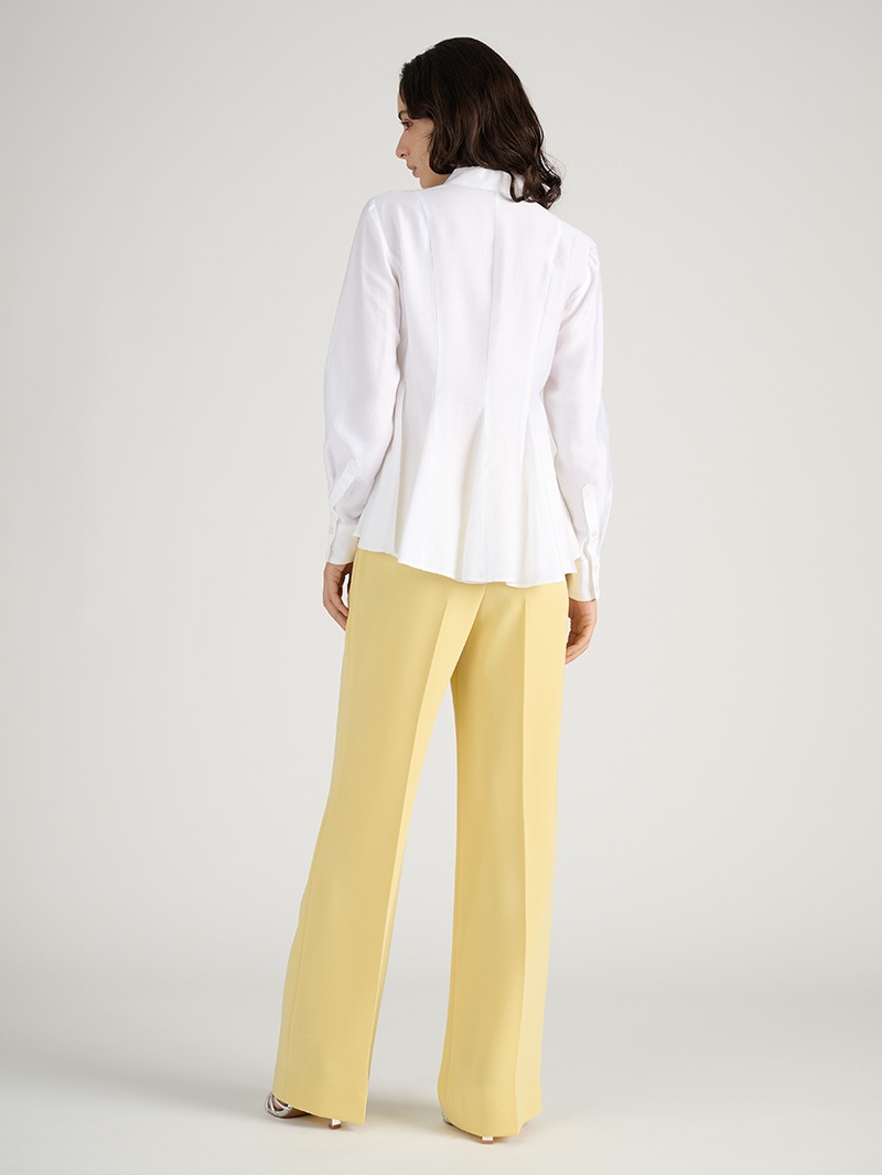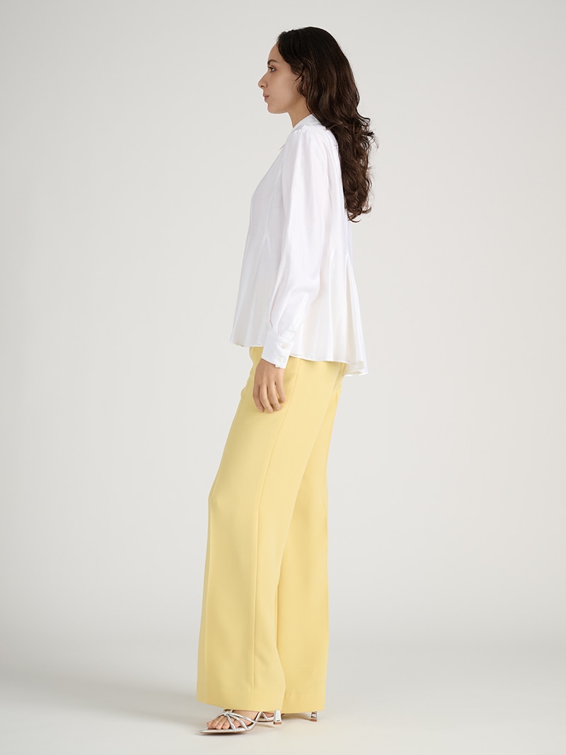 マチ使いが印象的なペプラムブラウスに、今春注目のイエローパンツを合わせた爽やかなコーディネート。2WAYナチュラルストレッチ素材ならではの快適な着心地、美しいシルエットを両立しています。春の陽射しに映えるカラーと、洗練されたディテールが、上品で知的な雰囲気を演出します。