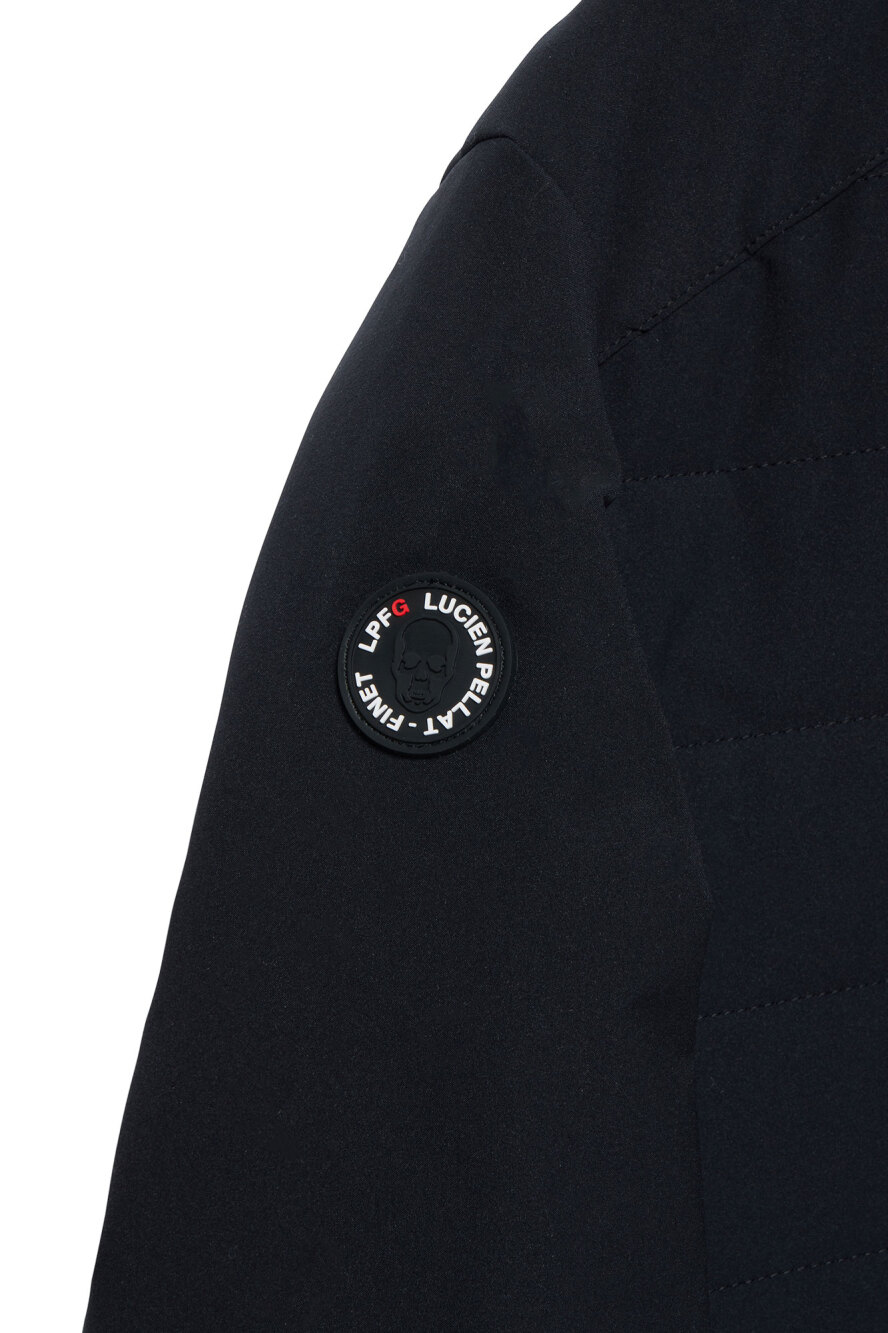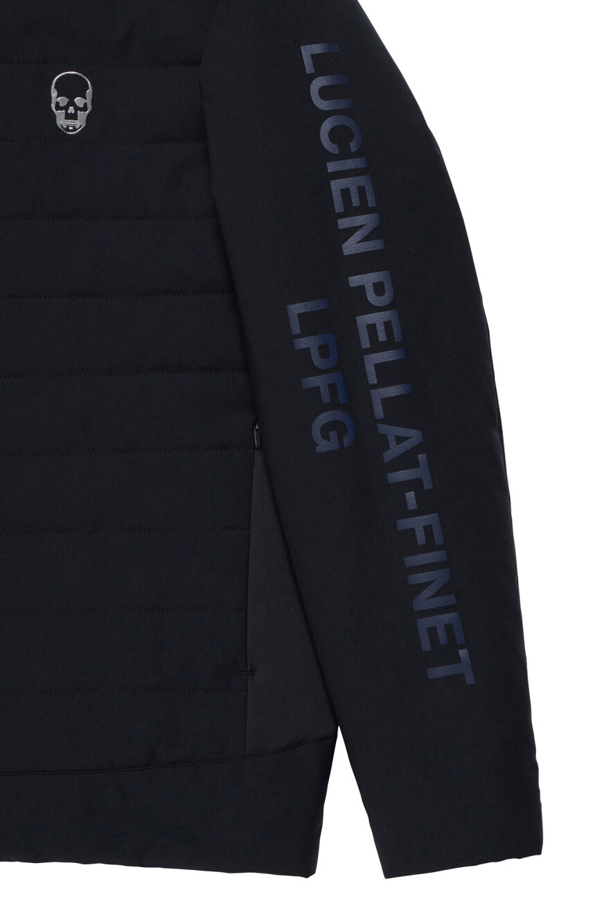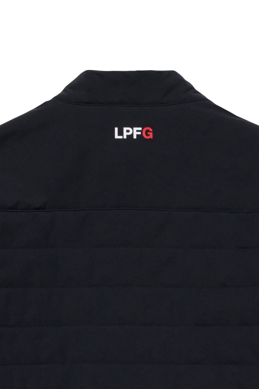 LPFGのメンズ中綿キルティングジャケット。主素材は軽量で寸法安定性と耐久性を兼ね備えた2WAYストレッチの撥水素材。柔軟な伸縮性とソフトな風合いが特徴。脇にはストレッチ性の高いダンボールニットを別布使い。LPFGロゴ、スカル、サークルロゴxスカル等、LPFGのアイコンとなるモチーフがワッペンやプリントで随所に表現されている。