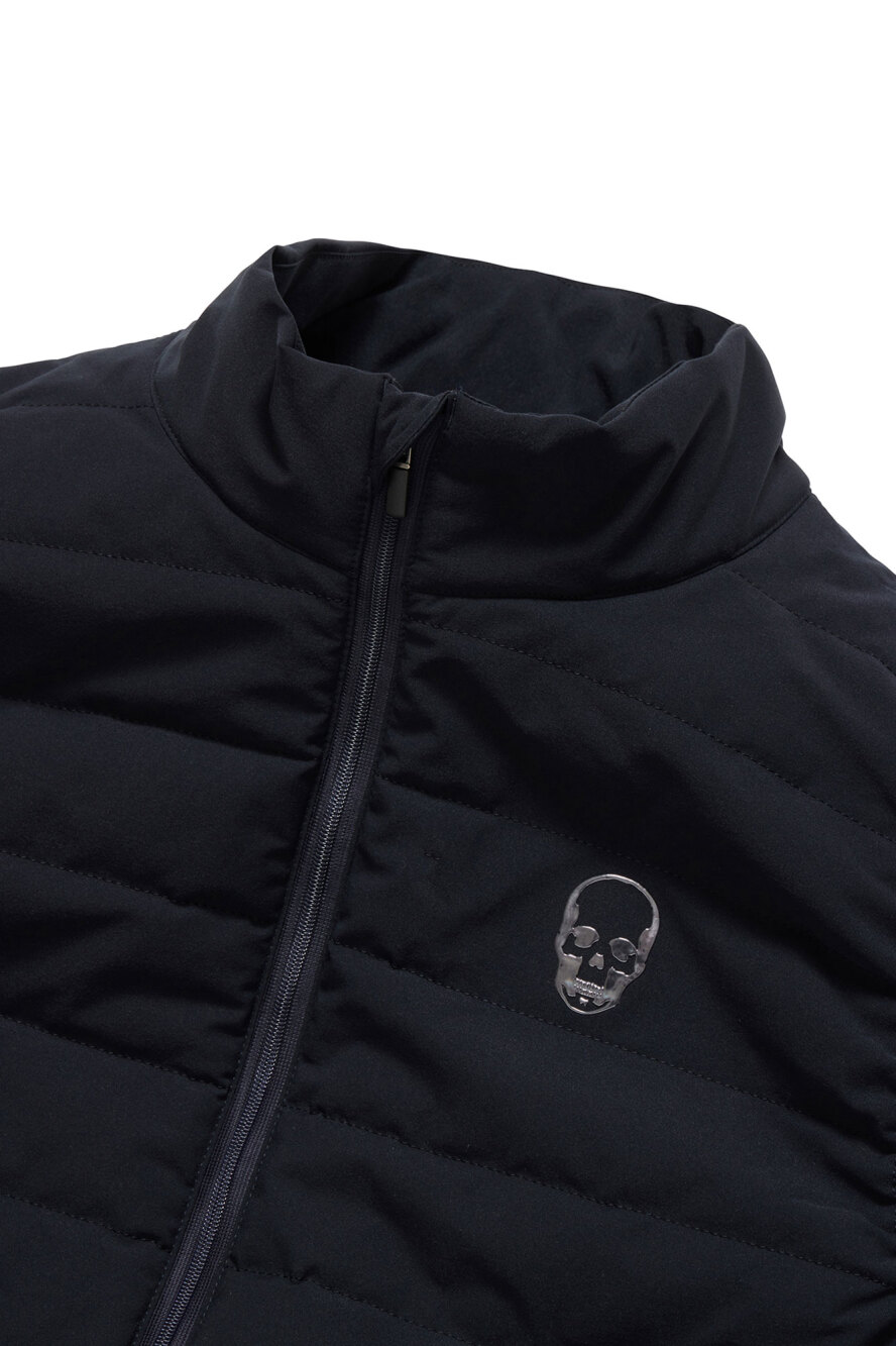 LPFGのメンズ中綿キルティングスタンドカラージップベスト。主素材は軽量で寸法安定性と耐久性を兼ね備えた2WAYストレッチの撥水素材。柔軟な伸縮性とソフトな風合いが特徴。脇にはストレッチ性の高いダンボールニットを別布使い。LPFGロゴ、スカル、サークルロゴxスカル等、LPFGのアイコンとなるモチーフがワッペンやプリントで随所に表現されている。
