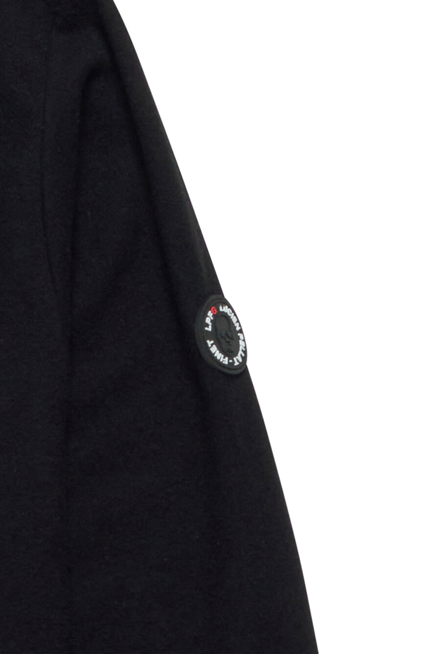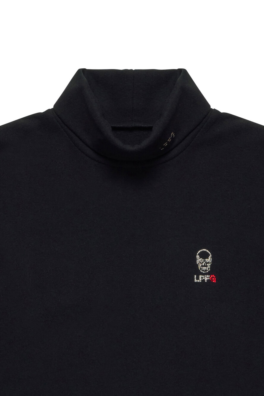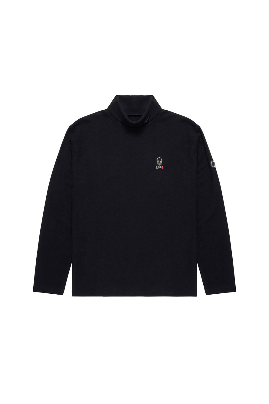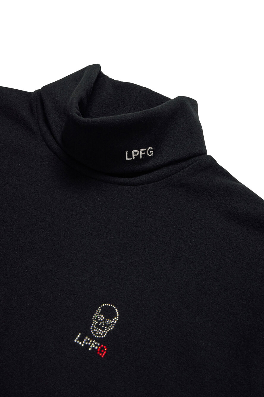 LPFGのメンズウールタートルネックシャツ。ウール100%の天竺素材。薄手で柔らかい肌触りが特徴。左袖にサークルロゴxスカル、タートルネックの折り返し部分にLPFGロゴがワッペンで表現されている。また、左胸にはスカルxLPFGロゴがクリスタルで描かれている。