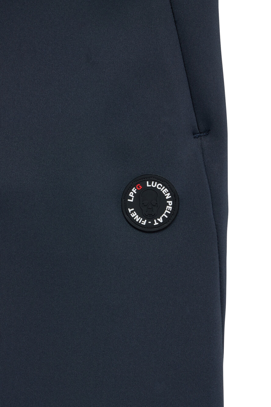 LPFGのメンズジョガーパンツ。全方位へのストレッチ性を持つ超ハイゲージ(40G)のテック素材。エレガントかつ快適な着心地。LPFGロゴ、サークルロゴxスカル等、LPFGのアイコンとなるモチーフがワッペンやプリントで随所に表現されている。