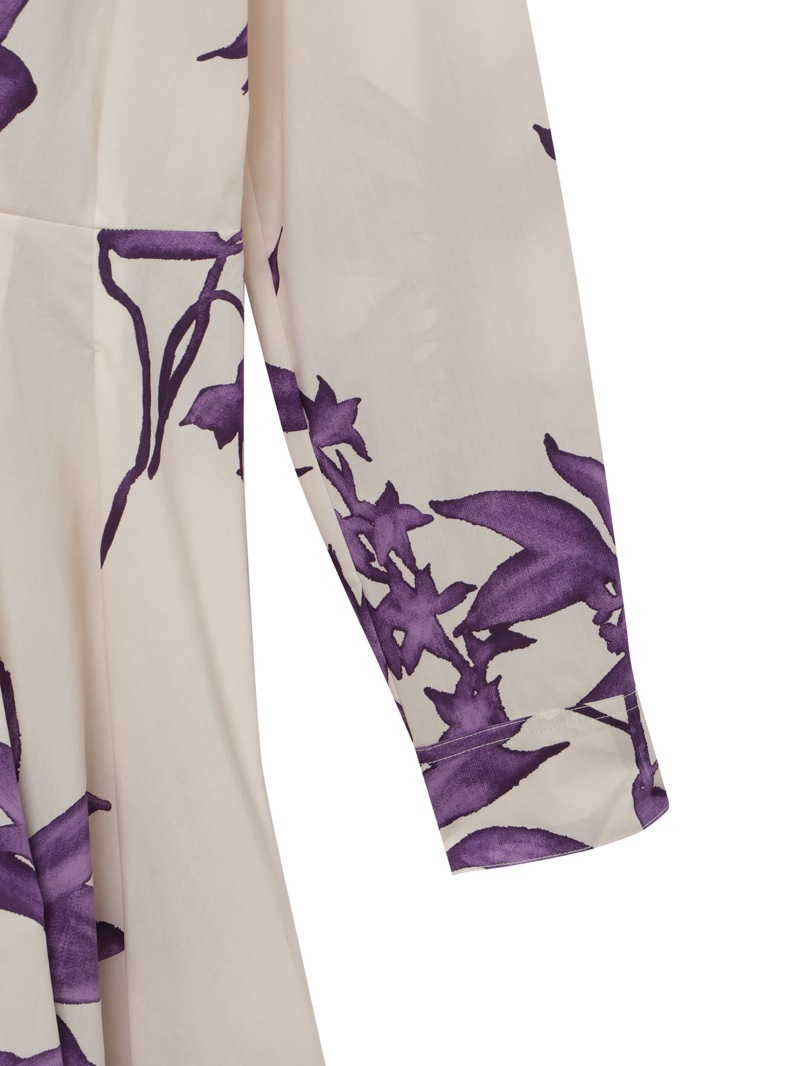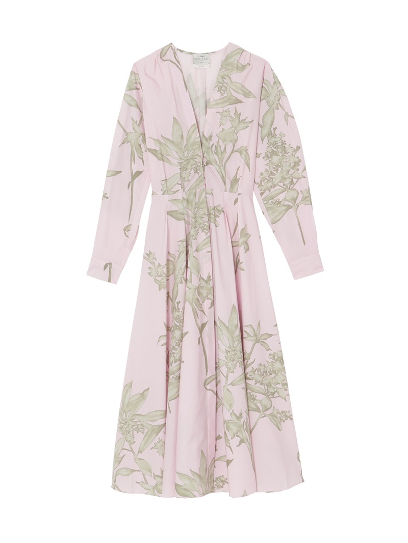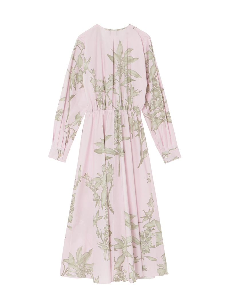 新芽の枝や繊細な花びらを表現した「ハーバリウム」プリントシリーズのシャツドレス。少し深めのVネックカットが女性らしく、ウエストのゴム仕様が腰回りをすっきりと見せてくれます。パウダリーな色合いとハーバリウム柄のコントラストが美しいドレスです。