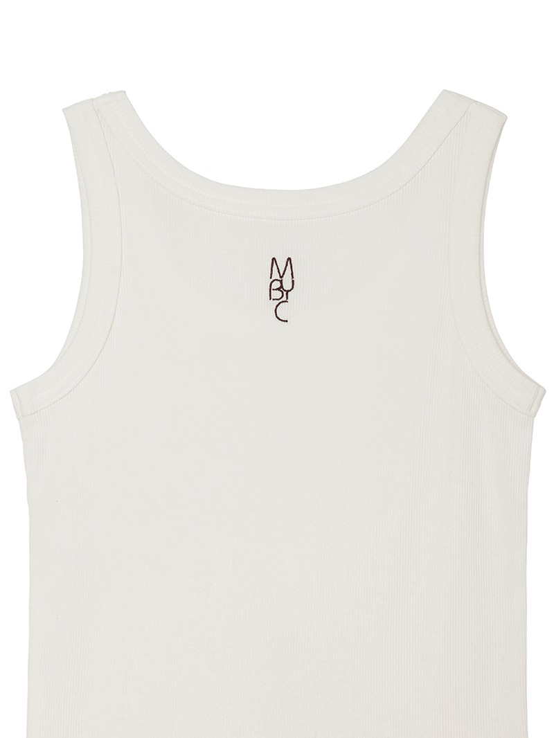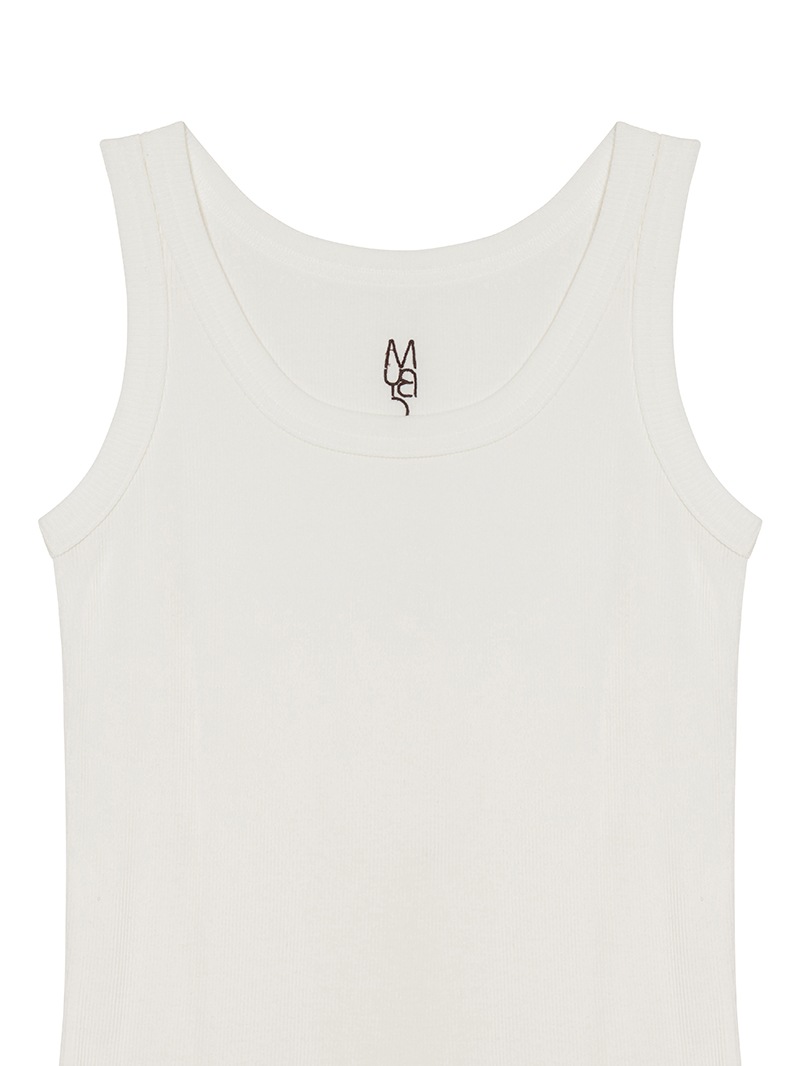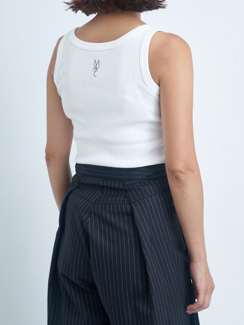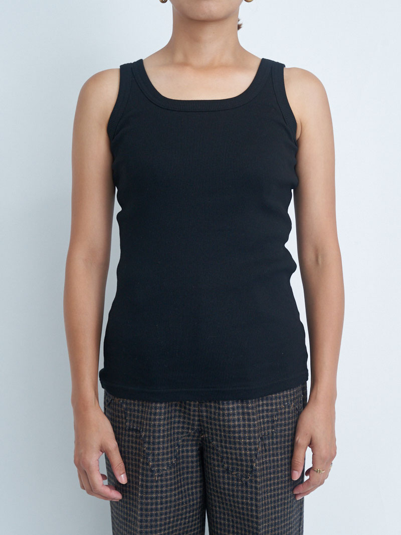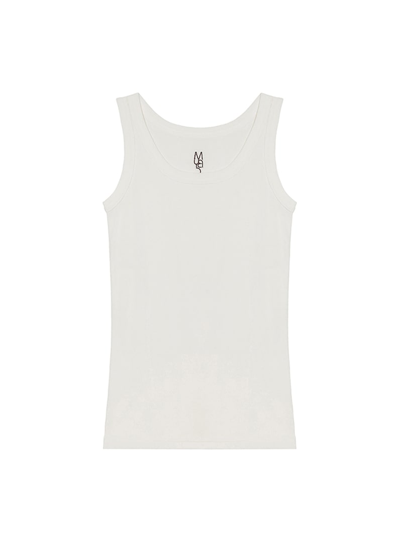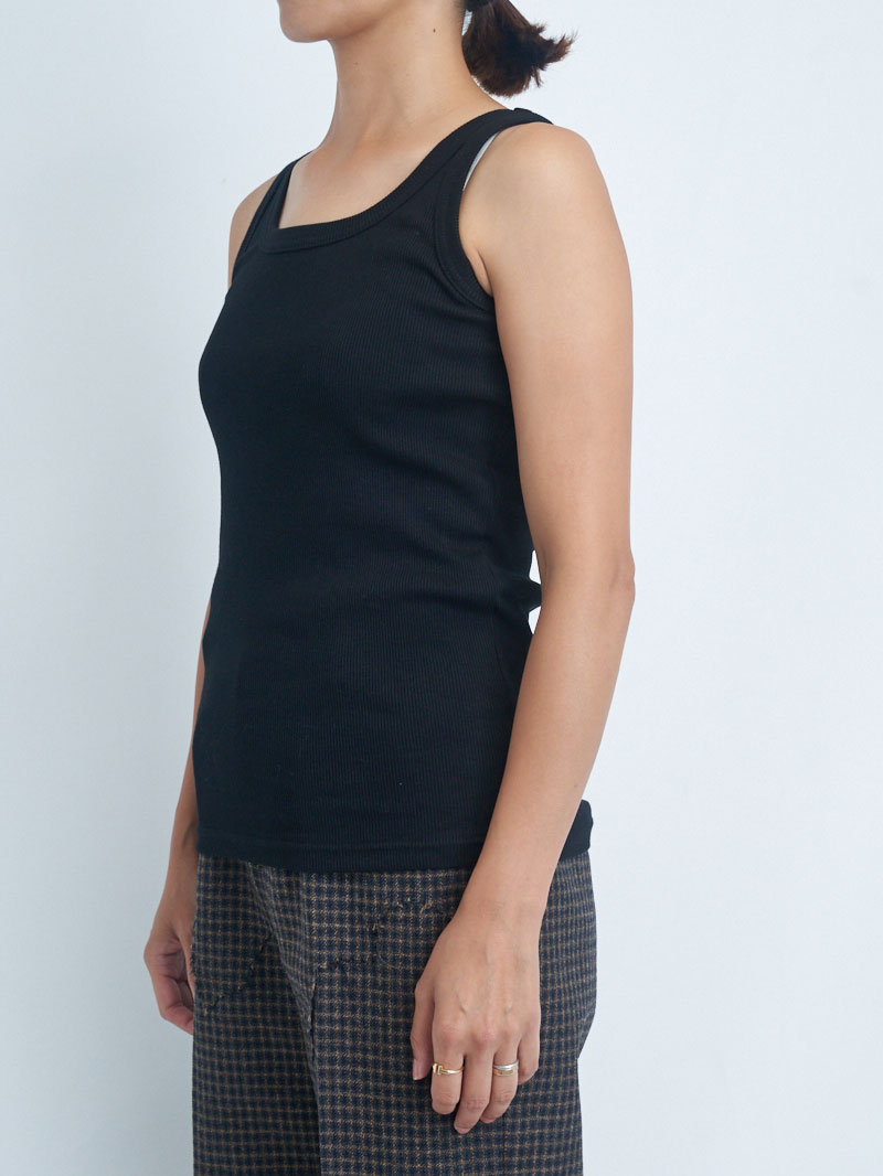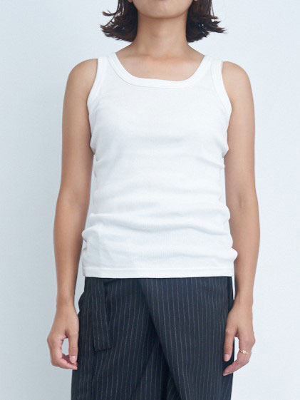 超長綿を使用した品のある光沢が特徴の細リブのタンクトップ。mila schonを象徴するスクエアネックを意識して、程よいネックラインに仕上げています。素材やネックラインに拘った上に、肩幅のピッチも狭めることでカジュアルすぎないタンクトップに。