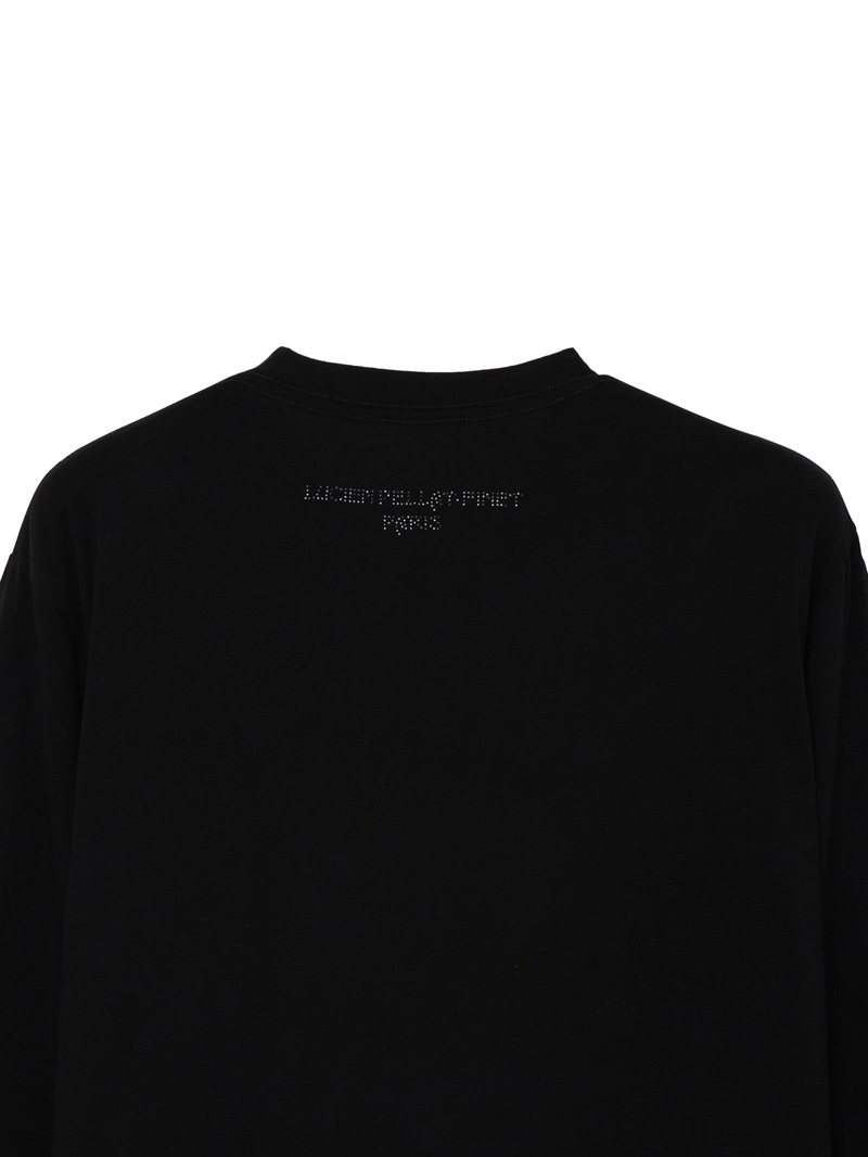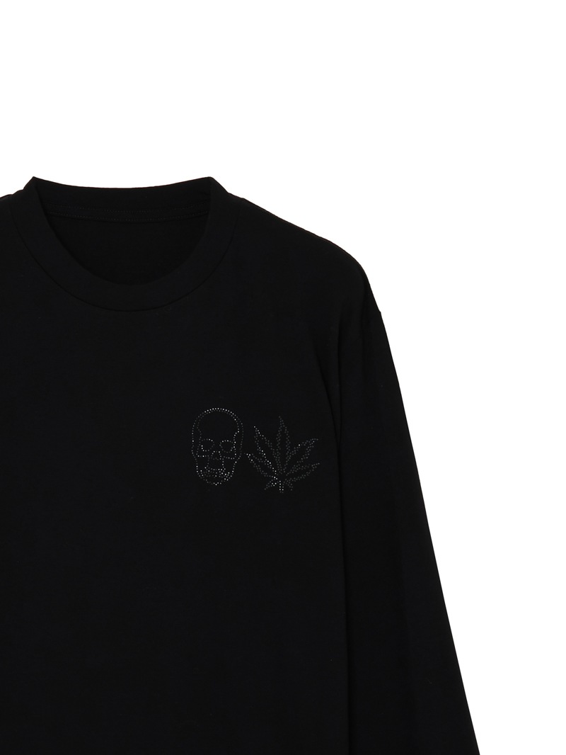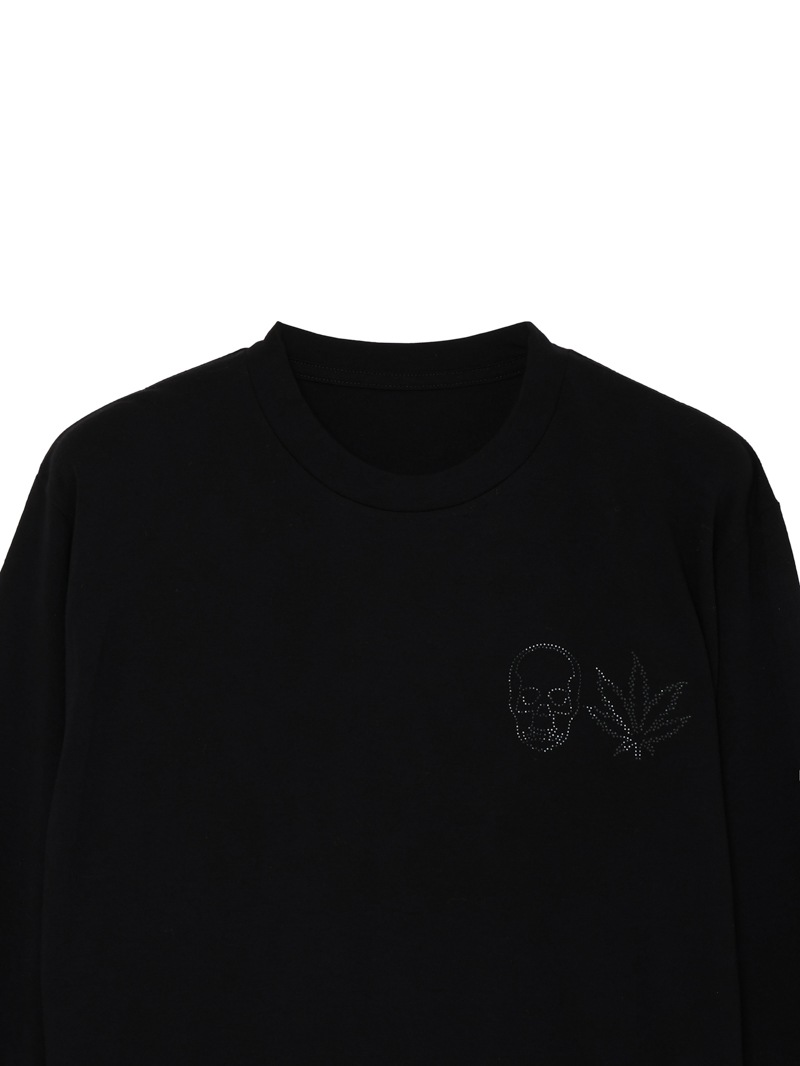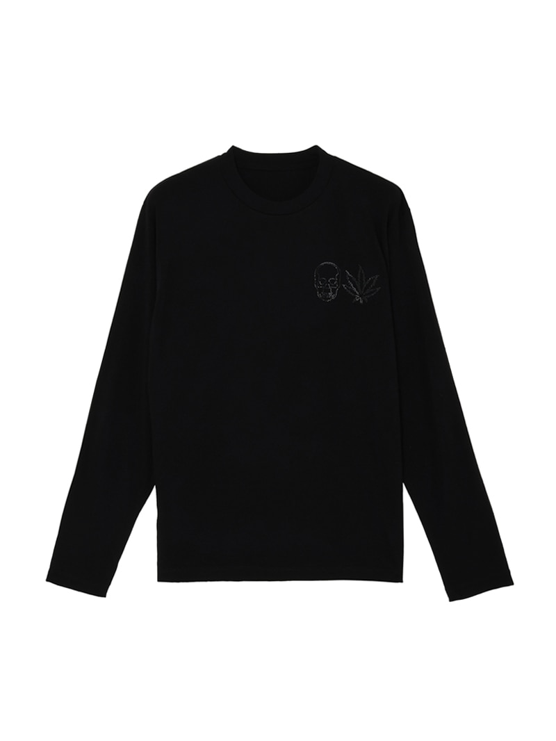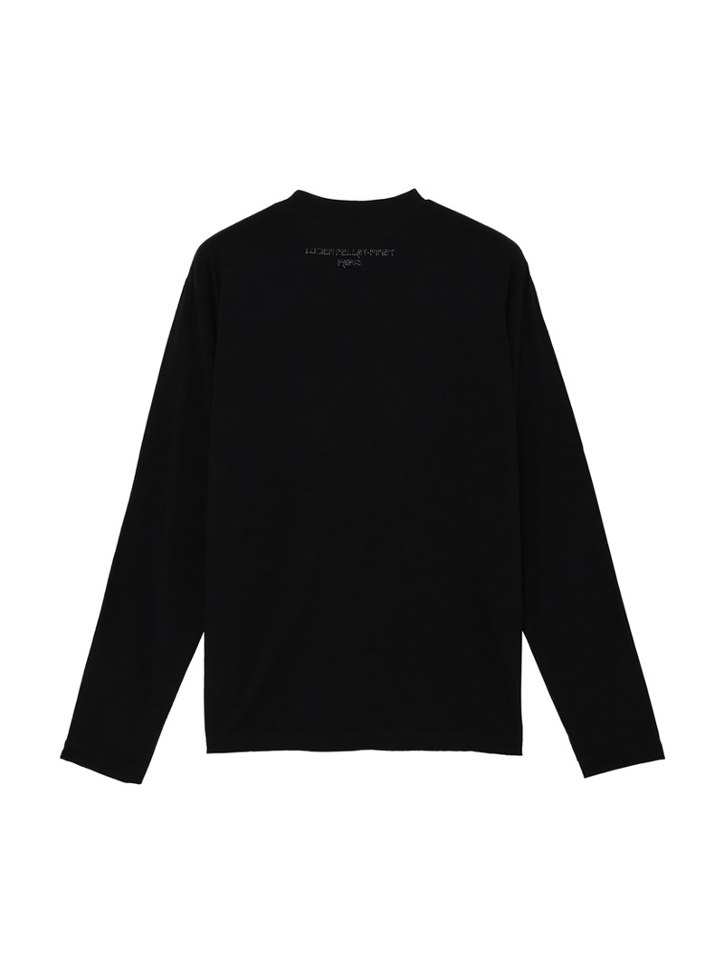 ウール素材の長袖Tシャツ。左胸にスカル&リーフを、首元にlucien pellat-finetロゴをスタッズで配置。糸はウールに綿紡績を施して繊維を整えることで、ウール本来の機能を損なうことなくウール100%でありながらドライなタッチ感と、スラブ感のないスムースな表面感が特徴。程よい光沢感を演出。