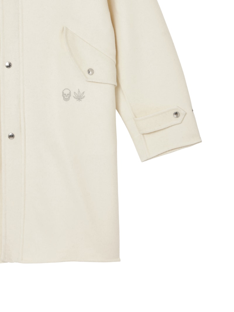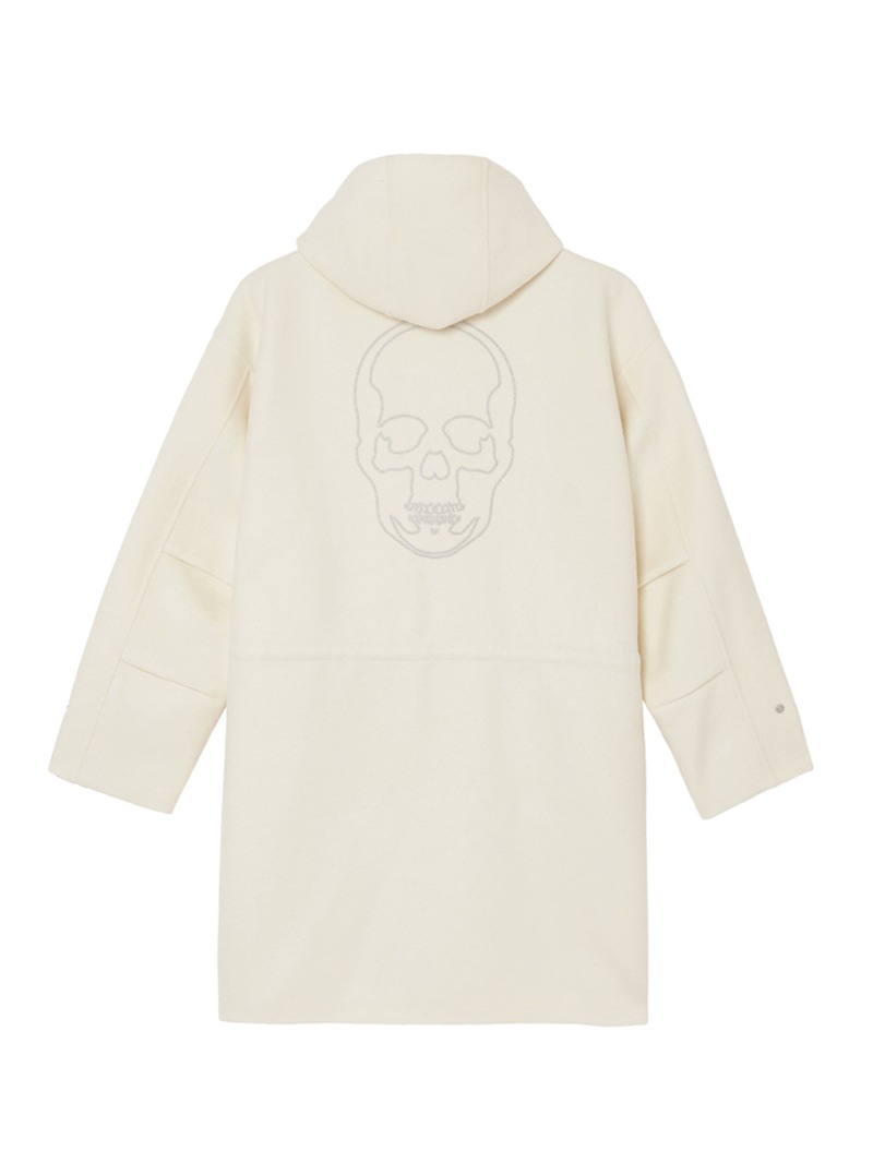 オーバーサイズのコート。程よい丸みのシルエット。バックにはスカル・モチーフを配置。縦横ともに1/16のSUPER120?S原料を使用することで素材自体の上質さを向上し、しなやかさ・光沢をより追及したリバーシブル素材。またシャルム加工を施す事で優雅な光沢・肌触りが永く続き毛羽?が揃い、毛羽セットに優れている為、着用時の毛乱れを少なく抑えることができる。高密度起毛加工の為、柔らかさ・ドレープ性・ふくらみ感を充分に活かした素材。*シャルム加工--- 獣毛素材の本質を最大限に表現した優雅な艶を持つ高級起毛加工。