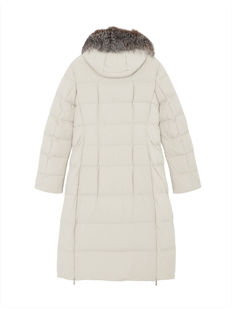 撥水効果を備えたAcquaライン(耐水レベル1)よりお届けする、スポーティーなシルエットのグースダウンコート。撥水性のあるストレッチ生地を使用し、取り外し可能なフードはフロスト調のフォックスファーで飾られています。