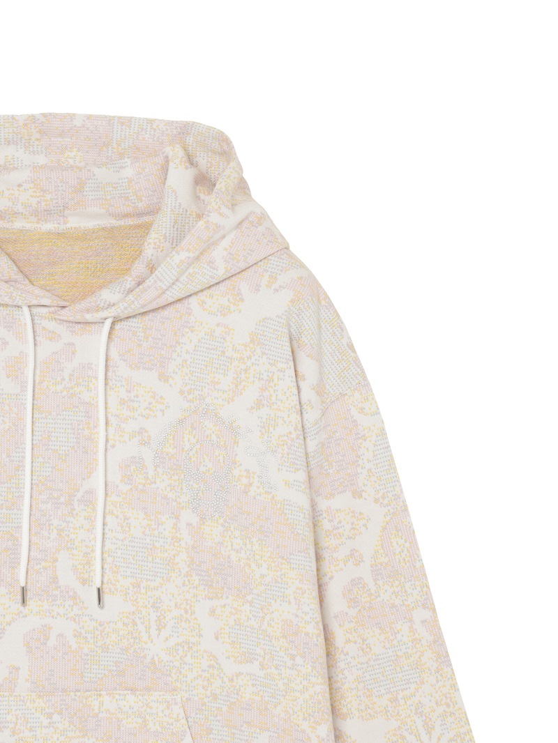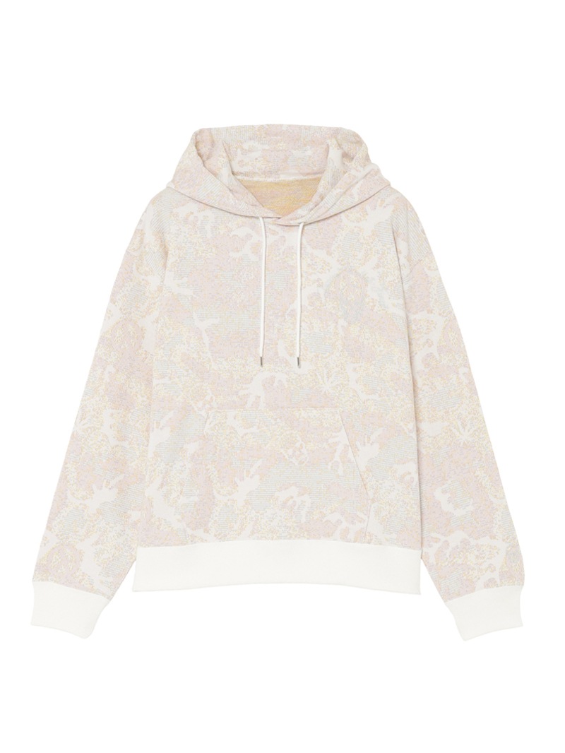 特殊な編み機を使用しスカル・リーフ・ピース&カモフラージュ柄を表現した素材のフーディ―。左胸にスカル&LPFロゴを配置し、背中にはアウトラインスカルをデザイン。ループ面の太番を表に出すことでグランドの細かい目との差で凹凸感がでて、立体的に表現。裏糸で柄を表現する特殊な組織を実現したもの。爽やかなカラーリングのカモフラージュ柄。