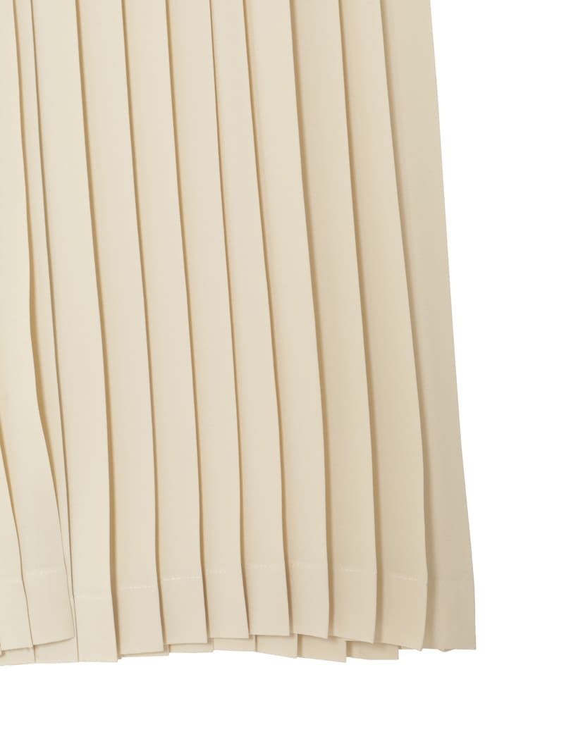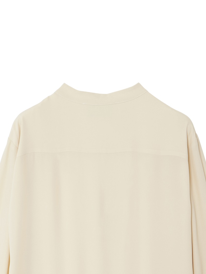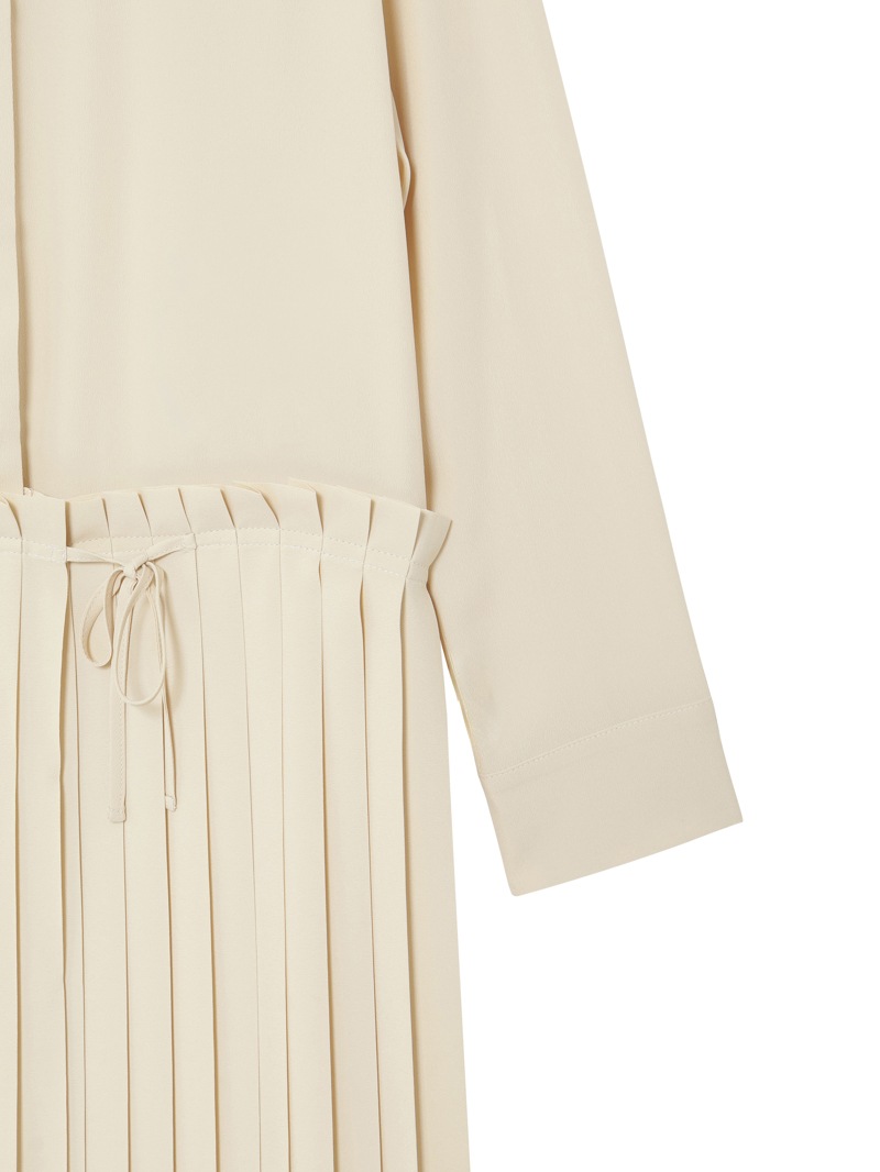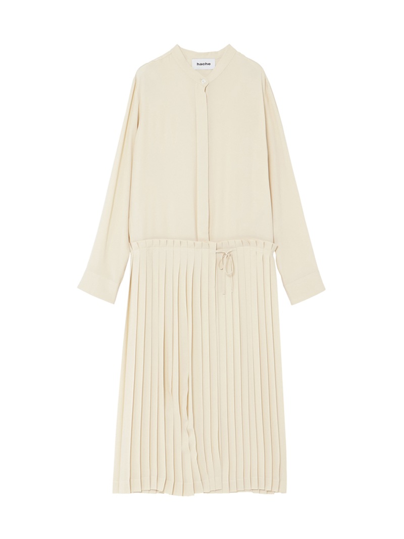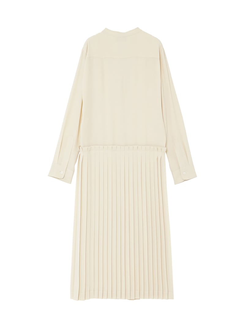 クリーンなノーカラーワンピース。落ち感のある素材で、腰下で切り替えられたプリーツがドレッシーな印象。スカート部分はサロン型になっておりレイヤードが楽しめます。