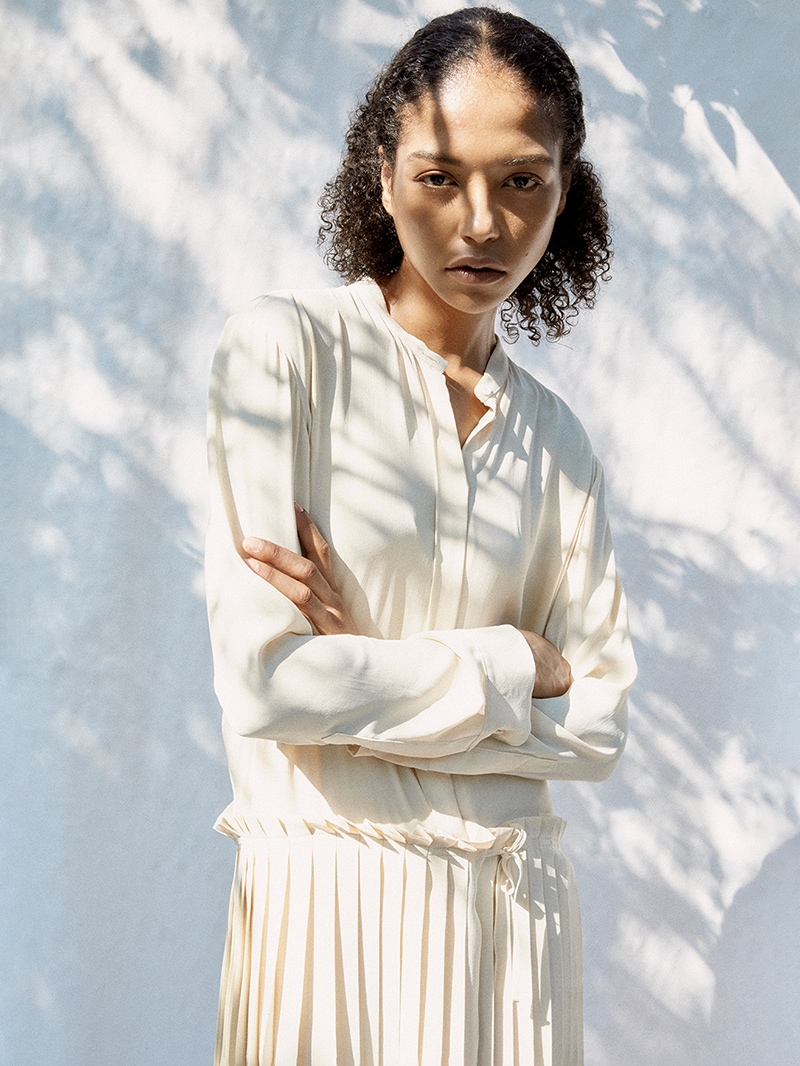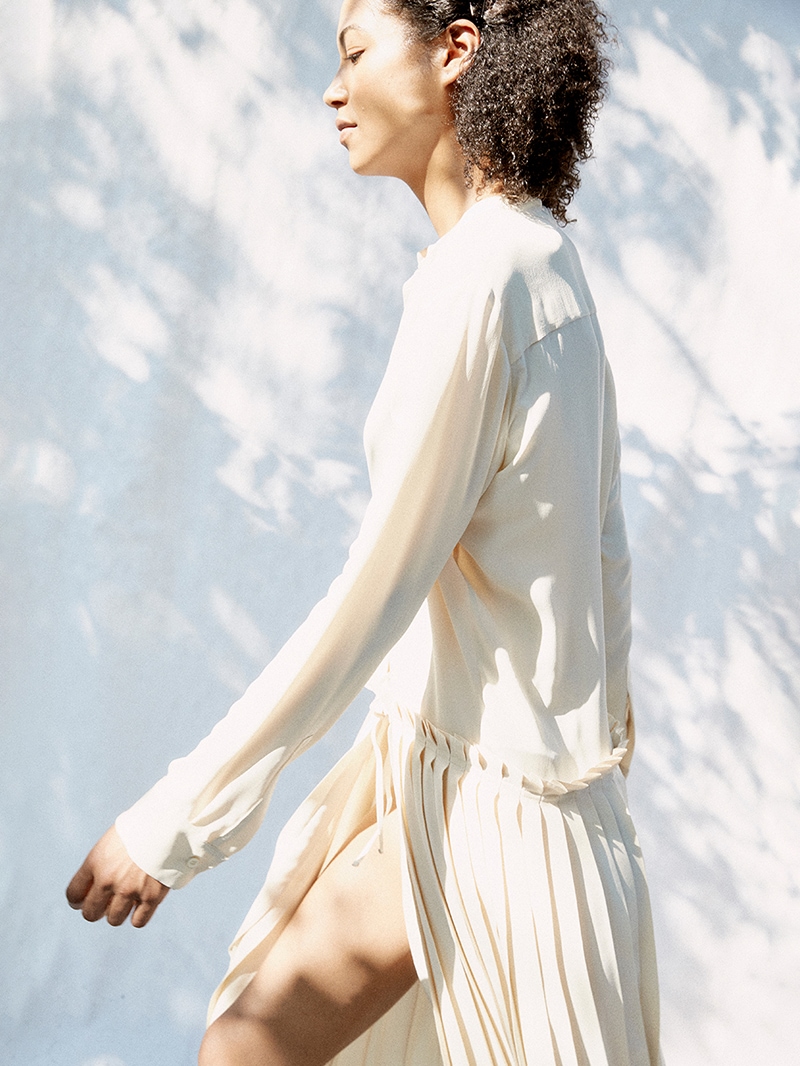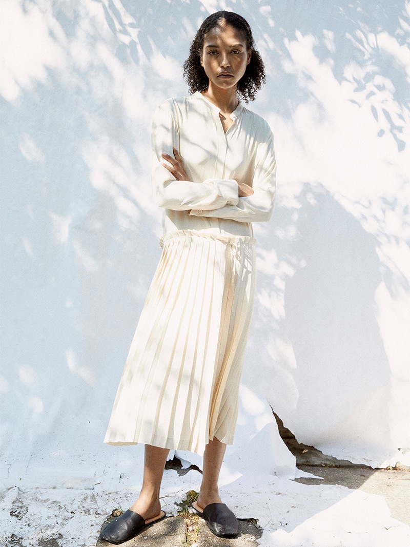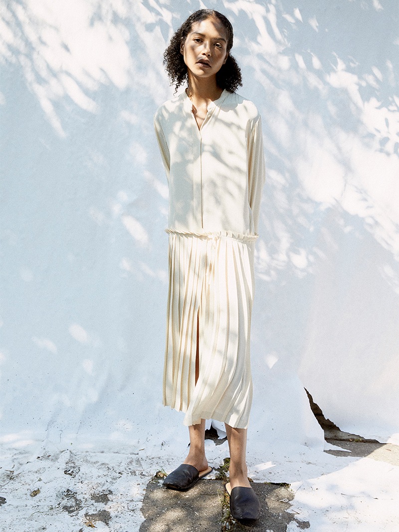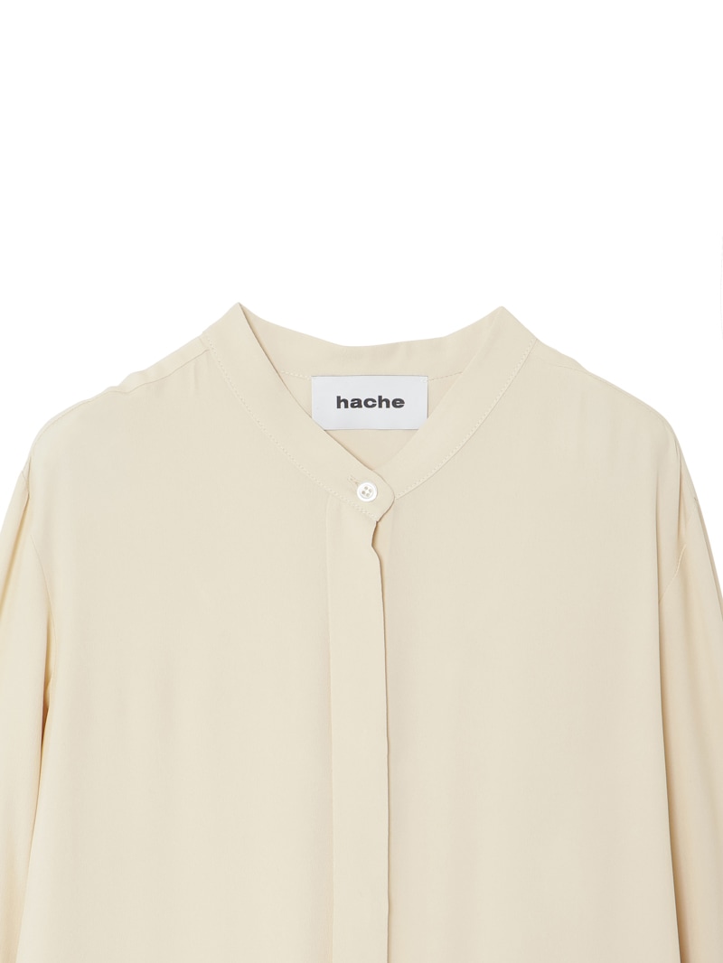 クリーンなノーカラーワンピース。落ち感のある素材で、腰下で切り替えられたプリーツがドレッシーな印象。スカート部分はサロン型になっておりレイヤードが楽しめます。