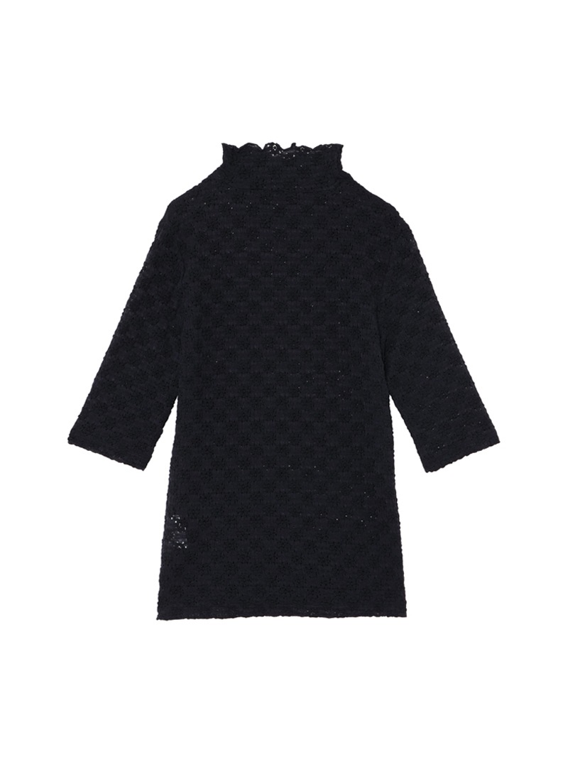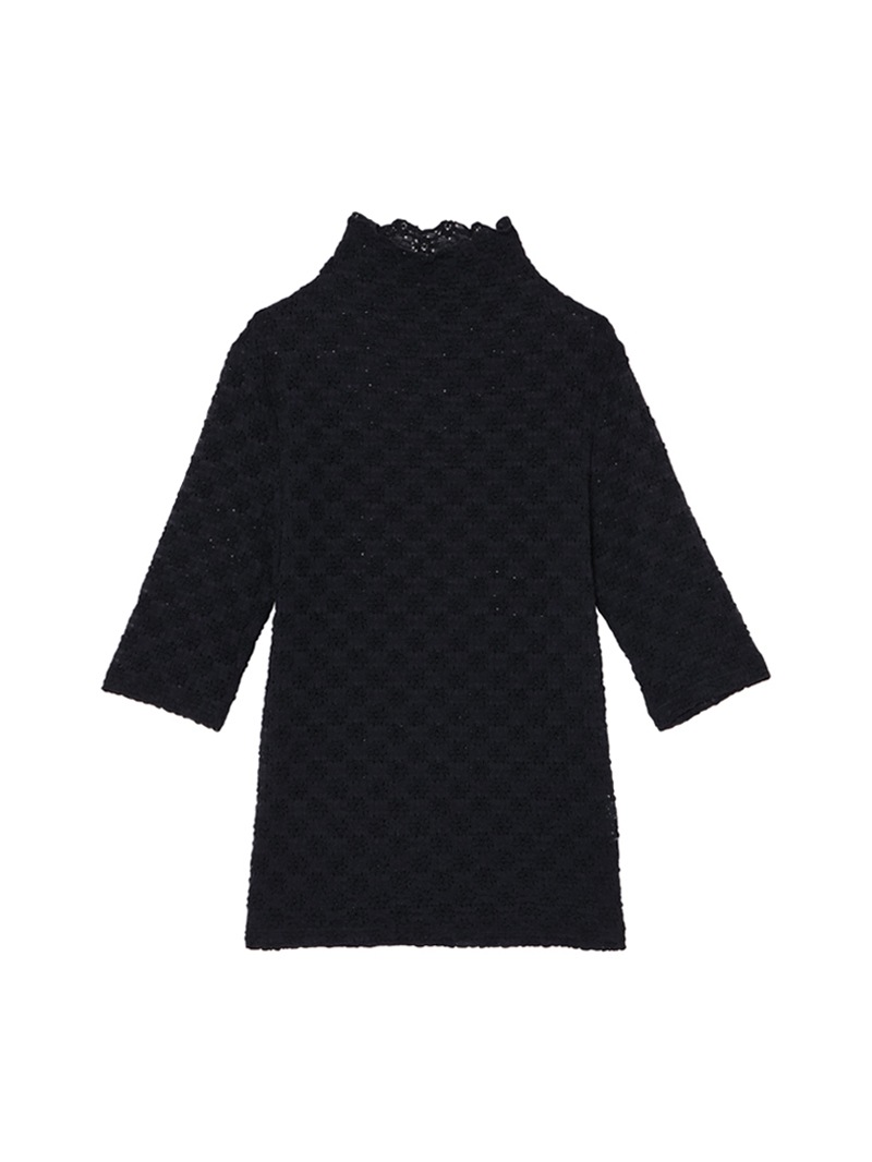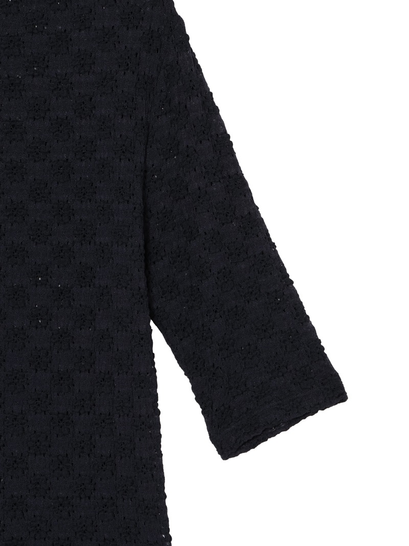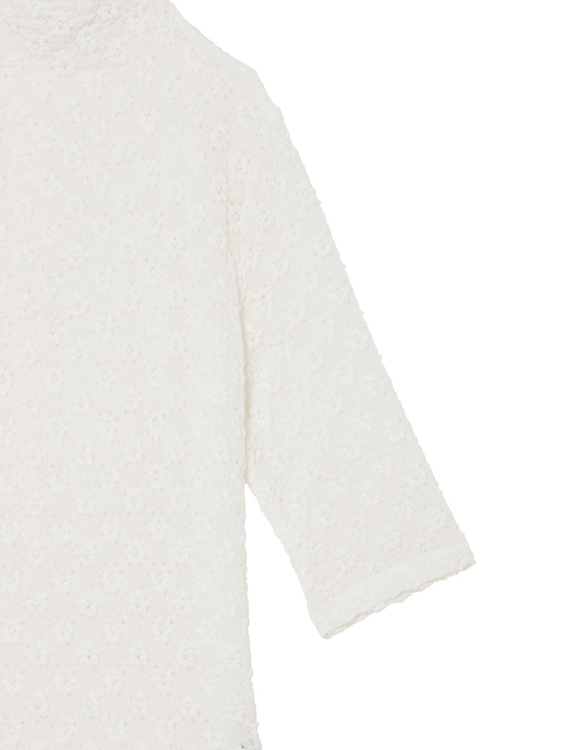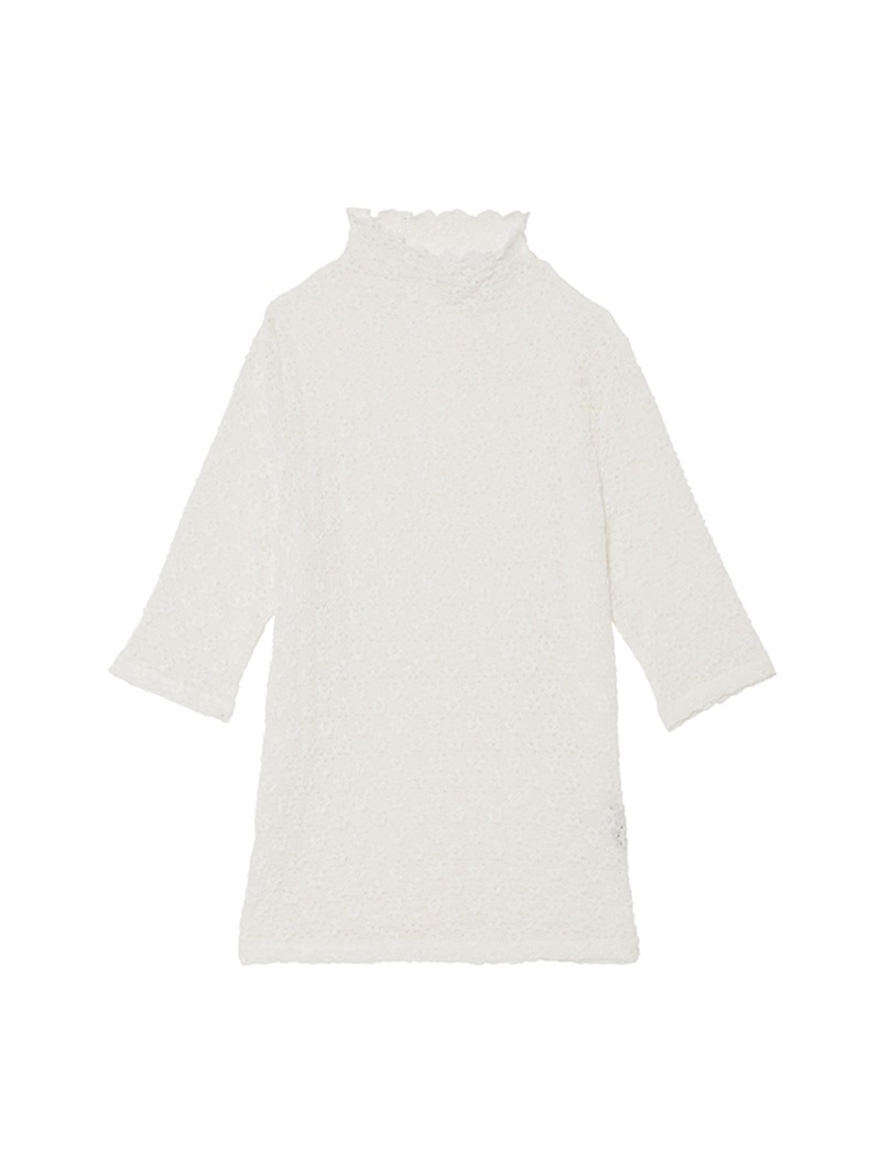 ハイストレッチのシャーリングレースを使用したカットソーです。綿混のソフトなタッチが肌心地の良い一枚。五分袖でジャケットやカーディガンのインナーとしても活躍します。
