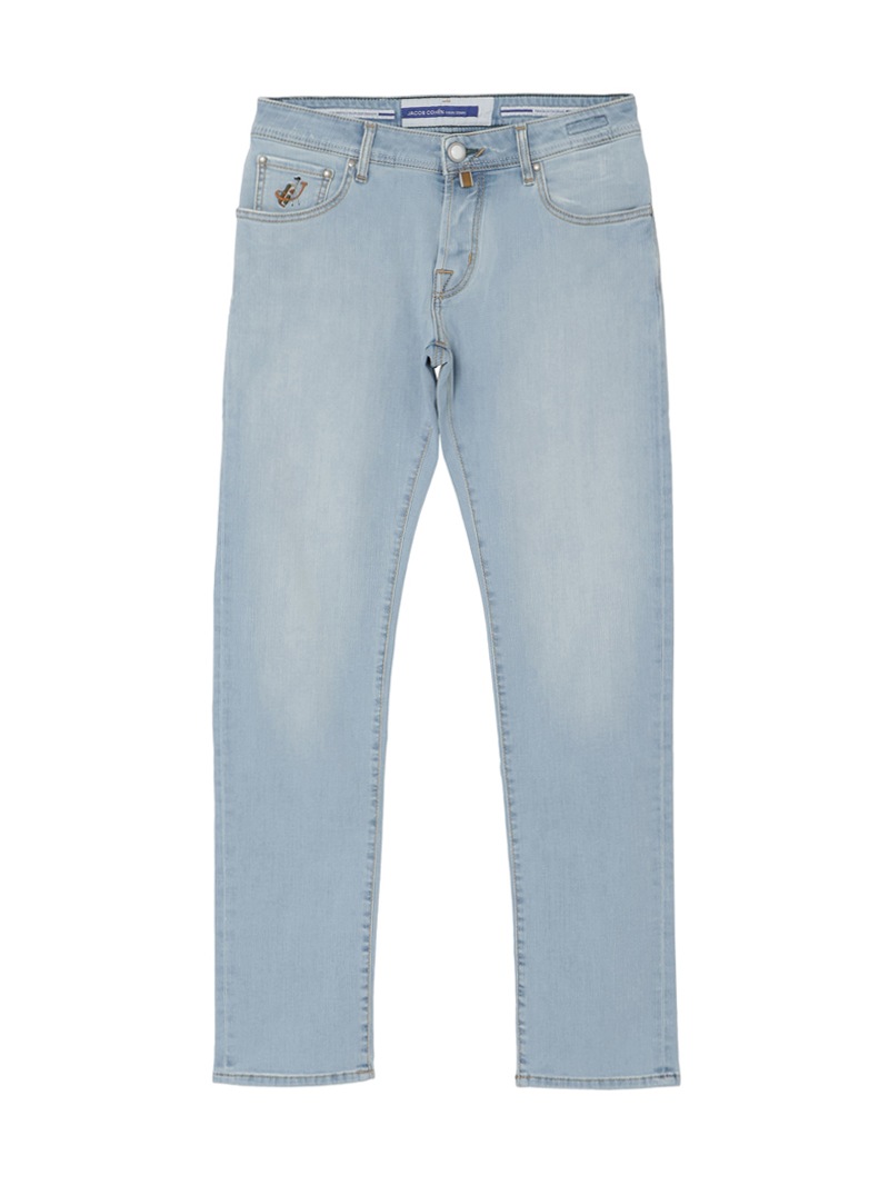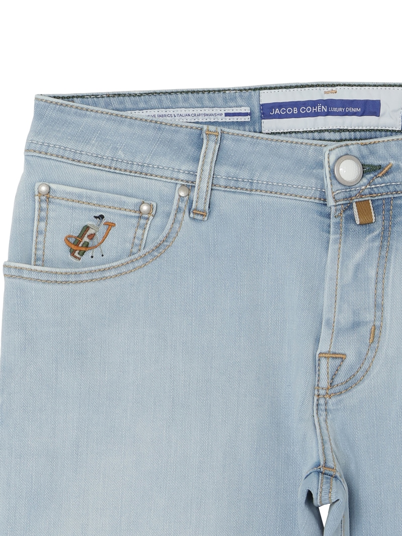 ブランドの中で1、2を争う人気モデル"NICK"のスポーツカプセルコレクションアイテム。時代に左右されないスリムフィット、ローライズのシルエットはJACOB COHENを代表する一本。10オンスのスーパーストレッチデニムにブリーチウォッシュ、ウィスカー(ヒゲ)加工を重ねた、柔らかな質感と上質なヴィンテージ感。バックパッチは被毛を残したカーフヘアレザーをベースに、ゴルフクラブのグラフィックとブランドロゴをあしらったカプセルコレクションラベル。コインポケットの刺繍と付属のバンダナ、タックボタンにもゴルフモチーフが描かれる。